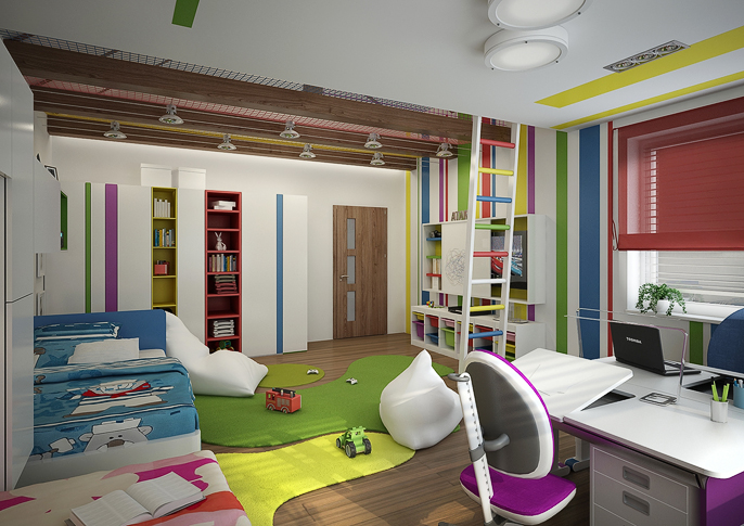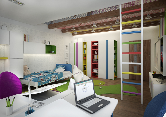 Barevný interiér dětského pokoje s hracím patrem