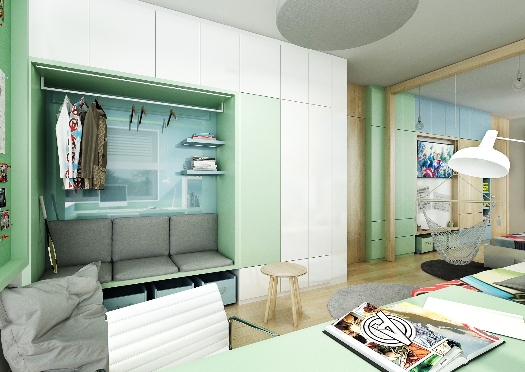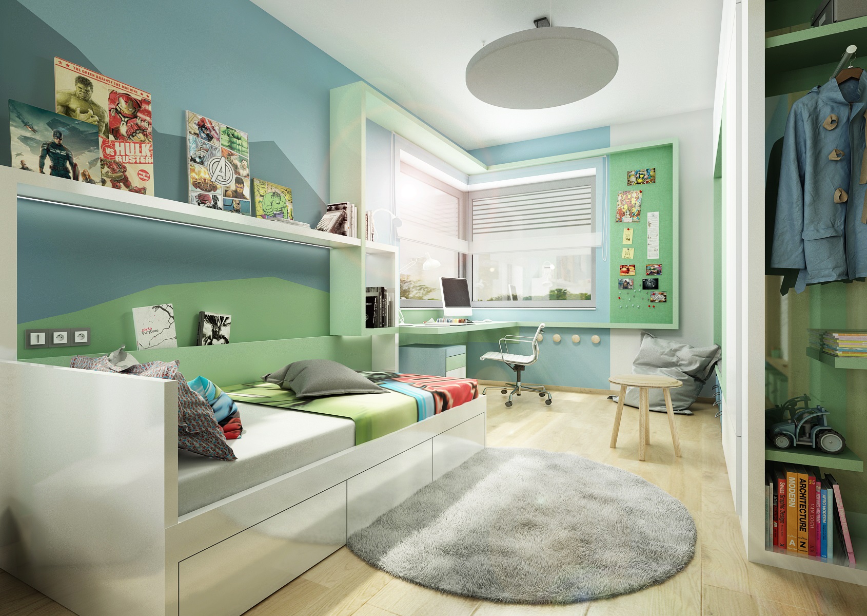 V projektu byly původně dva pokoje, ale na přání dětí zůstaly jako jeden. Společný dětský pokoj pro dva kluky. Každý má své království, ale přitom jsou spolu. Originálním prvkem jsou nábytkové rámy kolem oken, postelí, nástěnek, atd. Vzájemně se prolínají a vytváří tak pracovní, úložný i odkládací prostor.