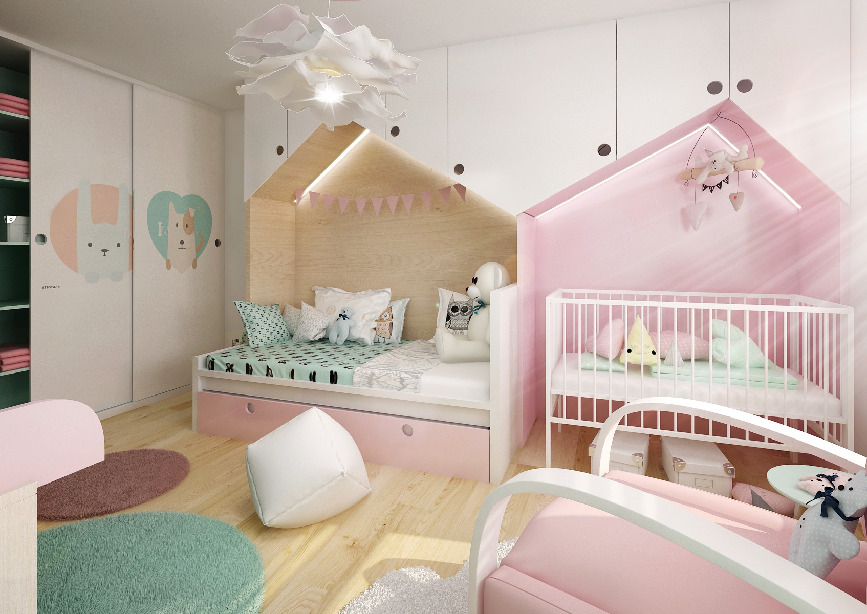 Mintovo-růžový miminkovský pokojíček pro holčičku. Úložný prostor nad postýlkami má tvar stříšek a vytváří se tak jak funkční, tak i hravé estetické řešení. Podobně laděný pokojík najdete zde.