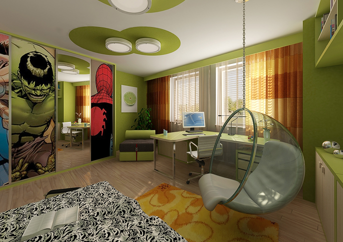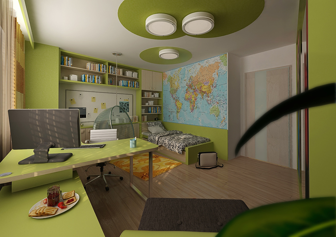 Světle zelená barva s javorovou dýhou povzbuzuje a vnáší do interiéru energii a lehkost, kruhové motivy na stropě a zaoblené rohy pokoj oživují. Zavěšené křeslo je ústředním prvkem interiéru, jehož styl je vhodný zvláště pro malé milovníky přírody.