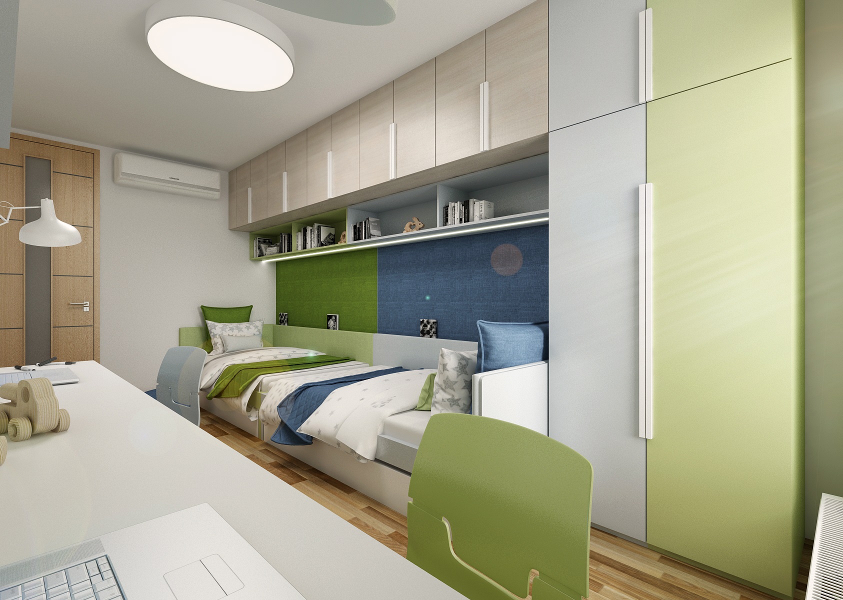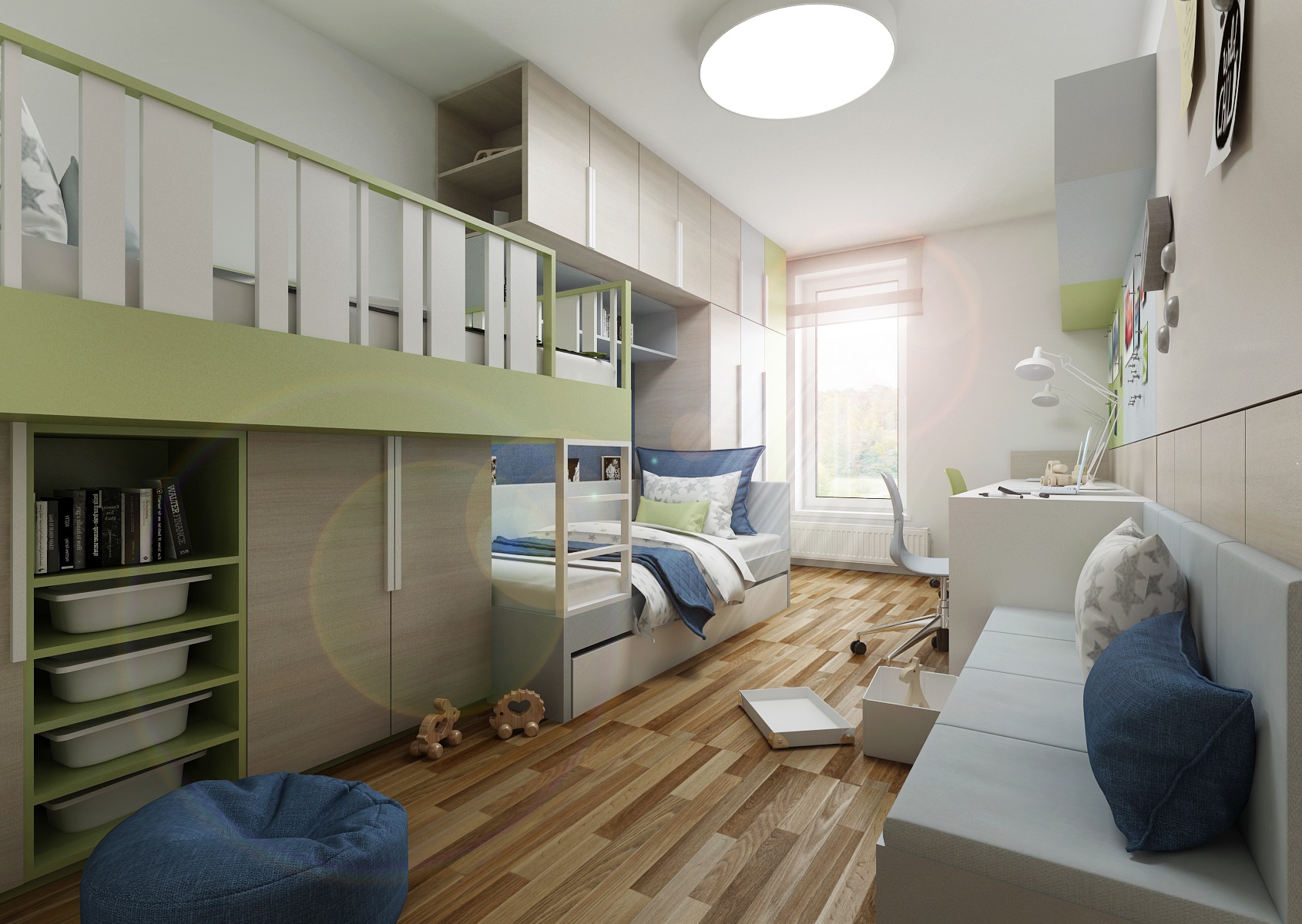 Zeleno-modrý pokojíček pro dva brášky se dvěma řešení návrhu postelí.