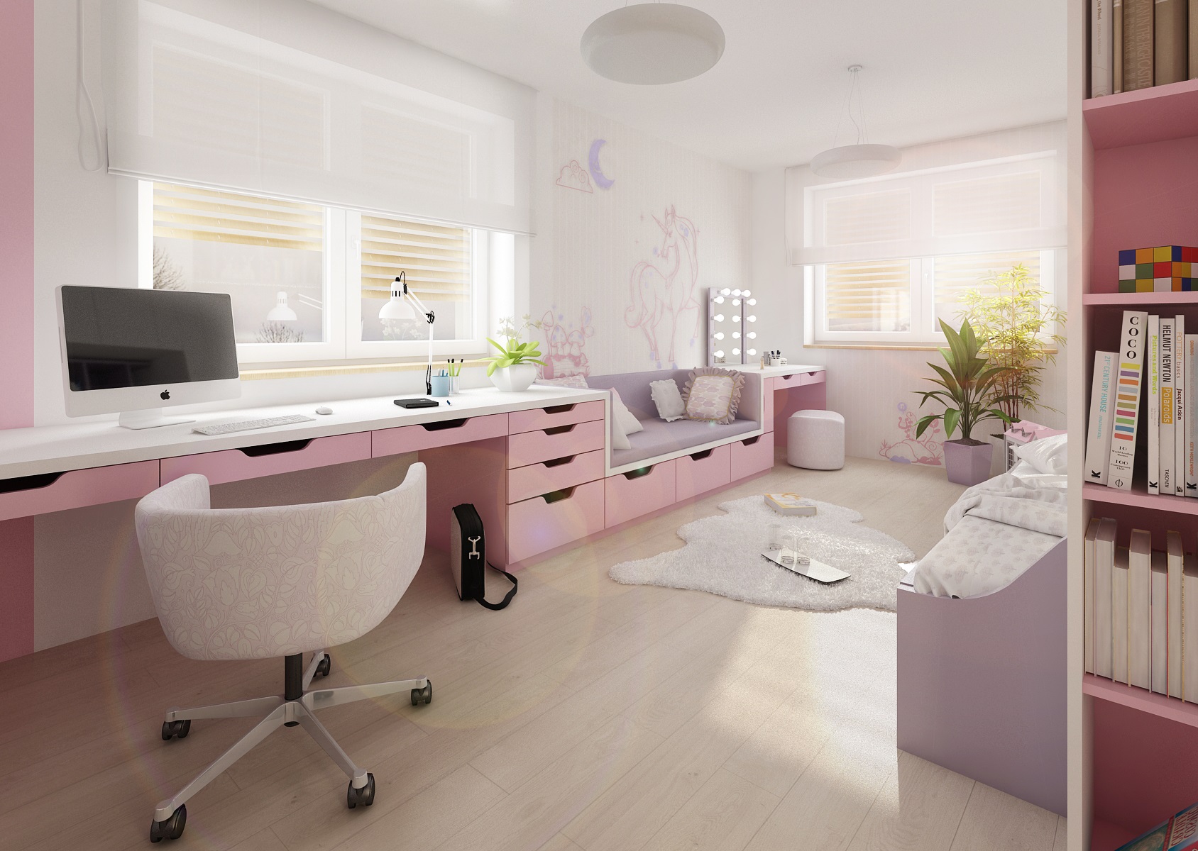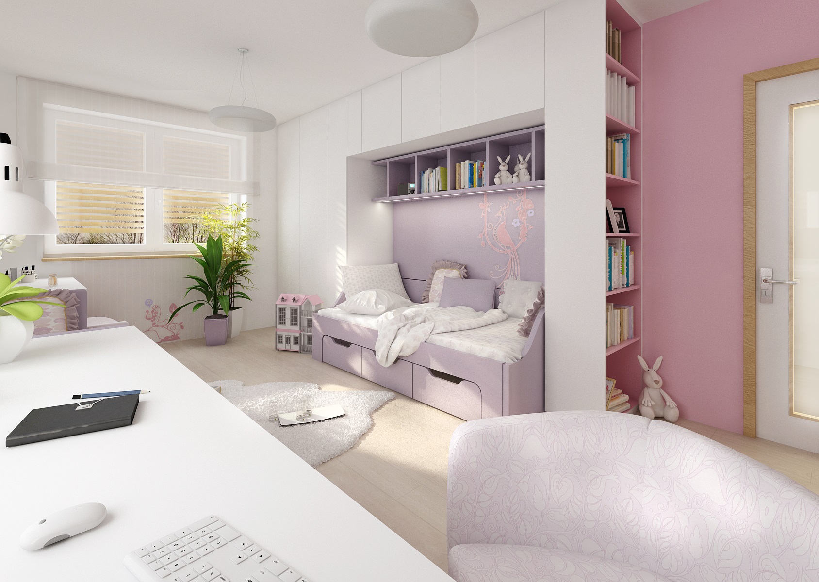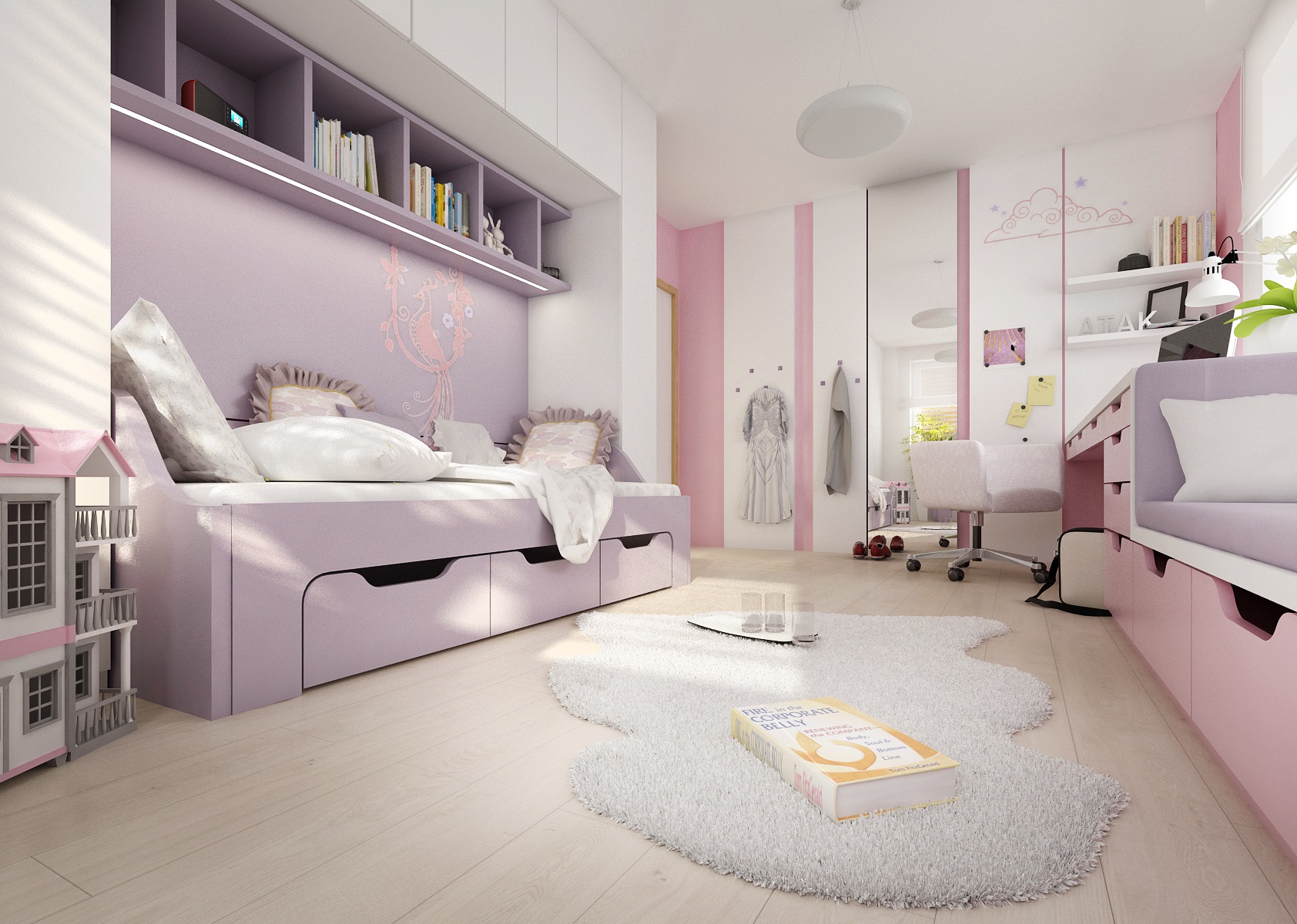 Pohádkový dívčí pokojíček v kombinace bílé s pastelově růžovou a fialovou barvou. Pohádkovou atmosféru můžeme vytvořit použitím dekorativních fantasy samolepek na zeď od firmy E-Glue. Je libo jednorožce, vílu, nebo jinou kouzelnou postavičku? Výběr je veliký.