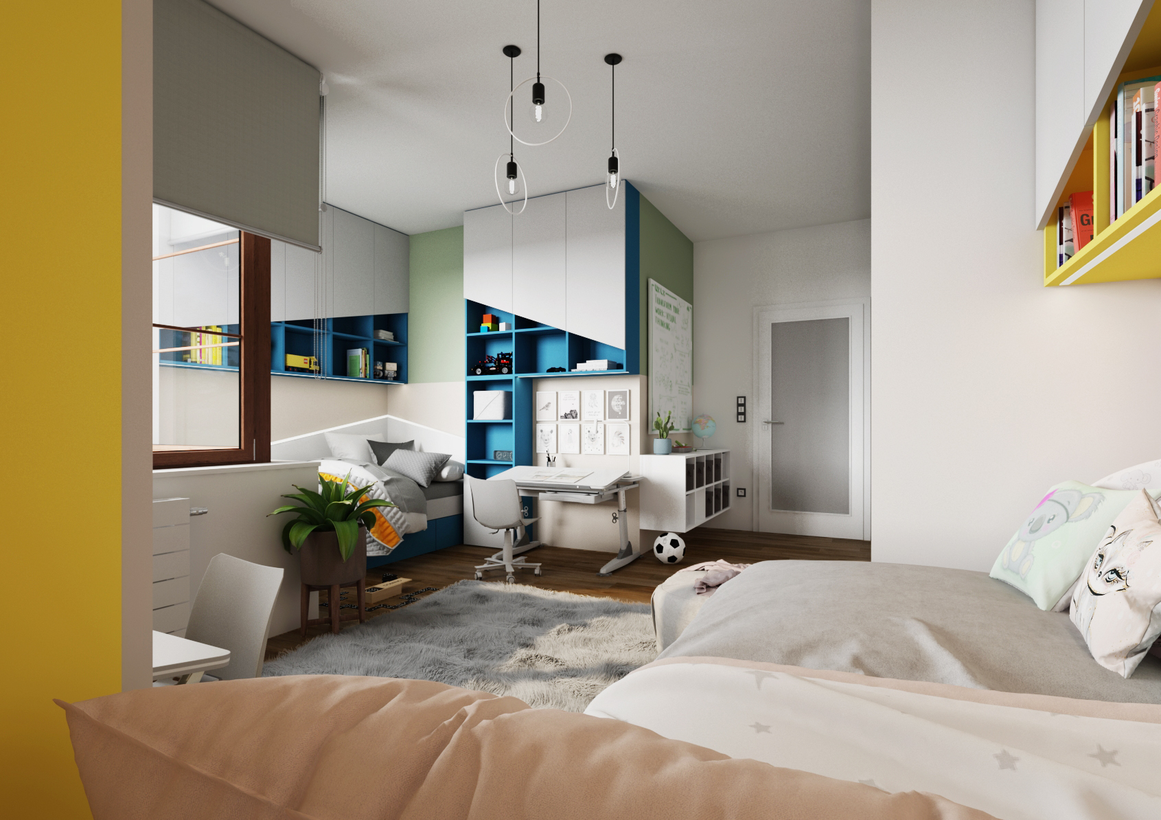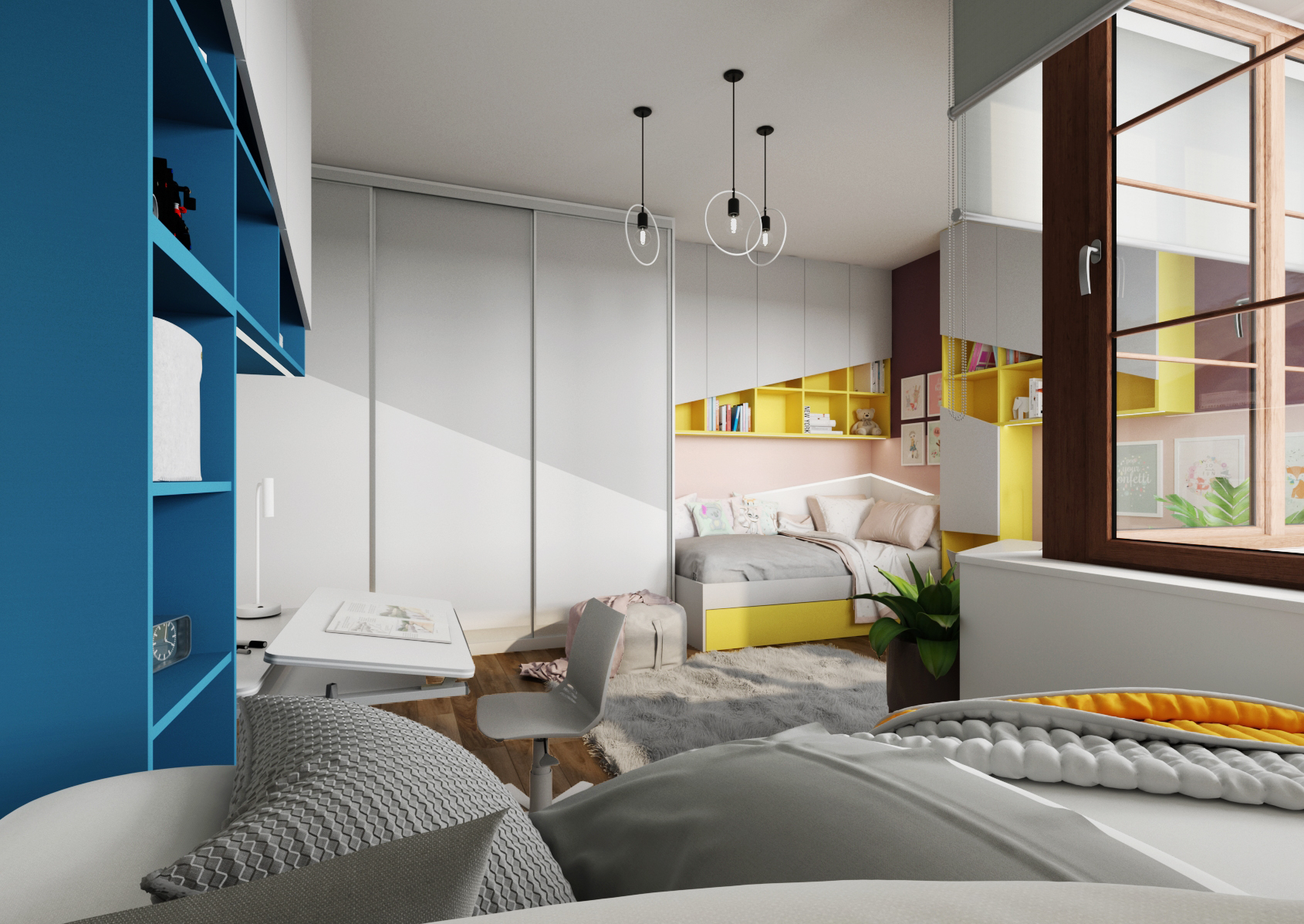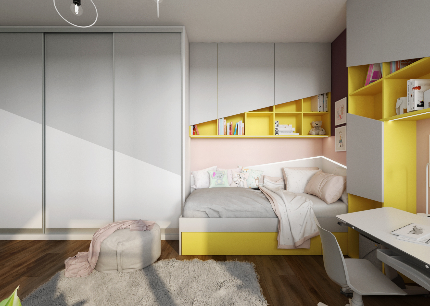 Každý z dětí má svůj vlastní psací stůl, který má nastavitelnou pracovní plochu i výšku noh. Ten je umístěn po straně postele. Části pokoje a zóny jsou odlišeny výraznými barvami – v případě slečny se jedná o kombinaci fialové a žluté barvy, naopak u chlapce byly zvoleny odstíny zelené a modré.