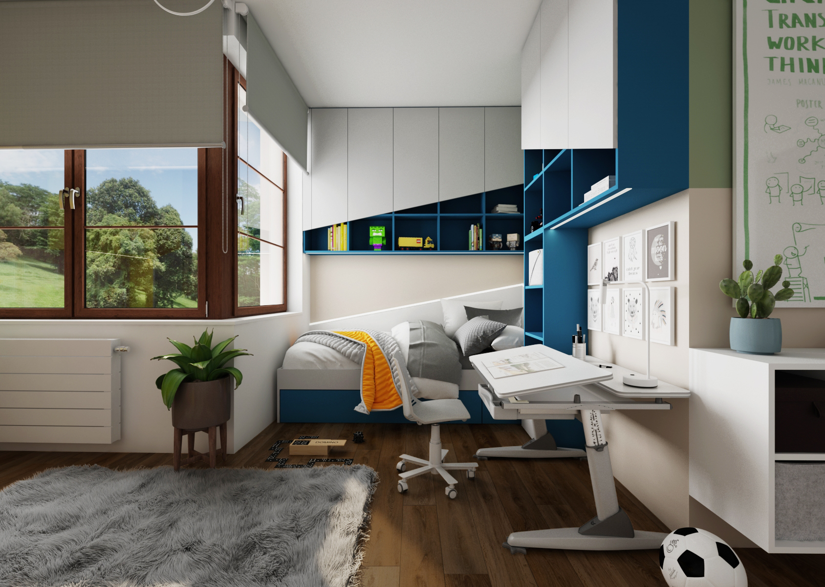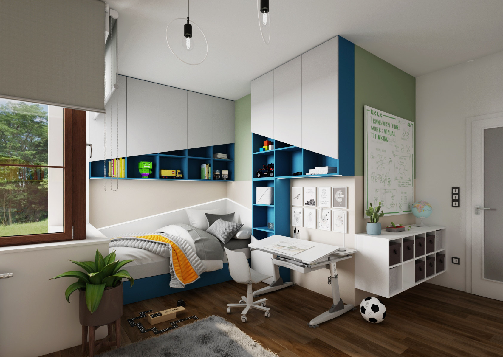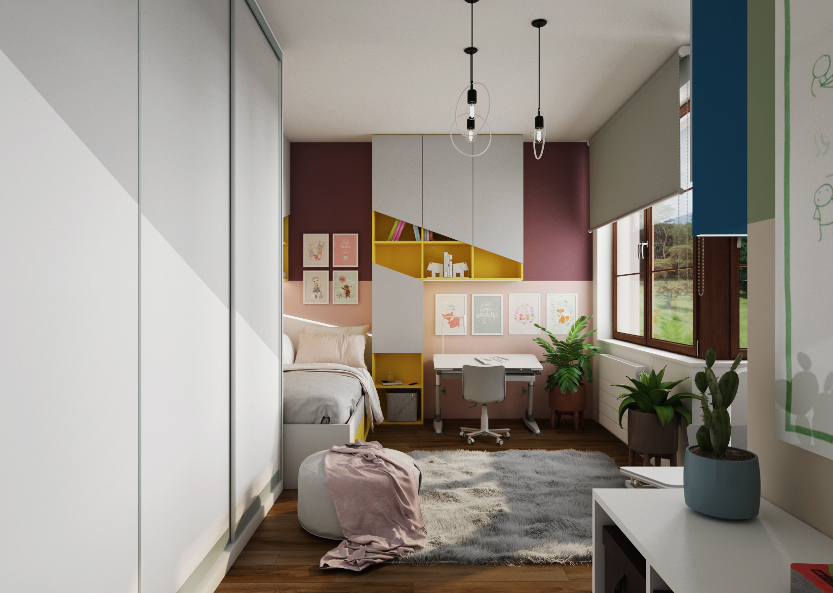 Každý z dětí má svůj vlastní psací stůl, který má nastavitelnou pracovní plochu i výšku noh. Ten je umístěn po straně postele. Části pokoje a zóny jsou odlišeny výraznými barvami – v případě slečny se jedná o kombinaci fialové a žluté barvy, naopak u chlapce byly zvoleny odstíny zelené a modré.