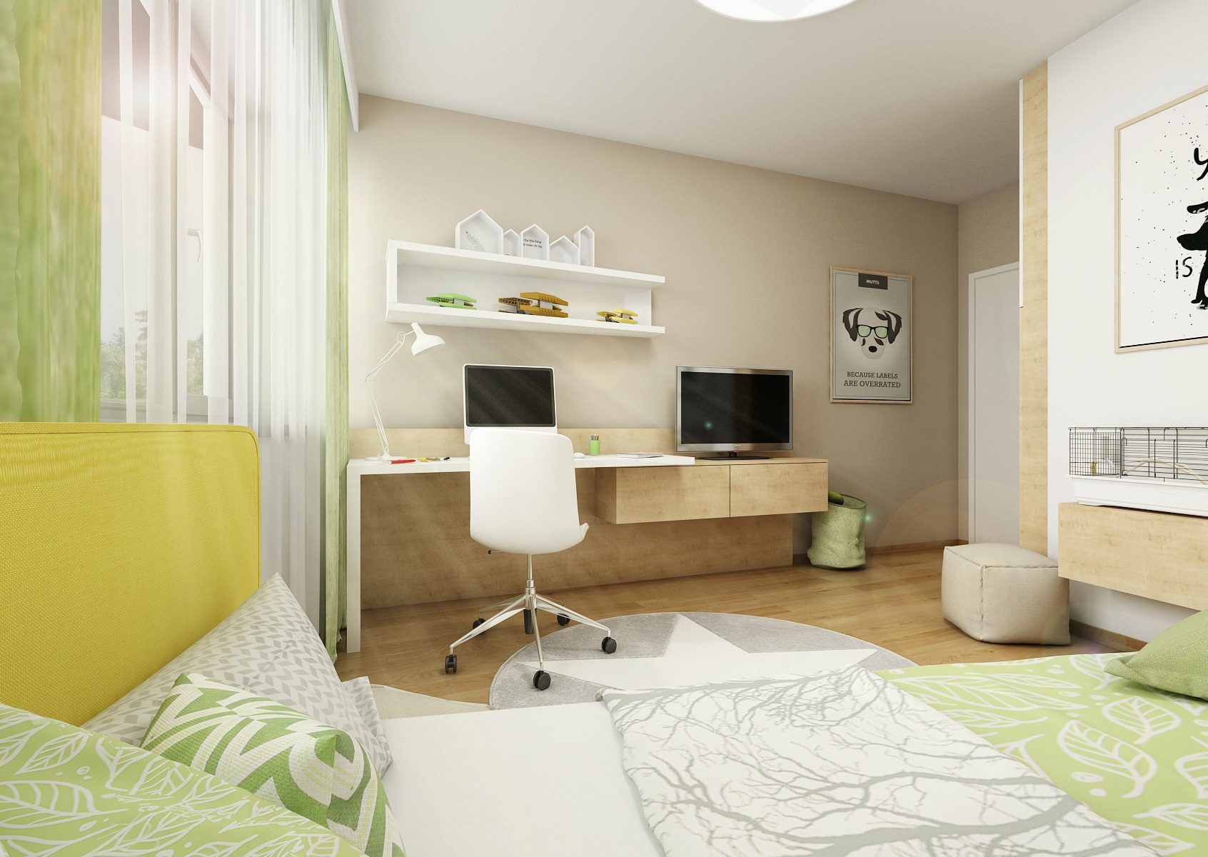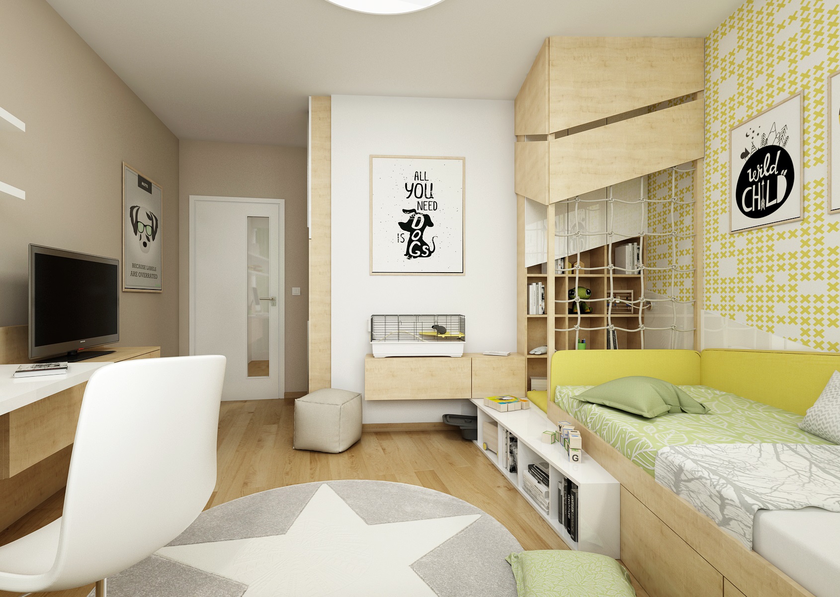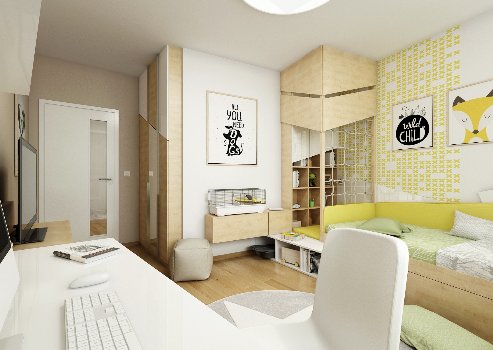 Chlapecký pokoj pro školáka není při pohledu nijak přeplněn, a přesto obsahuje vše potřebné: samozřejmě lůžko, psací stůl, šatní skříň, zásuvky a police na maličkosti a knihy. Při návrhu se nezapomnělo ani na chlupatého kamaráda, křečka, který má v pokoji své stálé místo.