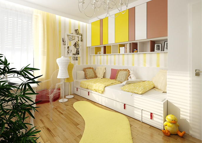 Návrh pokoje pro mladou hudebnici. Pokoj je vybaven postelí, soliterním pracovním stolem, vestavnou skříní a je myšleno i na uložení hudebních nástrojů na stěně. Je laděný do světlých odstínů žluté v kombinaci s bílou i zelenou v druhé variantě. Prostor zpestřuje pruhovaná tapeta a prosvětluje jej velké okno, které umožňuje výhled. Barvy jsou laděny se světlým dřevodekorem a zrcadlová dvířka na šatní skříni místnost opticky zvětšují.