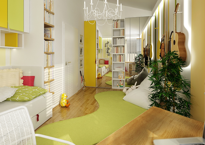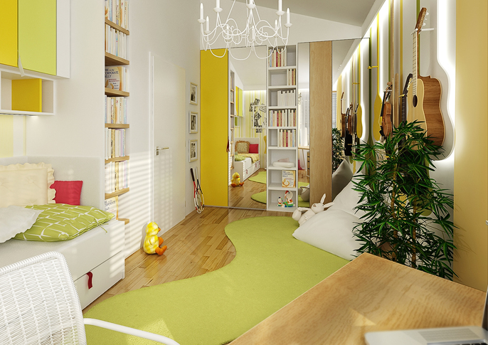 Interiér pokoje pro muzikantku ve žluté a zelené barvě