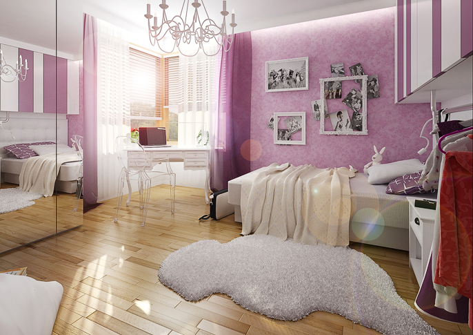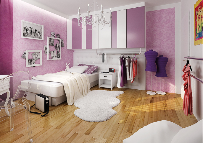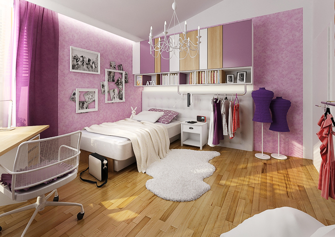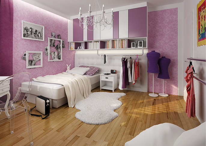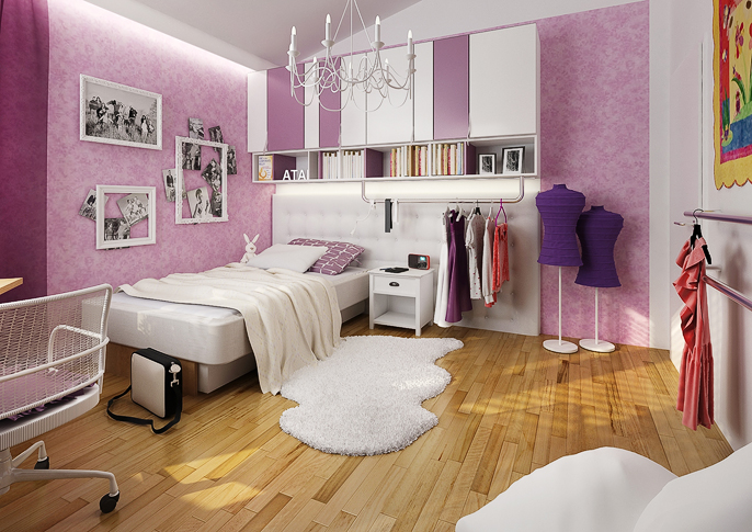 Návrh pokoje pro mladou baletku. Vestavná skříň má na dvířkách zrcadla, aby simulovala zrcadla, která bývají na stěnách v tělocvičně a nechybí ani tyče na stěně. Vše v oblíbené holčičí růžovo-bílé kombinaci. Dominantou tohoto pokoje je honosný lustr kotvený ve stropě připomínající tak baletní sál.