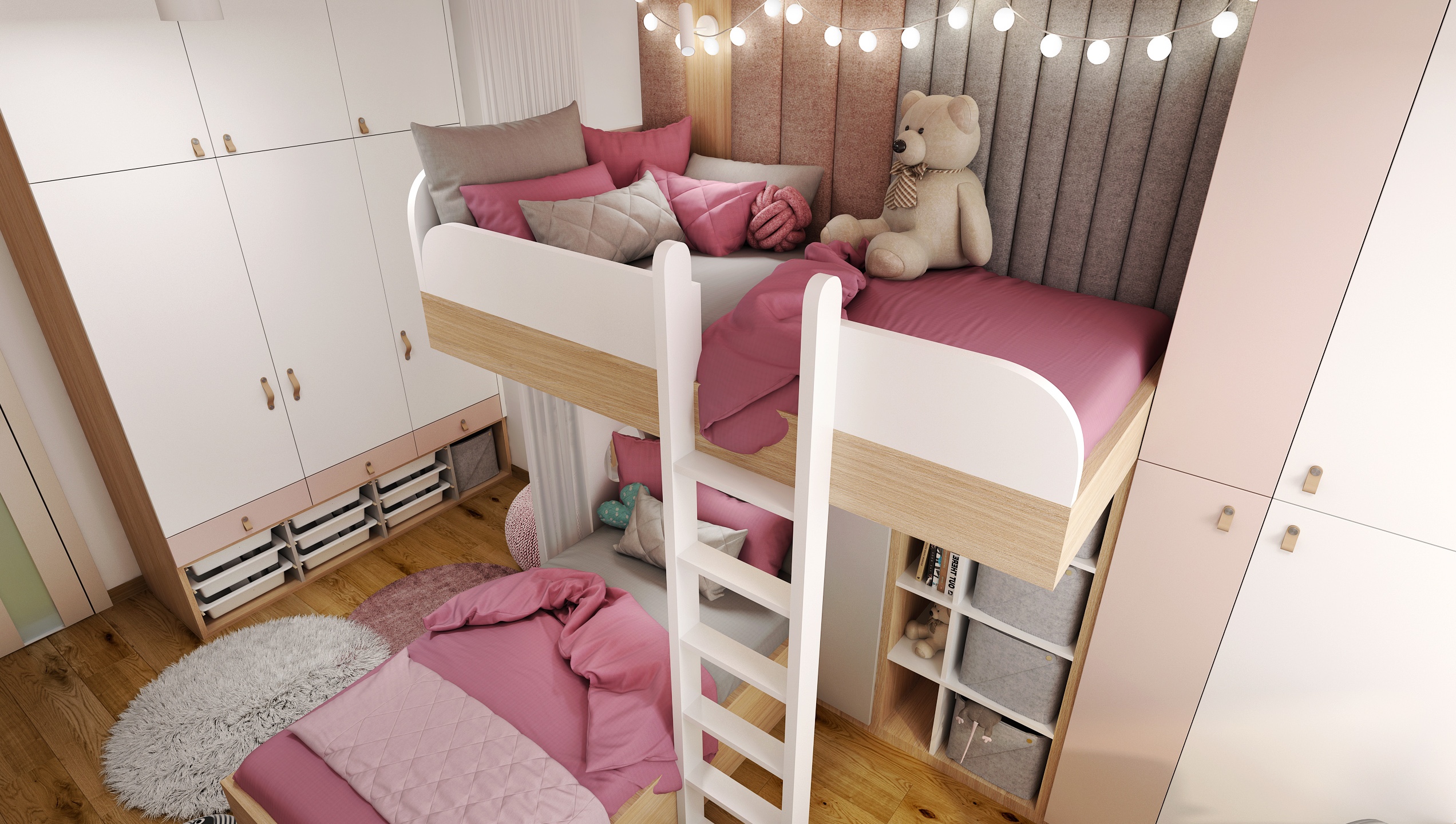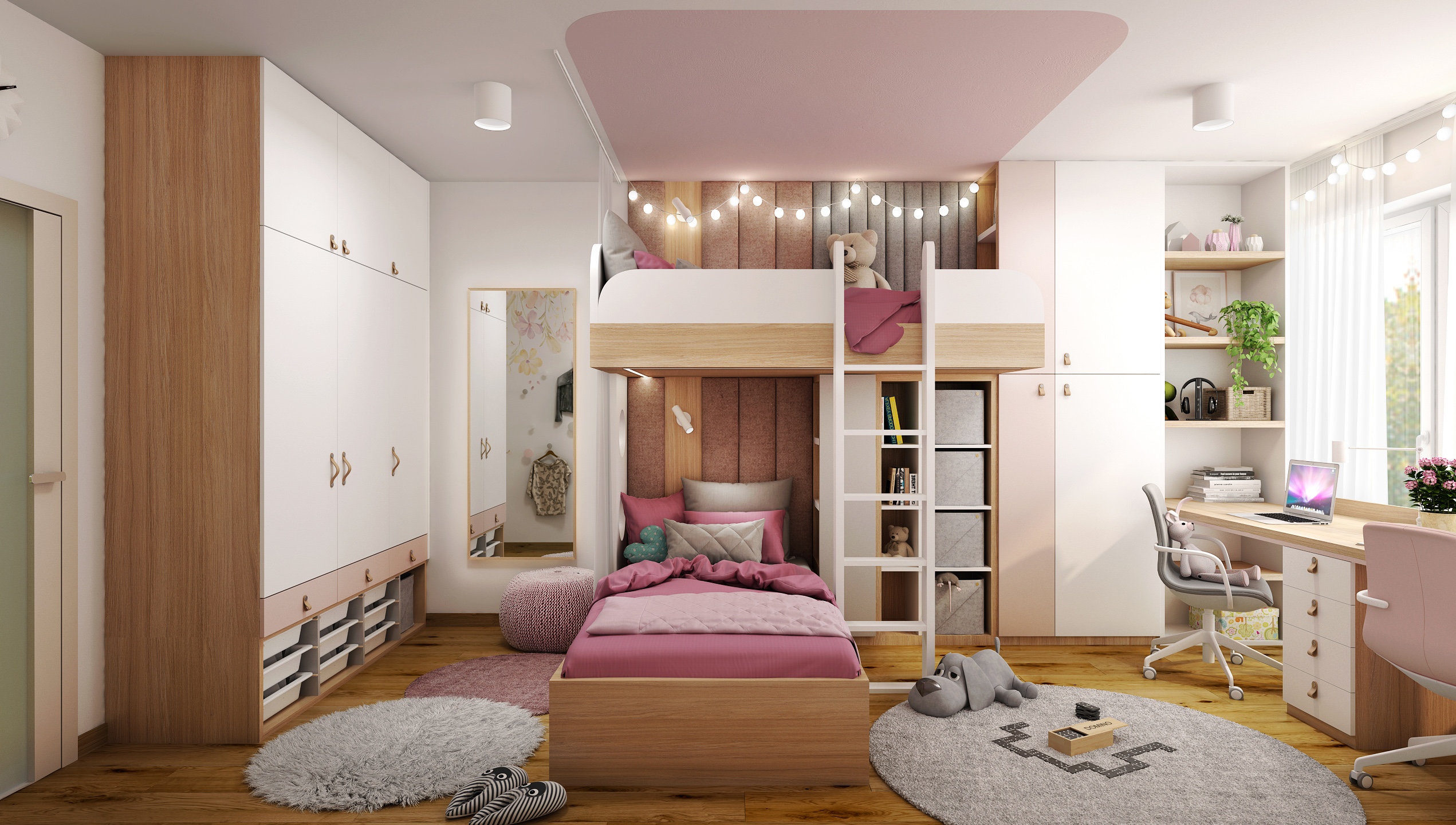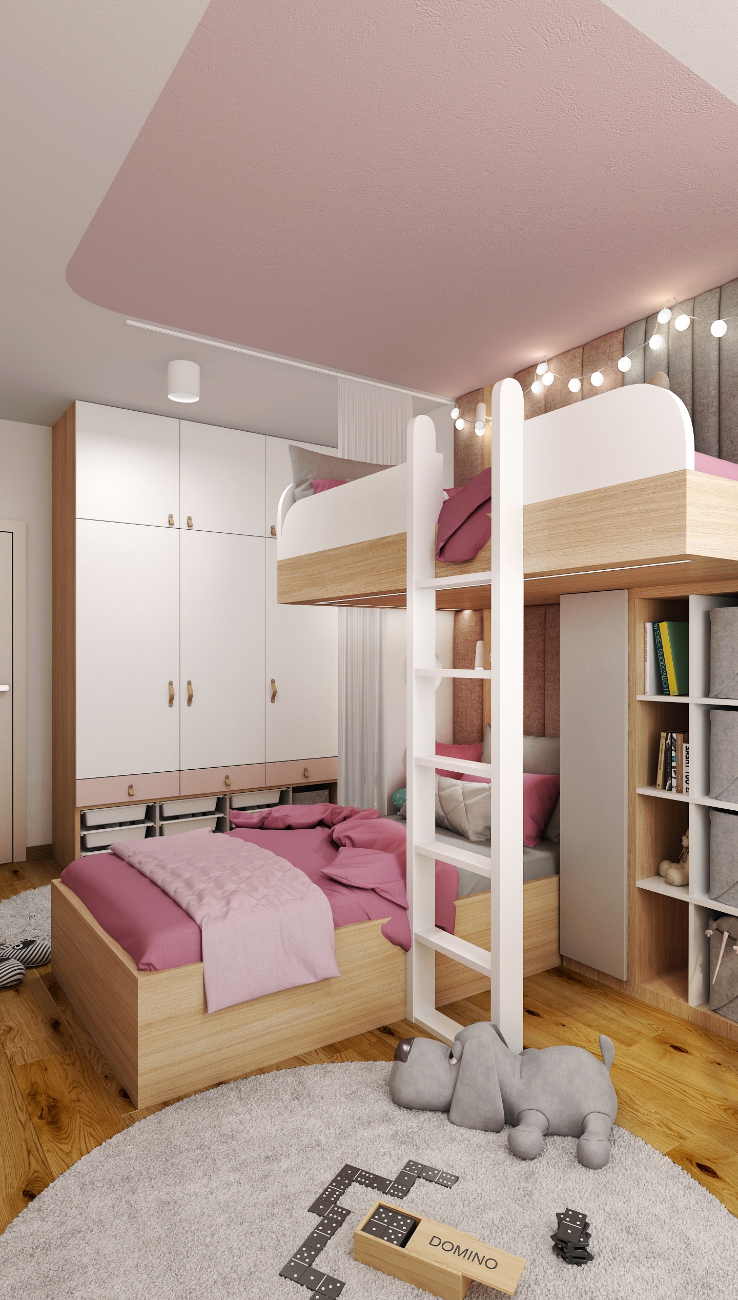 Pokoj je navržen s důrazem na maximální využití prostoru. Dominantním prvkem je patrová postel s dolním lůžkem a horním spaním přístupným po bílé žebříkové konstrukci. Integrované police a úložné boxy poskytují dostatek místa pro knihy, hračky i dekorace.