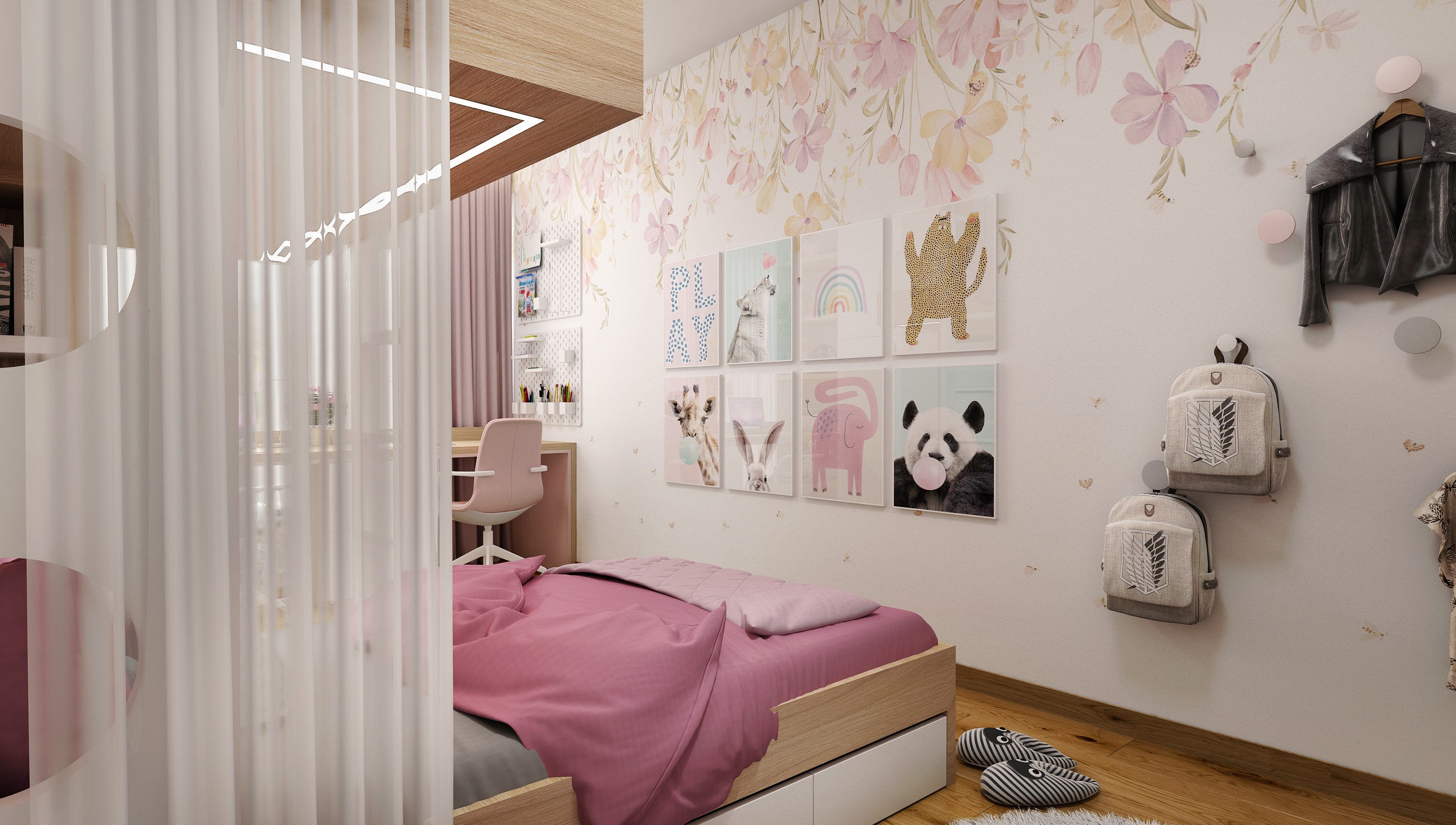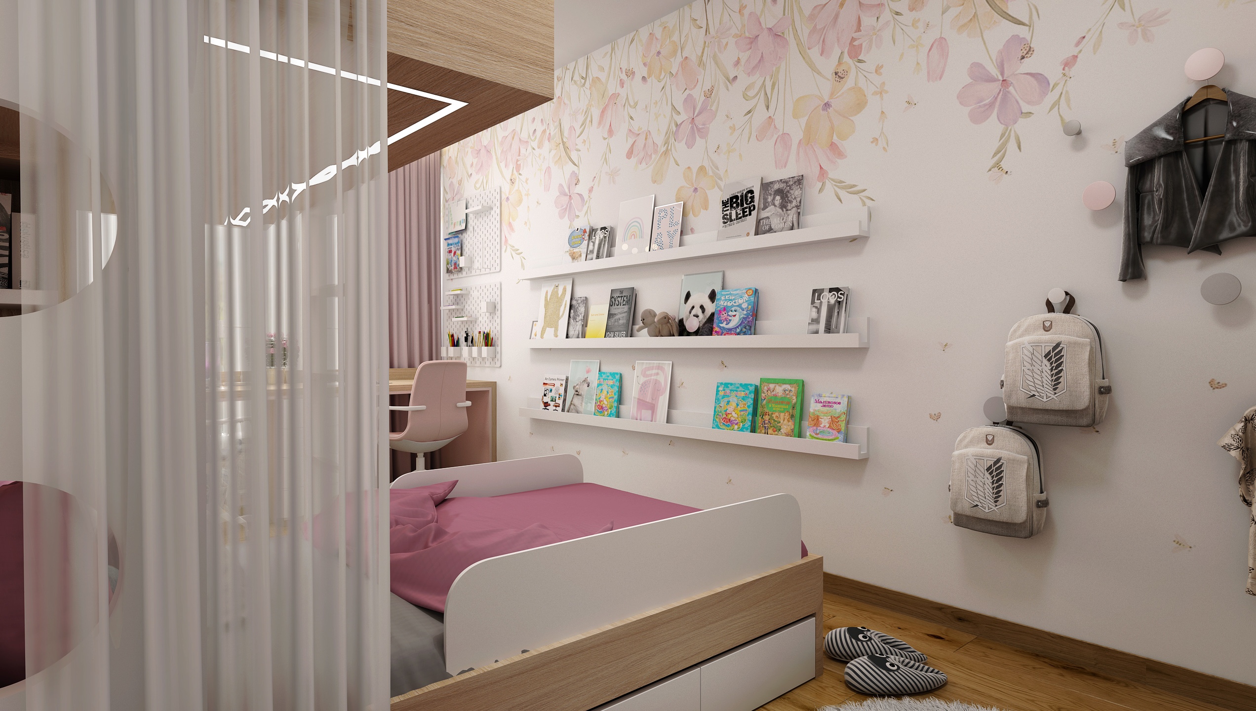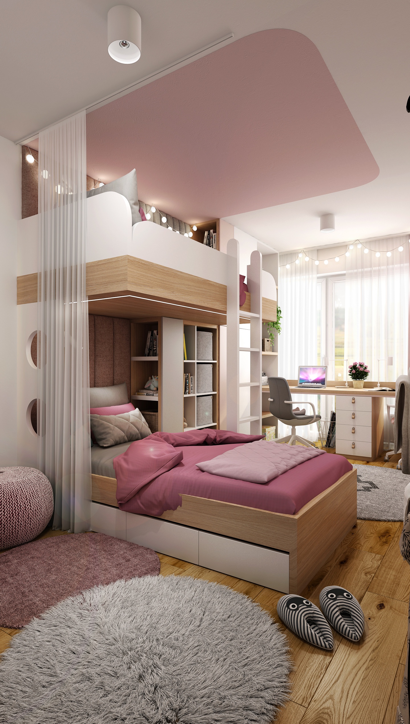Pokoj je navržen s důrazem na maximální využití prostoru. Dominantním prvkem je patrová postel s dolním lůžkem a horním spaním přístupným po bílé žebříkové konstrukci. Integrované police a úložné boxy poskytují dostatek místa pro knihy, hračky i dekorace.