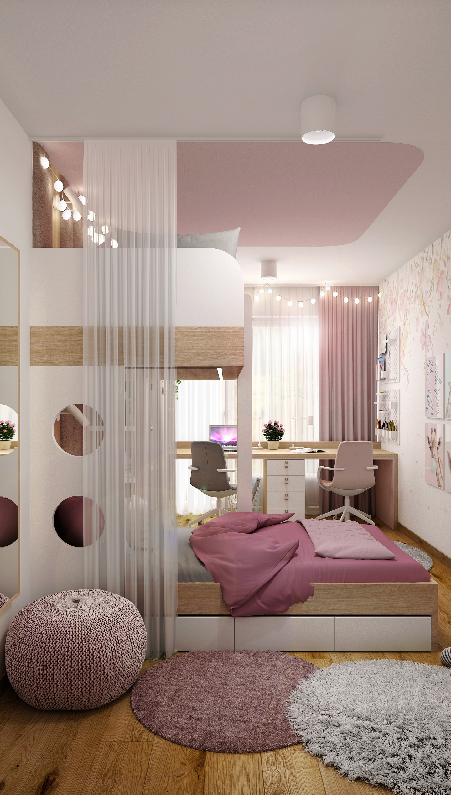 Celkový vzhled pokoje doplňují závěsné světelné řetězy, které navozují hravou a pohádkovou atmosféru. Kruhové a měkké koberce na podlaze dodávají pocit komfortu, zatímco rostliny a drobné dekorace oživují prostor.