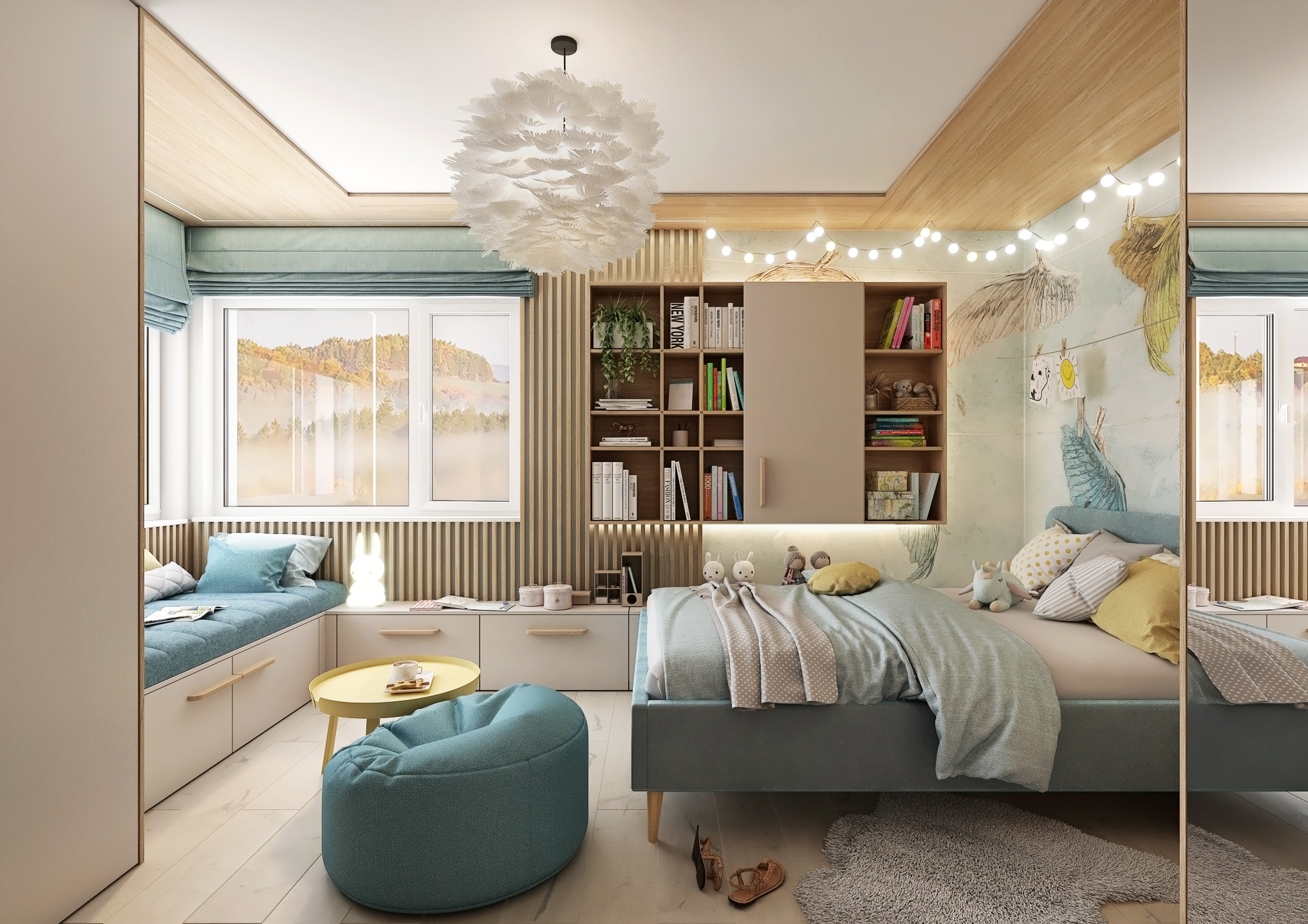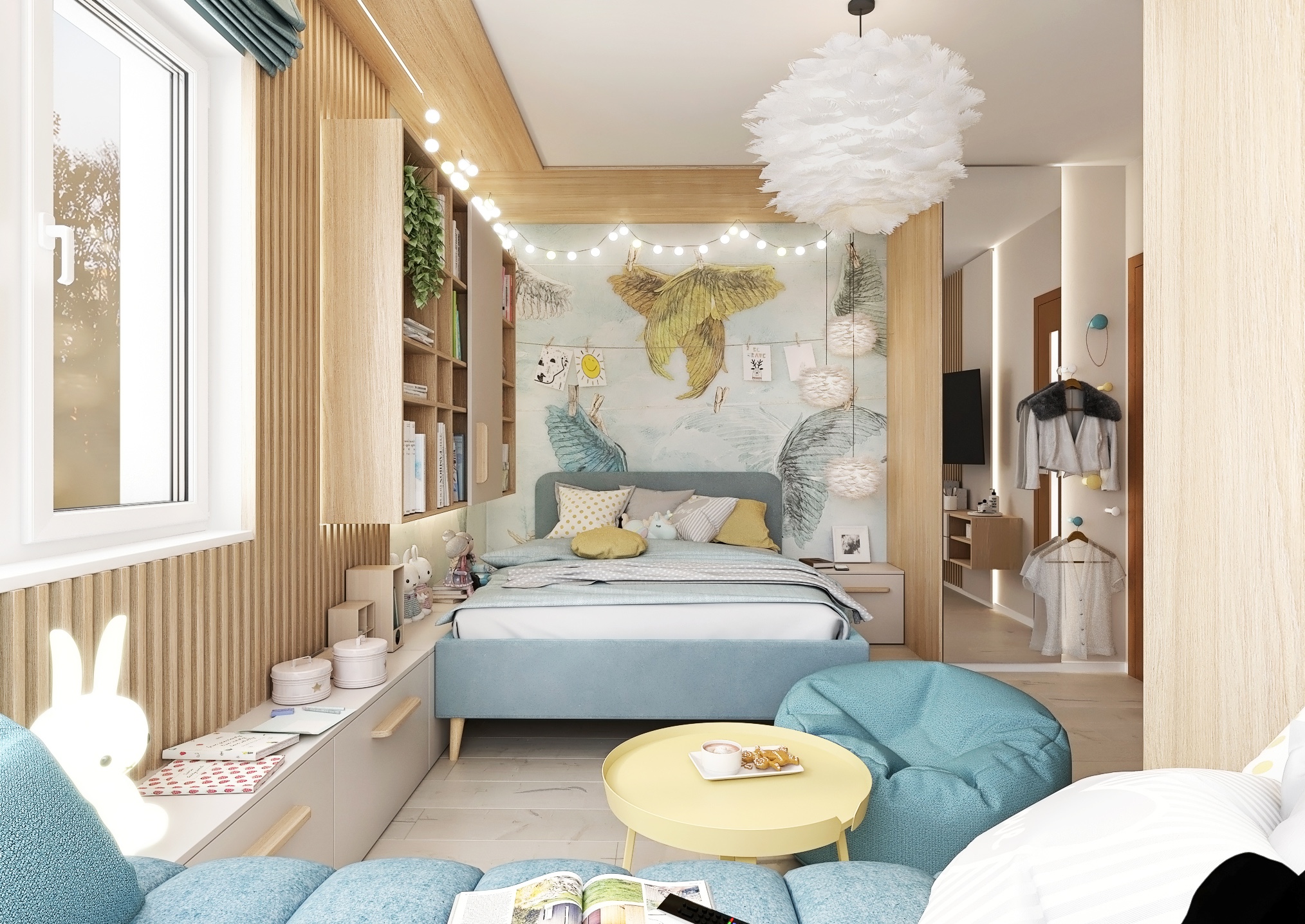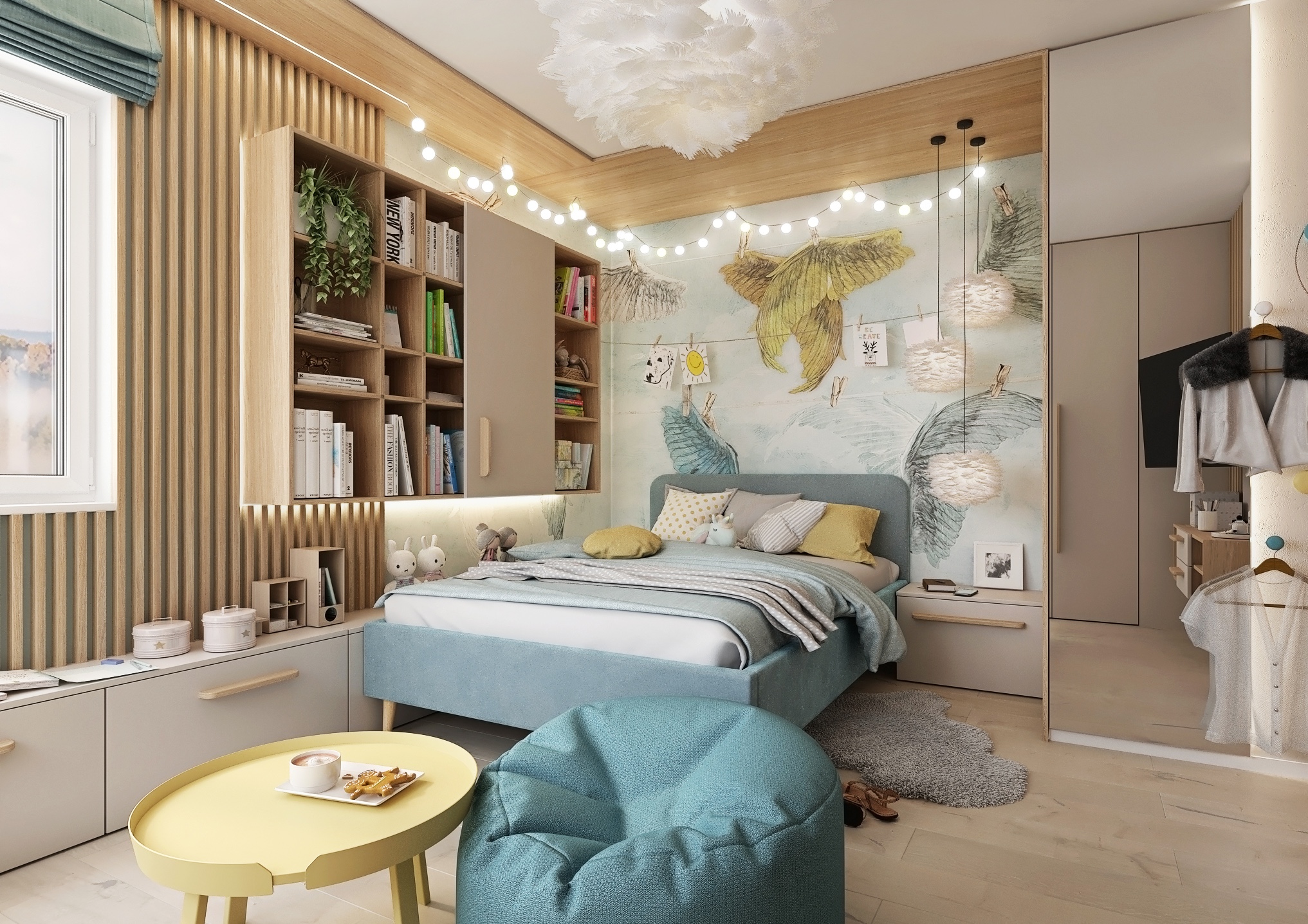Hlavním prvkem místnosti je prostorná postel, která je obklopena světlými dřevěnými panely a dekorativními policemi plnými knih a hraček. Nad postelí visí řetěz světýlek, který dodává místnosti kouzelnou atmosféru. Stěna za postelí je ozdobena nástěnnou malbou s motivem ptáků, což přidává prostoru umělecký a snový vzhled. Místnost je také vybavena měkkým křeslem a kulatým stolkem, ideálním pro relaxaci a čtení.
