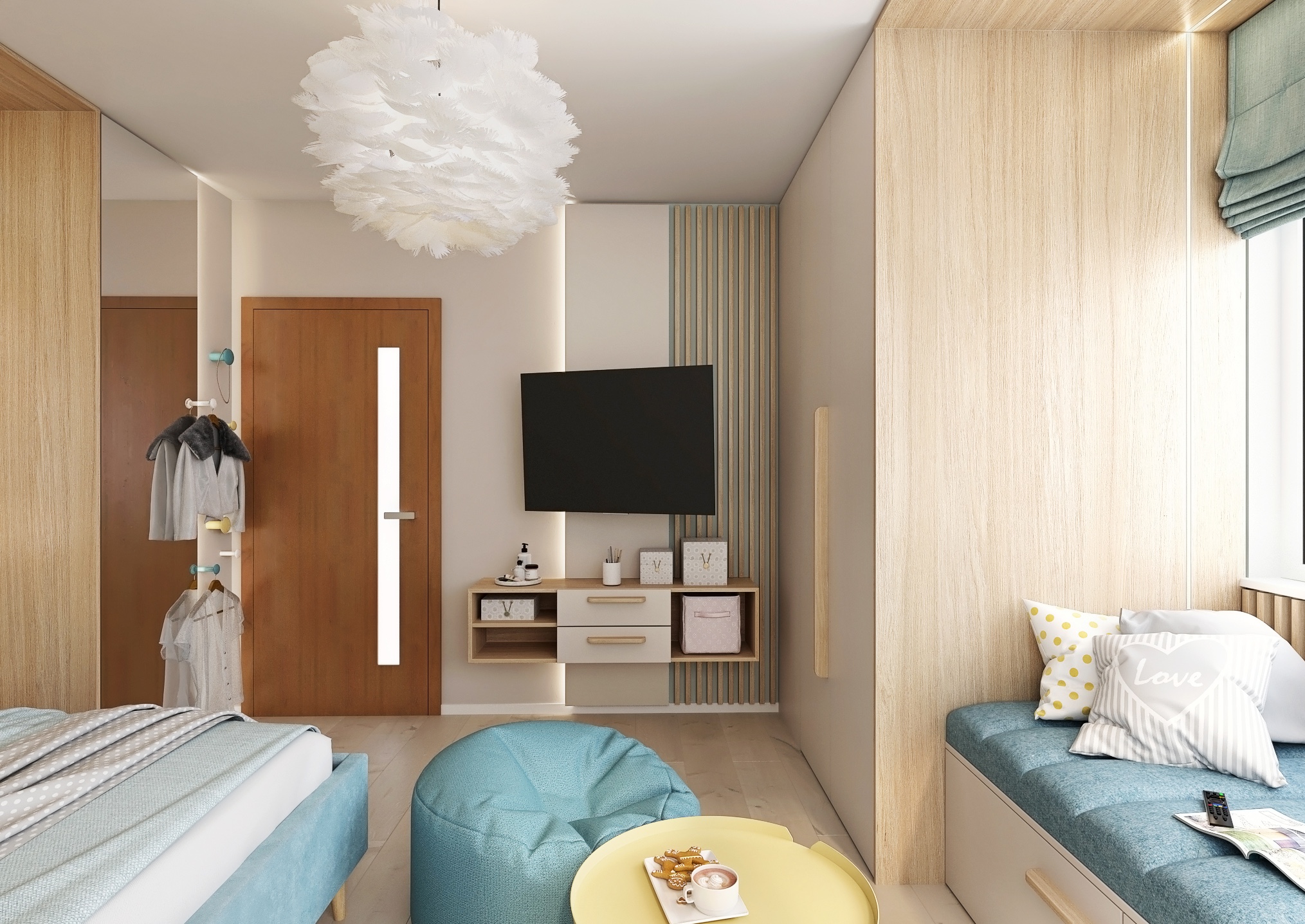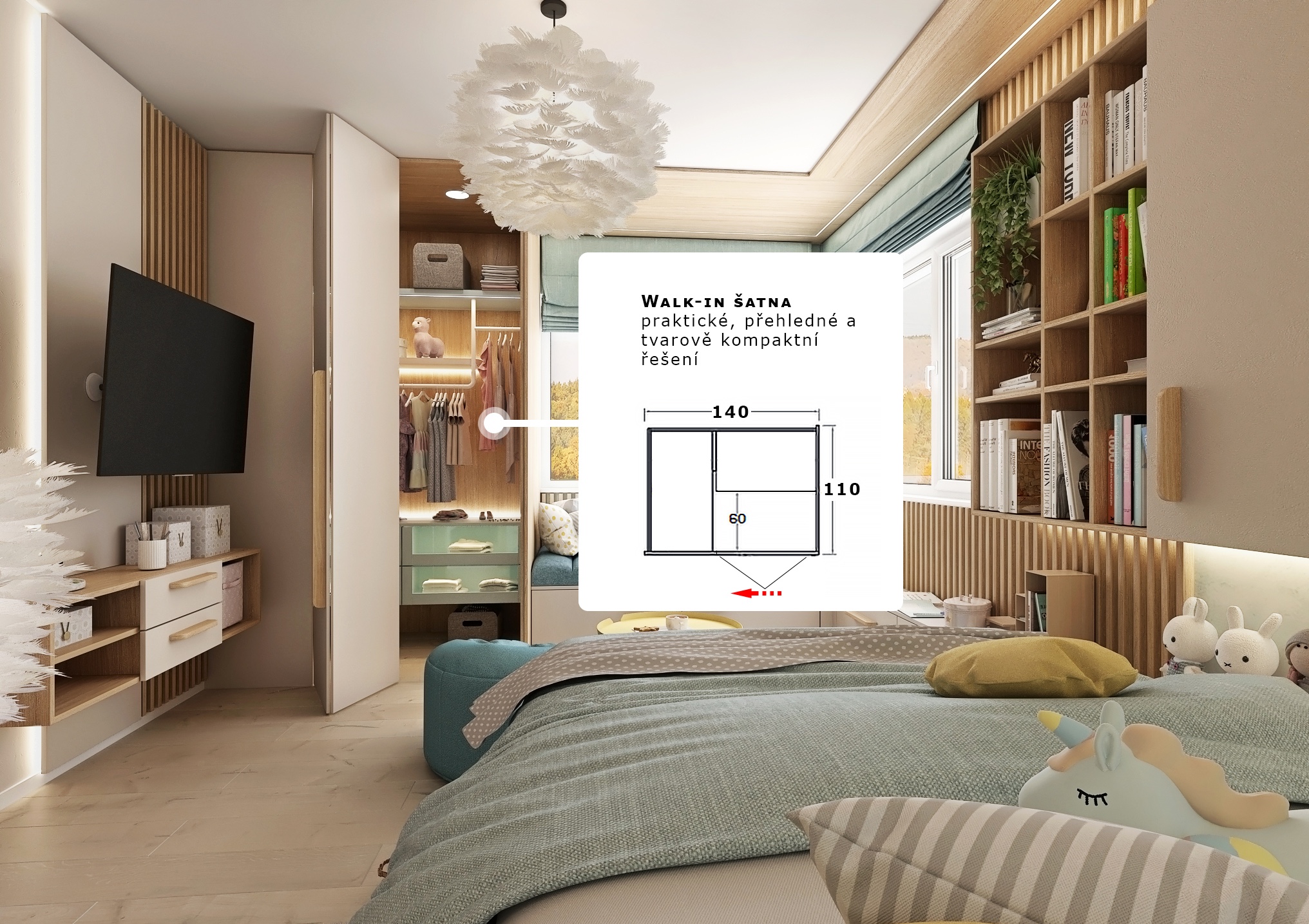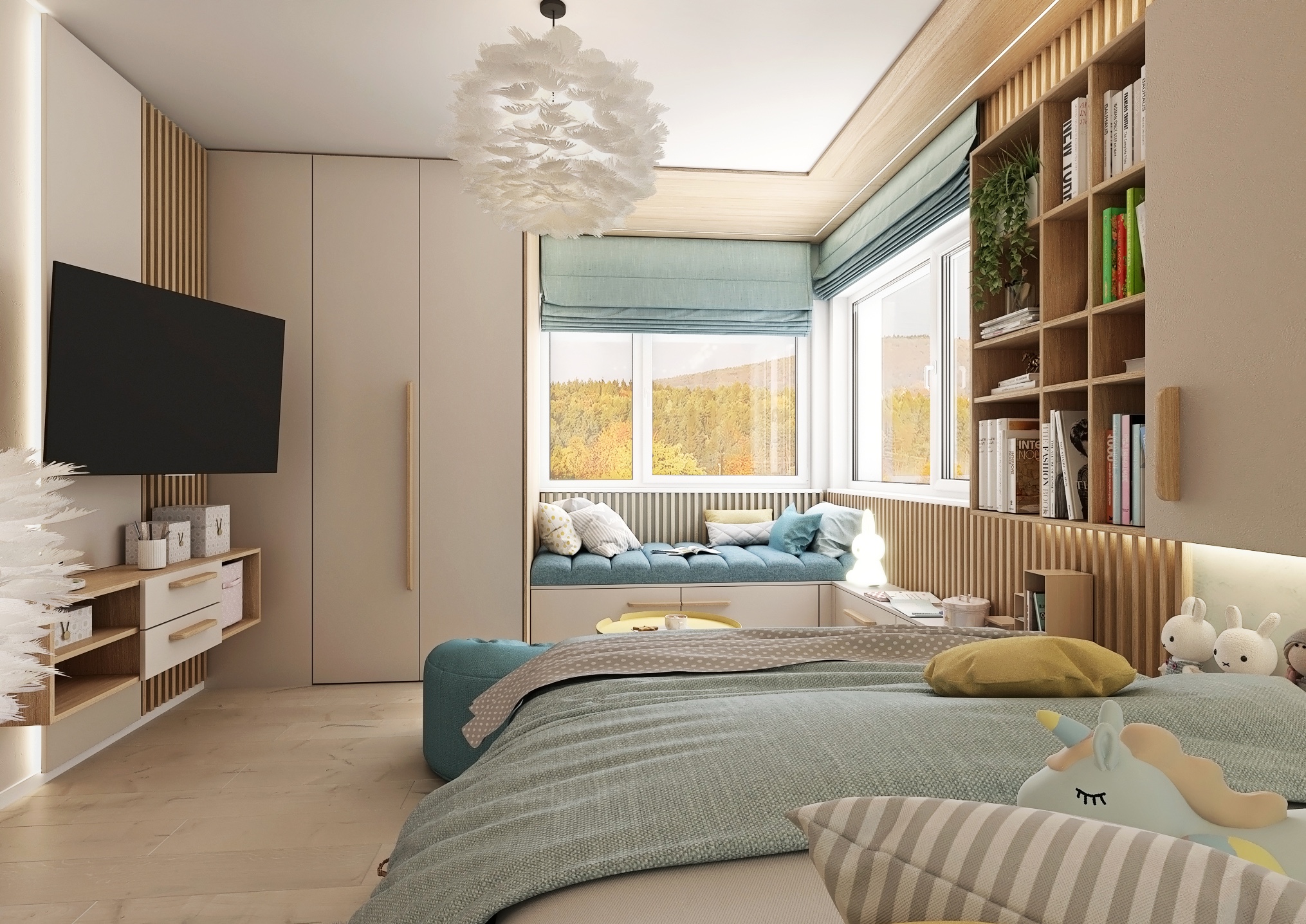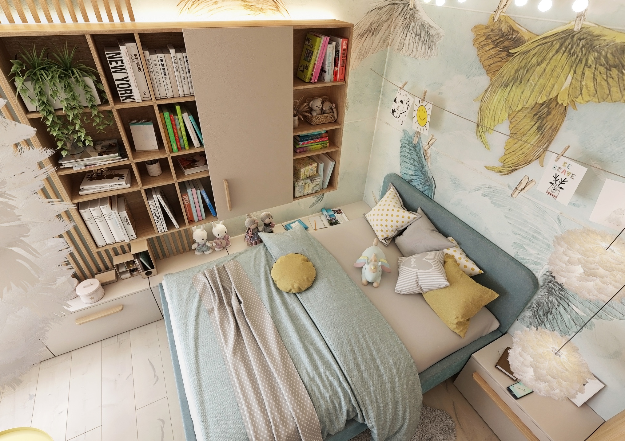 Hlavním prvkem místnosti je prostorná postel, která je obklopena světlými dřevěnými panely a dekorativními policemi plnými knih a hraček. Nad postelí visí řetěz světýlek, který dodává místnosti kouzelnou atmosféru. Stěna za postelí je ozdobena nástěnnou malbou s motivem ptáků, což přidává prostoru umělecký a snový vzhled. Místnost je také vybavena měkkým křeslem a kulatým stolkem, ideálním pro relaxaci a čtení.