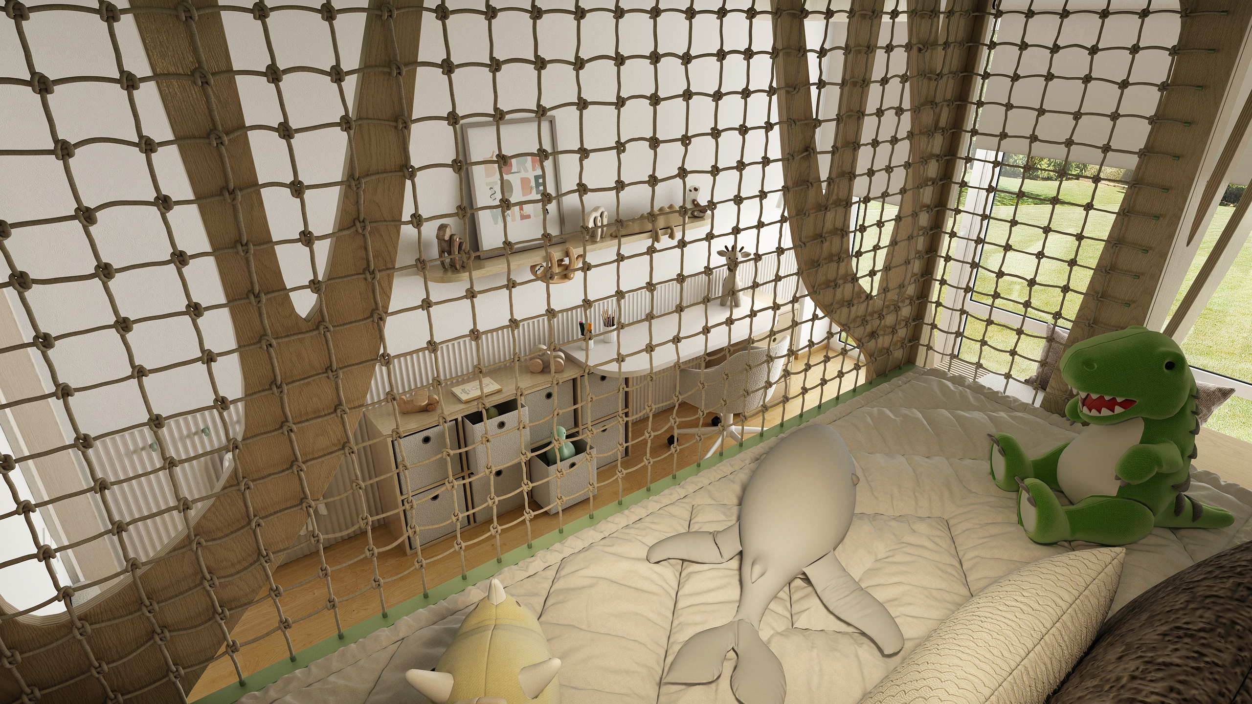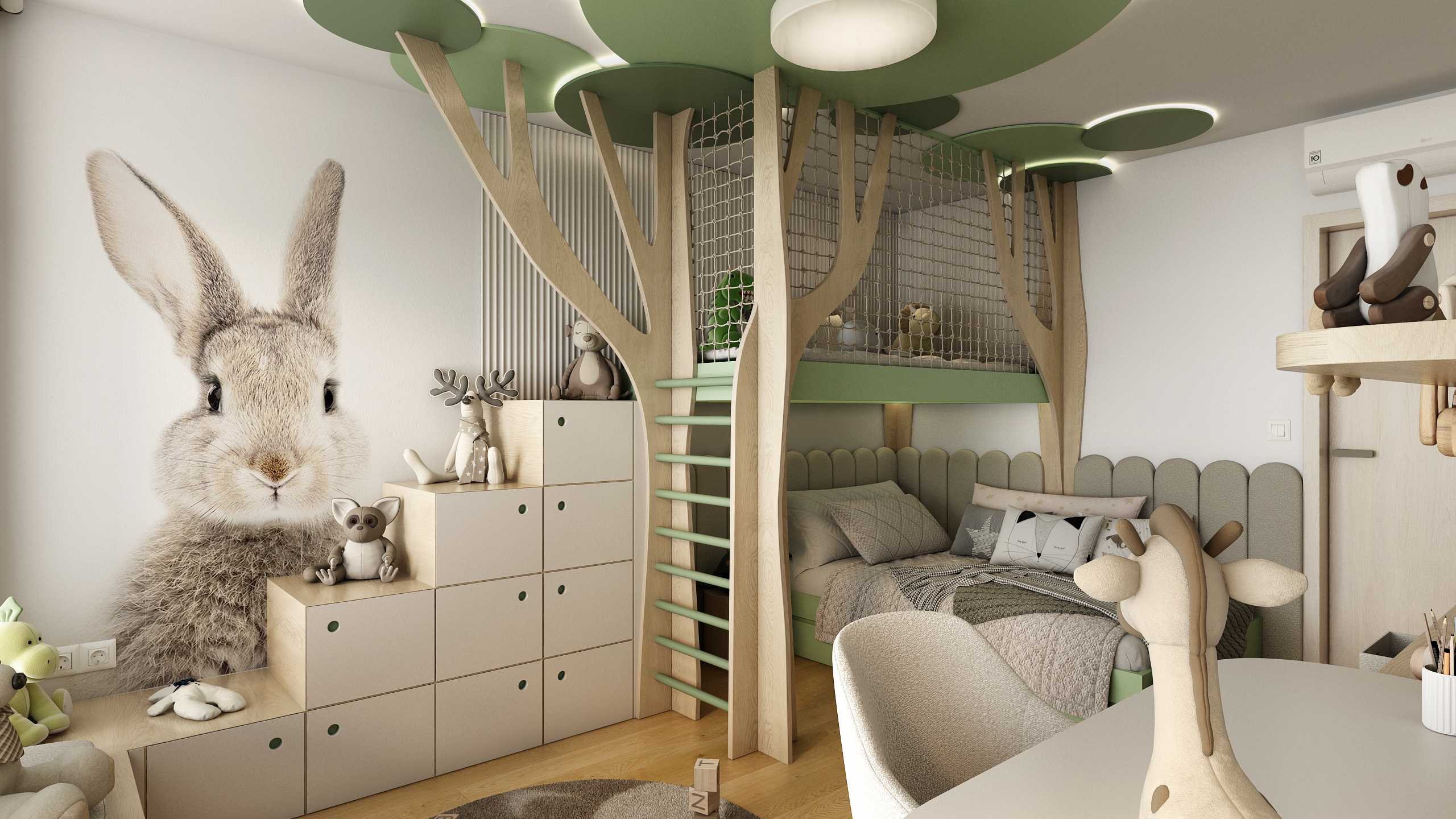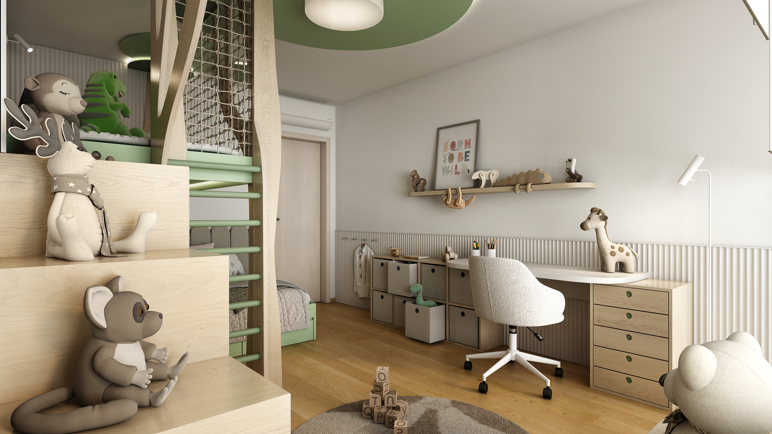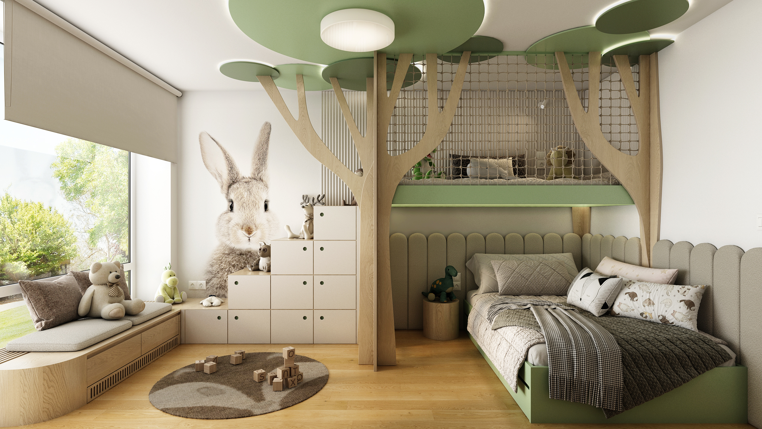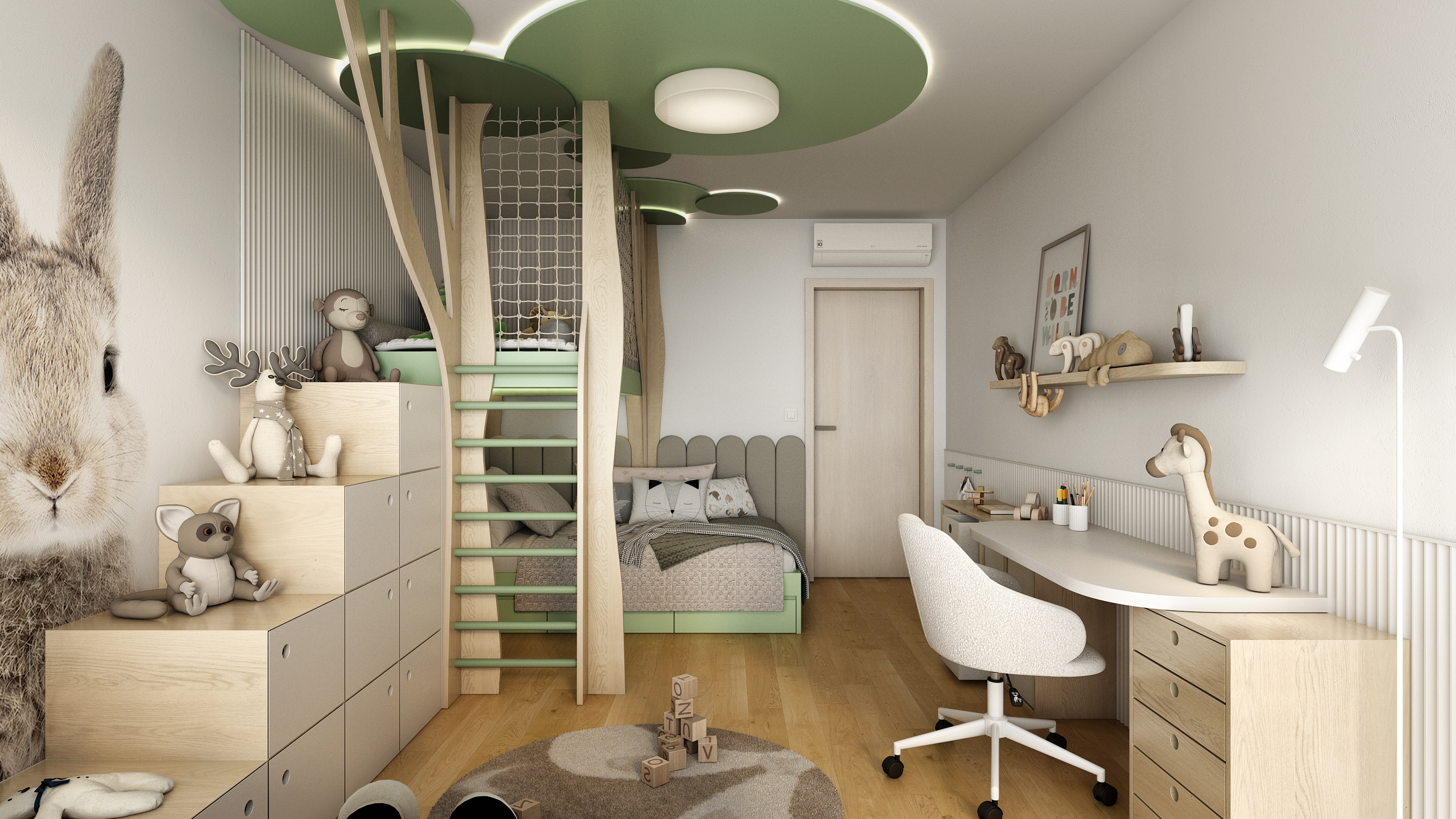 Dominantou pokoje je originální patrová postel připomínající lesní domeček mezi stromy, doplněná o síť proti pádu a žebřík v jemně zeleném odstínu. Kulaté zelené prvky na stropě evokují koruny stromů a společně s přírodními materiály vytvářejí pocit pohádkového lesa.