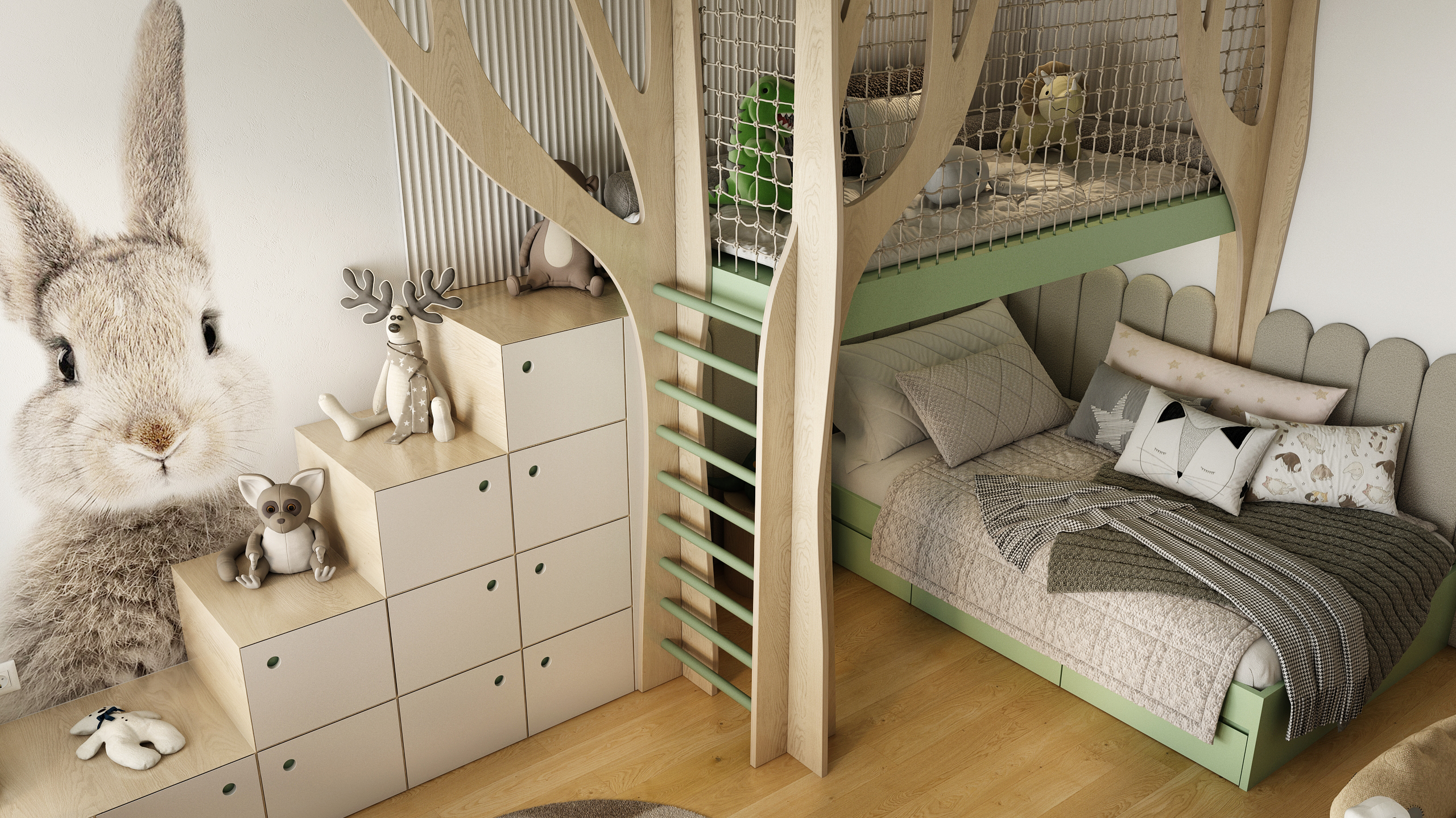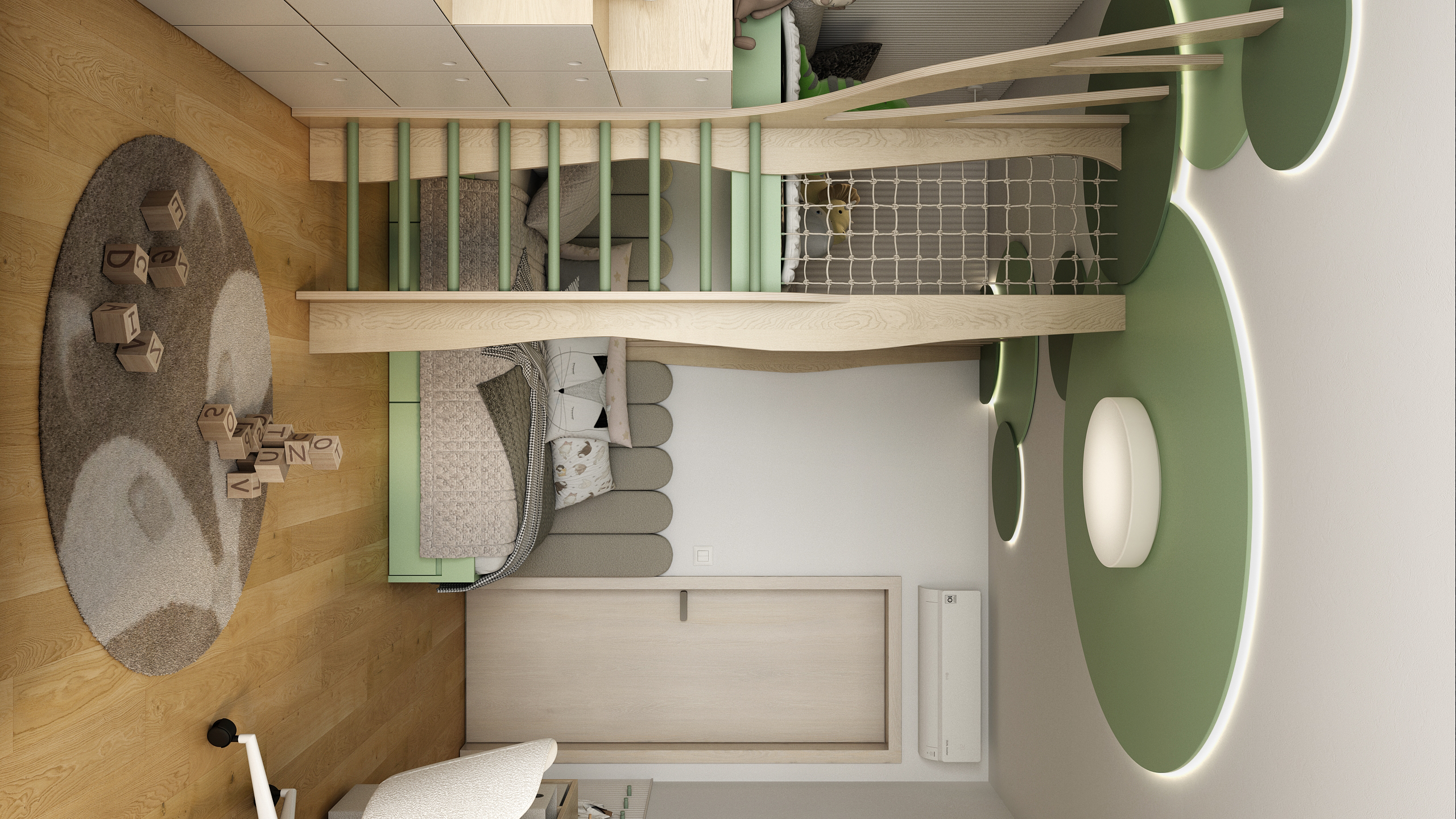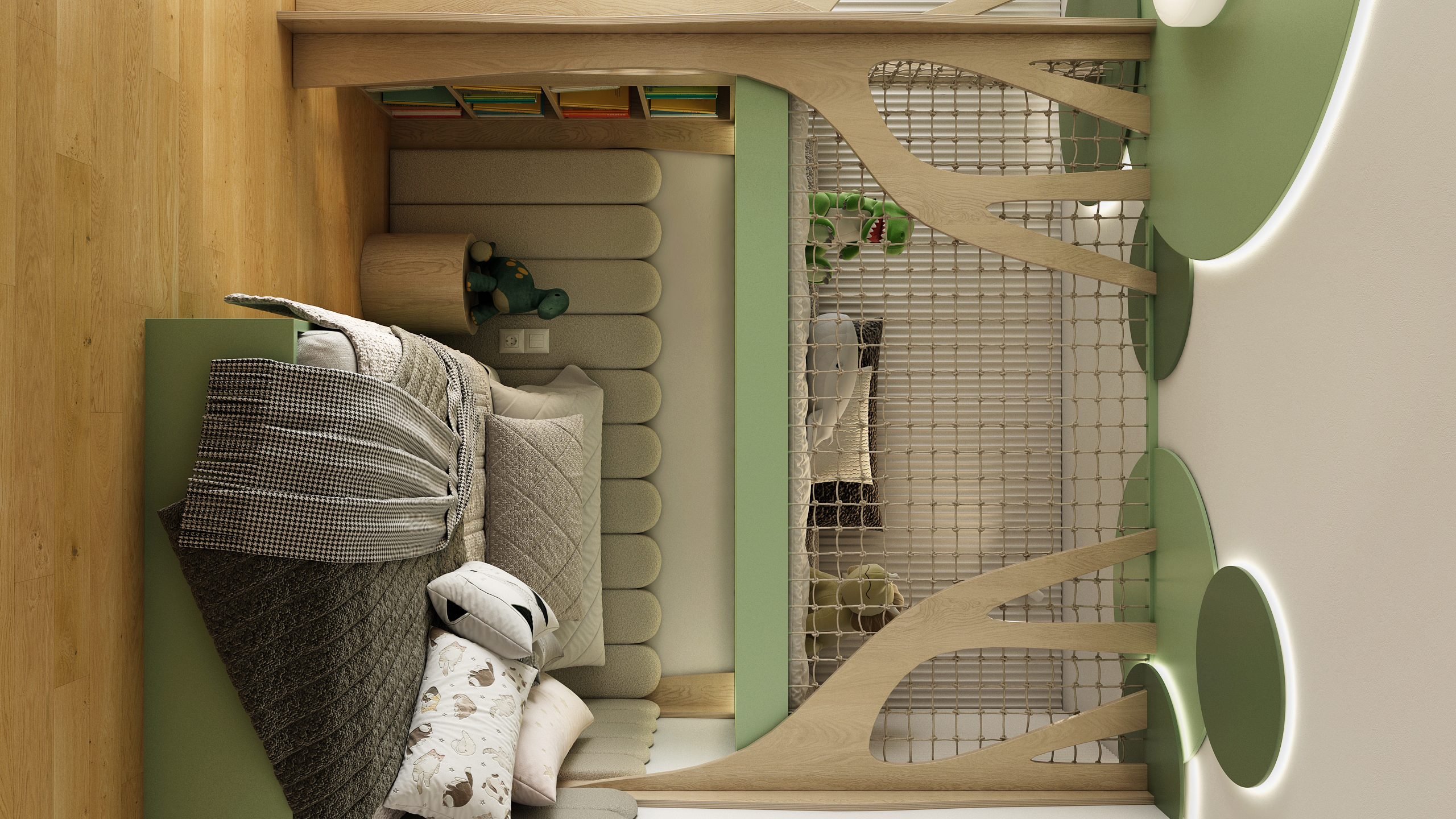 Spodní lůžko je zasazené do útulného výklenku s měkkým čalouněním, které dodává pocit bezpečí a pohodlí. Tlumená paleta béžové, dřeva a pastelově zelené podporuje harmonickou atmosféru ideální pro odpočinek i usínání.