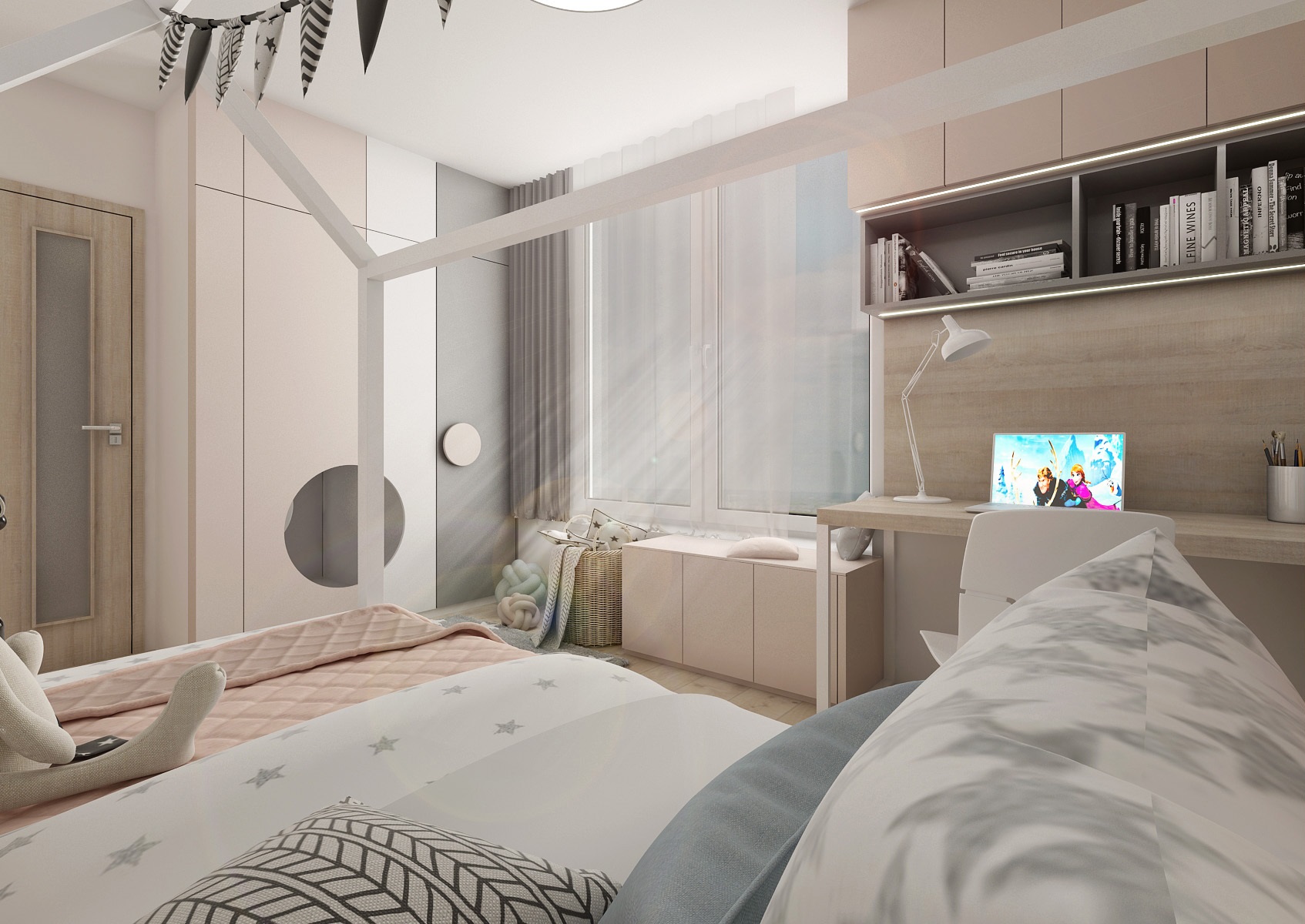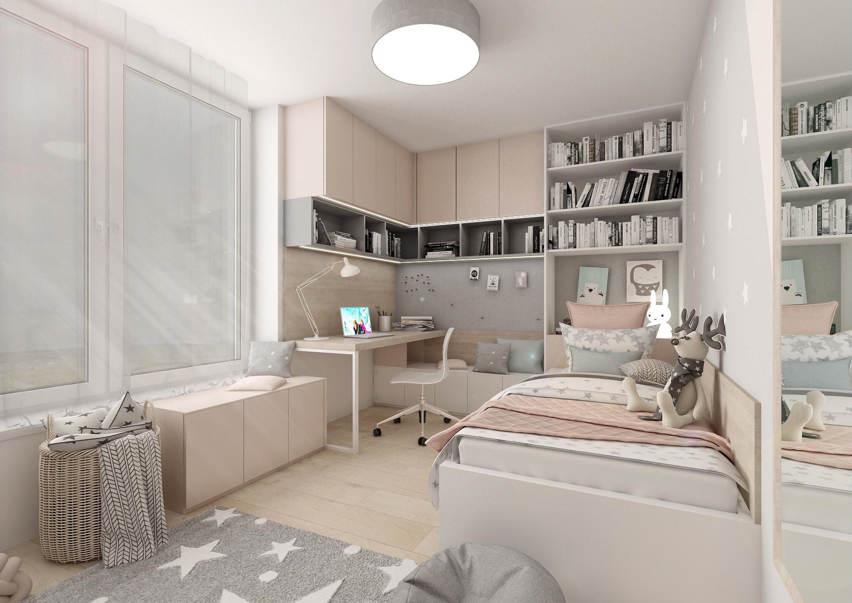 Nábytek, dekorace a čalounění je v holčičích růžovo-béžových pastelových barvách.