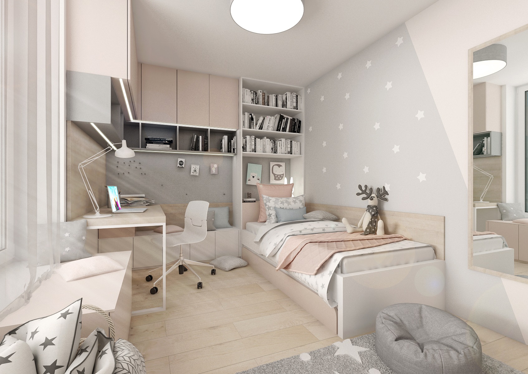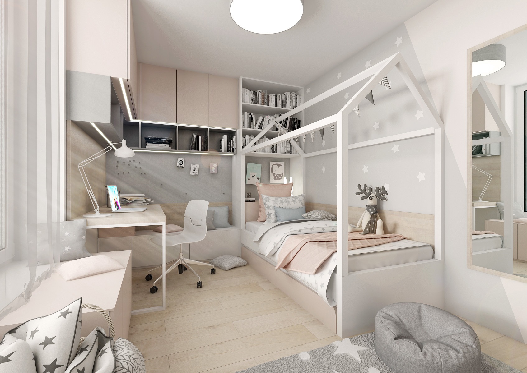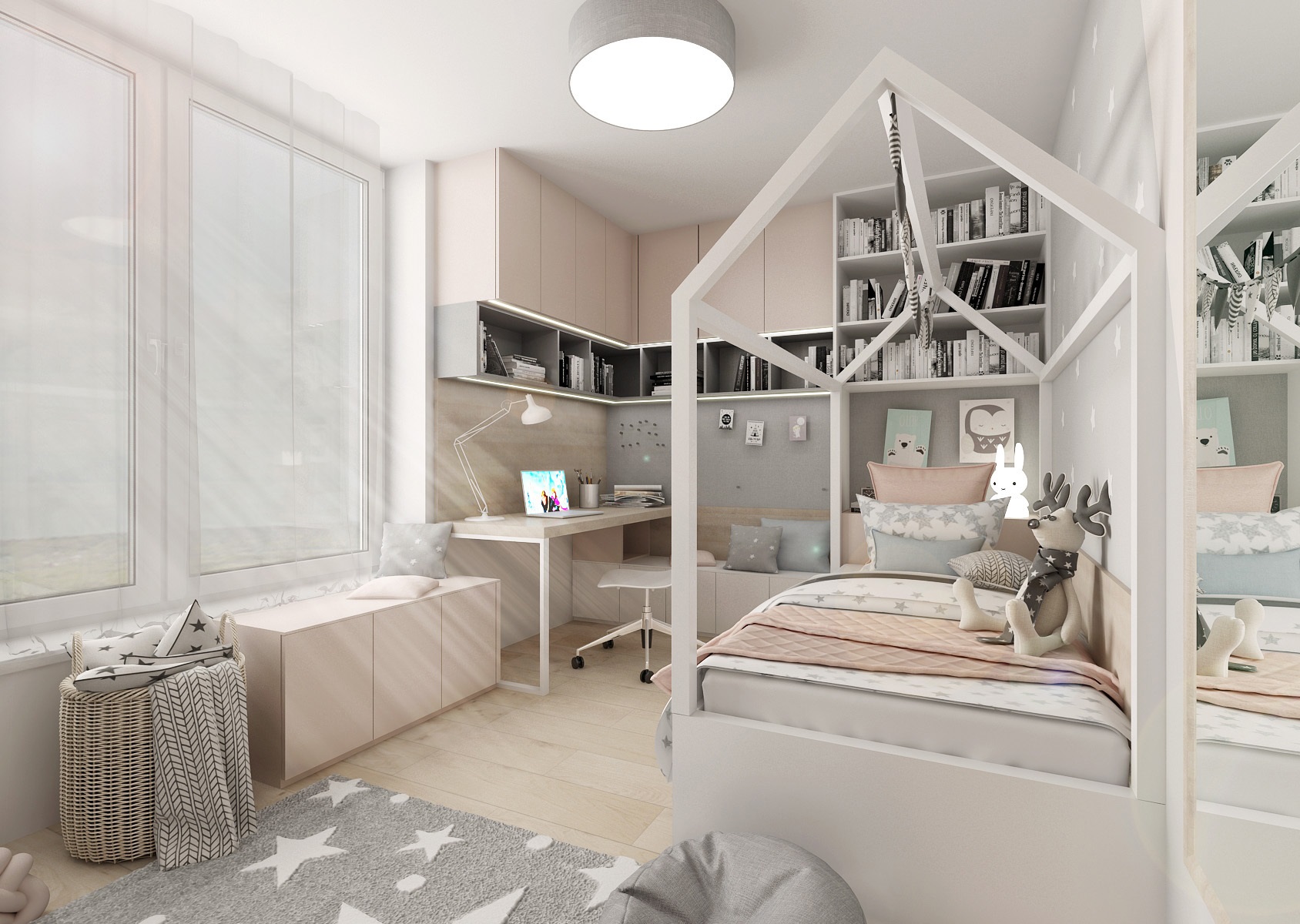 Dva téměř identické pokojíčky pro sestry navržené tak, že se mohou navštěvovat skrze průlez společnou vestavnou skříní.