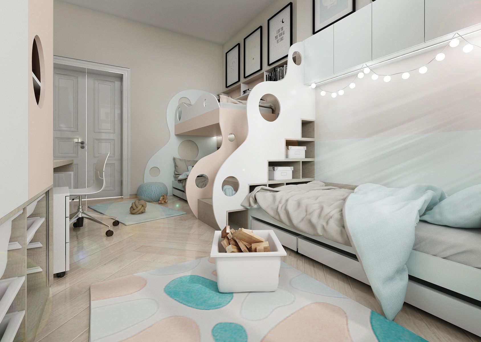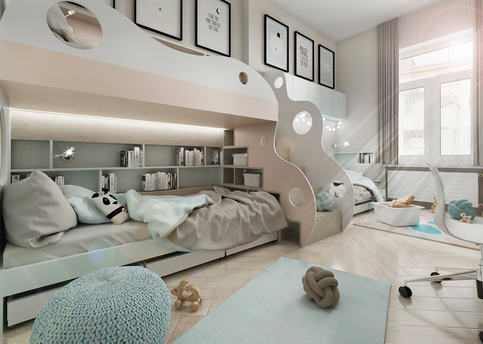 Vyřešili jsme to navržením sestavy na míru tří postelí z LTD, která zaujímá celou jednu stěnu pokoje. Skládá se z patrové postele a jedné samostatné nad kterou jsou ještě zavěšené skříňky. Místo žebříku do patrové postele je zde vloženo schodiště s úložným prostorem a je zároveň i předělem od třetího lůžka. Bočnice postelí a zábradlí se line vlnitým obloukovitým tvarem s kruhovými průřezy, které tuto hmotu odlehčují a slouží i jako úchyty. Zakulacené tvary mají však i funkci vzhledem k bezpečnosti, kdy se děti případně nenarazí o pravoúhlé spoje.