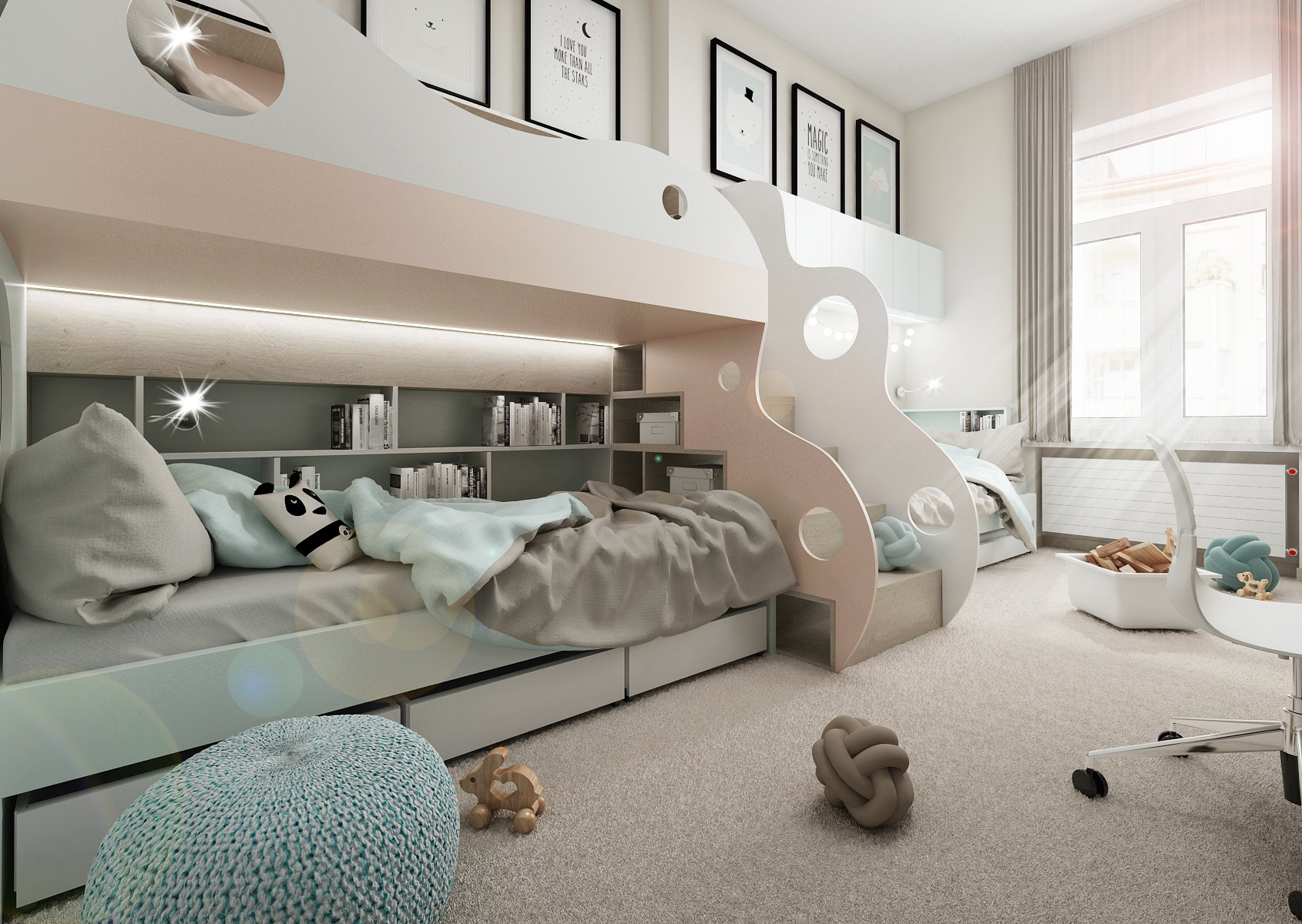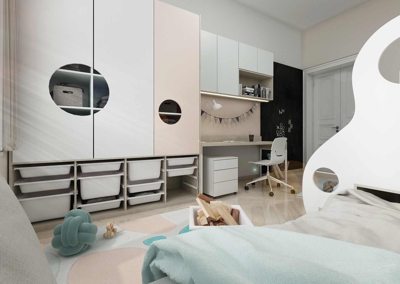 Oblouky a kruhy jsou typickým prvkem tohoto pokoje. Důležitou částí každého pokojíčku je prostor na spaní – postel a to hlavně, když má pokoj být pro tři sourozence.