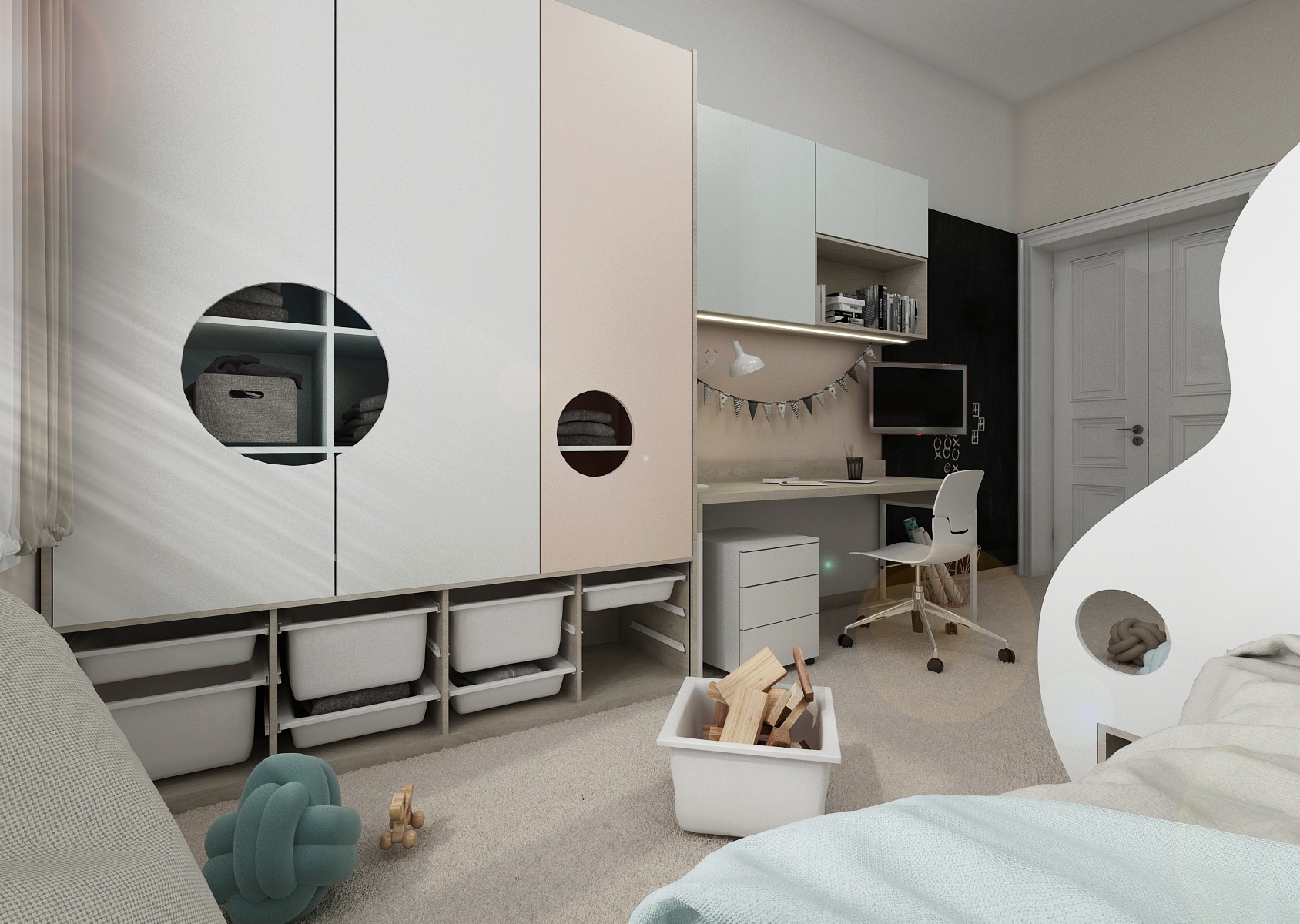 Jelikož se jedná o pokoj pro předškolní děti, je zde jen menší pracovní stůl, jinak jsou zde především úložné prostory na hračky a sezonní oblečení.