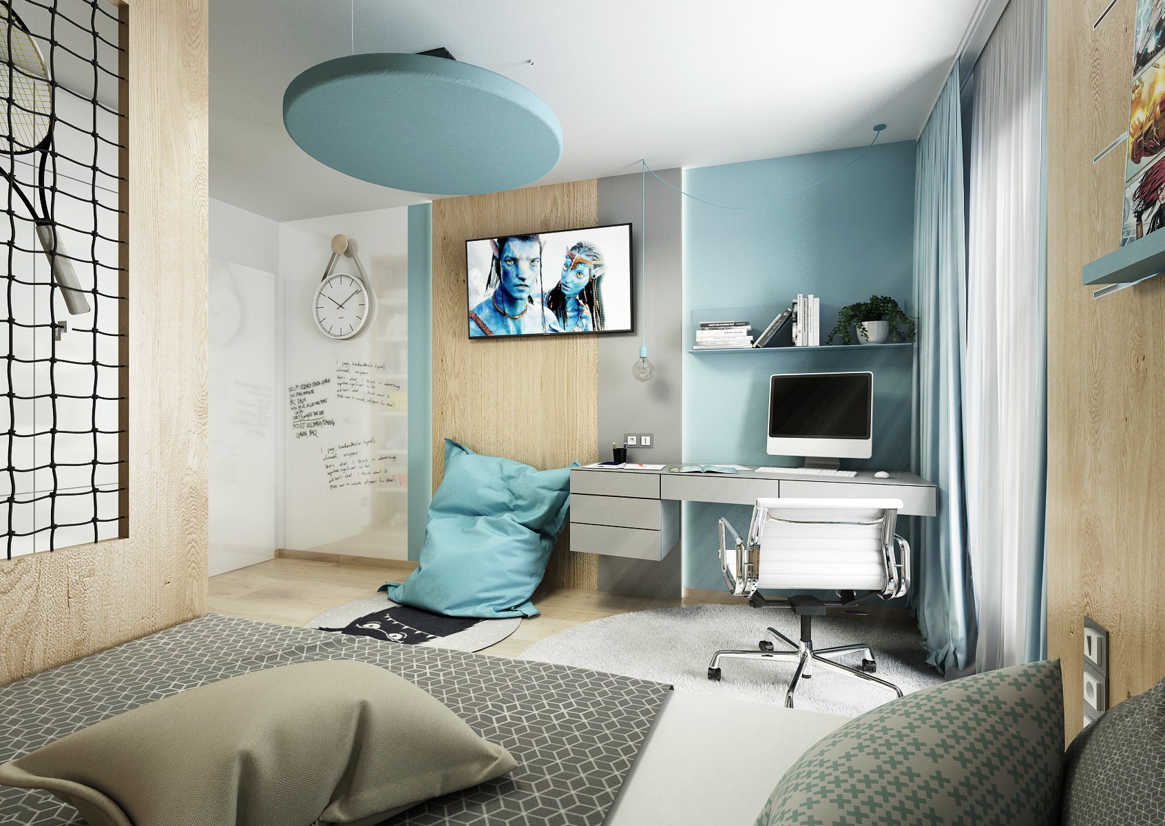 Pro vzkazy i poznámky je u vchodu skleněná tabule. Celý pokoj je laděn do světle modré v kombinaci s bílou, šedou a dřevodekorem dubu.