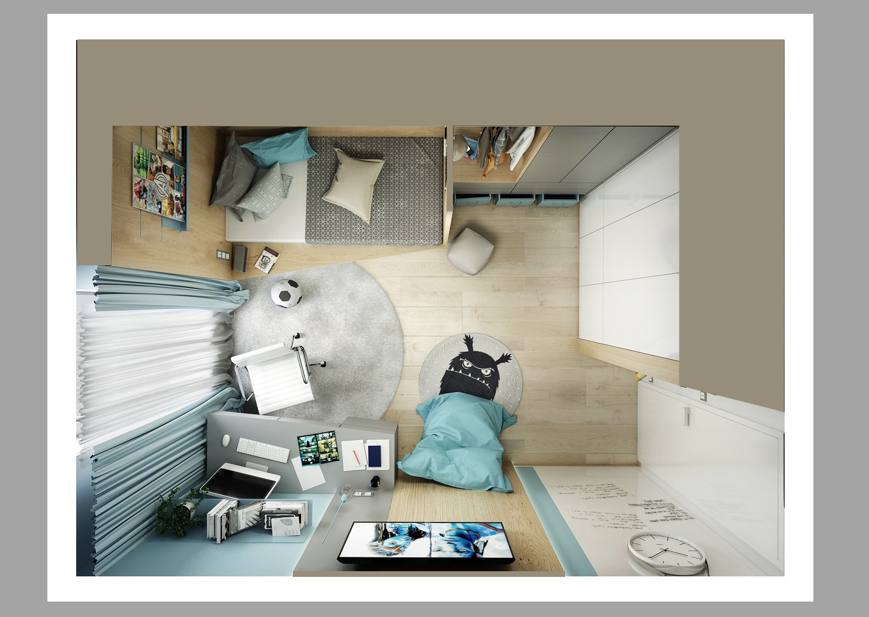 Atypicky vyráběný nábytek umožnuje co nejlépe využít daný prostor. Jako například ke studiu a práci slouží minimalistický pracovní stůl zavěšený na skrytých konzolách v šedém laminu. Postel je v rámci nábytkové sestavy s obkladem a závěsným programem např. MODI.