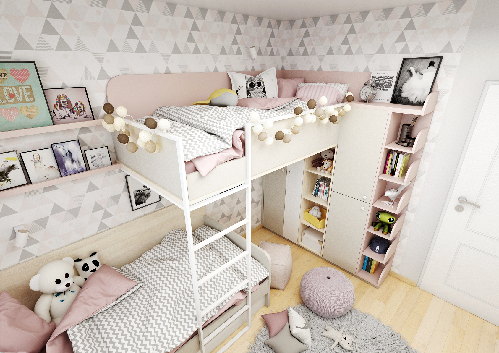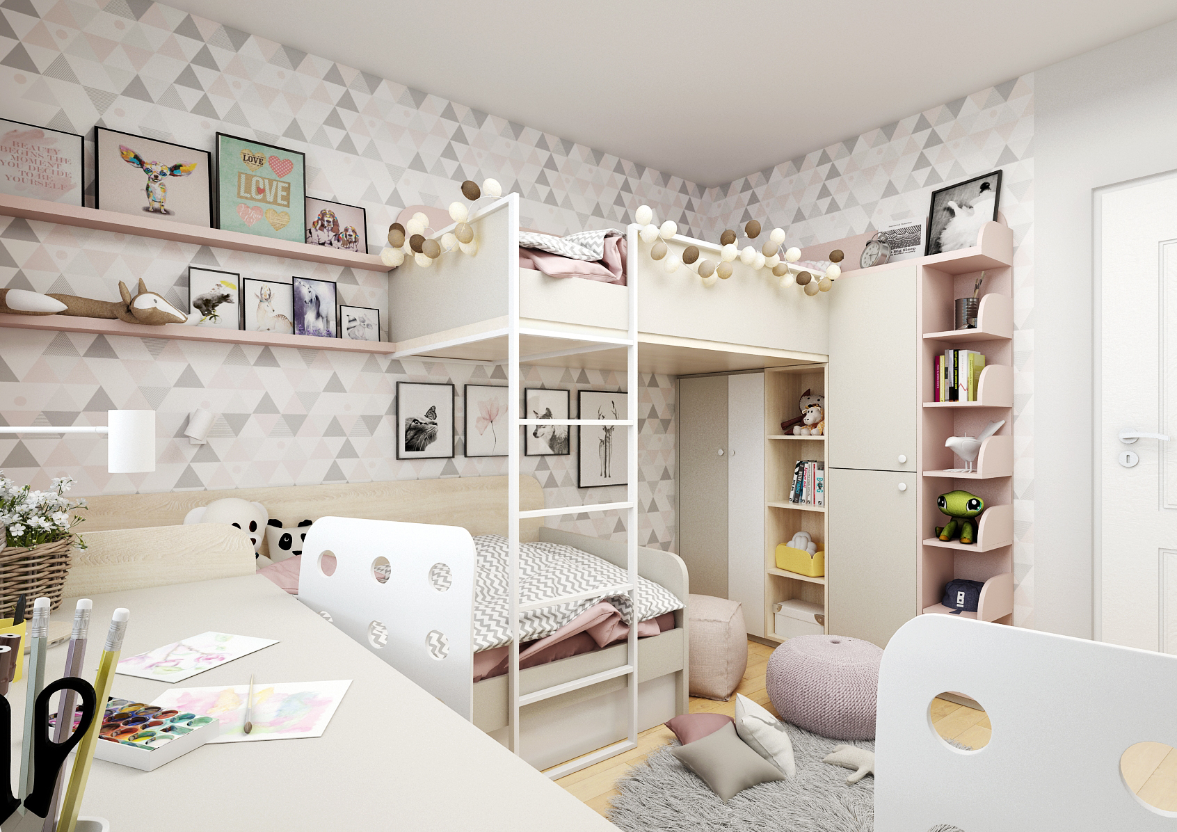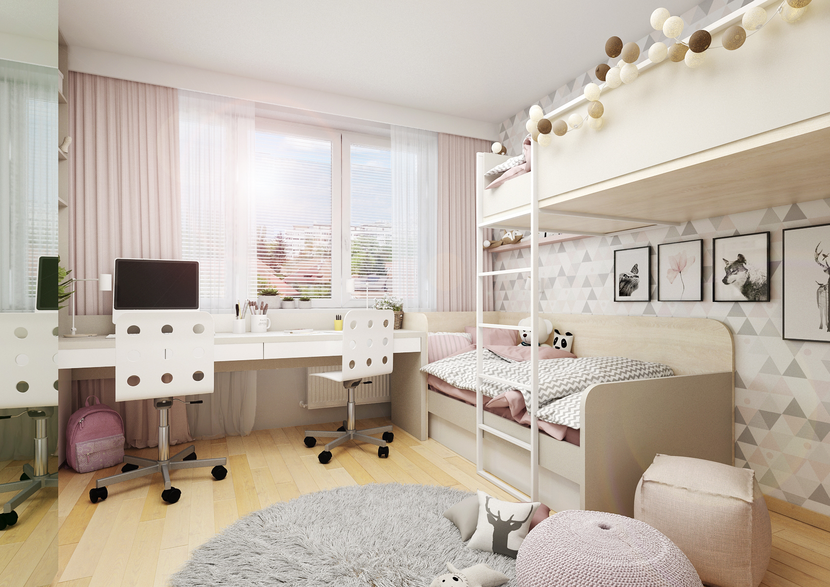 Postel vizuálně přechází do prostorného psacího stolu pod velkými okny, díky kterým mají dívky na práci/učení u stolu dostatek přirozeného světla. Stůl vizuálně přechází do rohové odkládací plochy s policemi nad ní a v meziprostoru se nachází magnetická tabule. V neposlední řadě zde nechybí ani vestavná šatní skříň se zrcadlem.