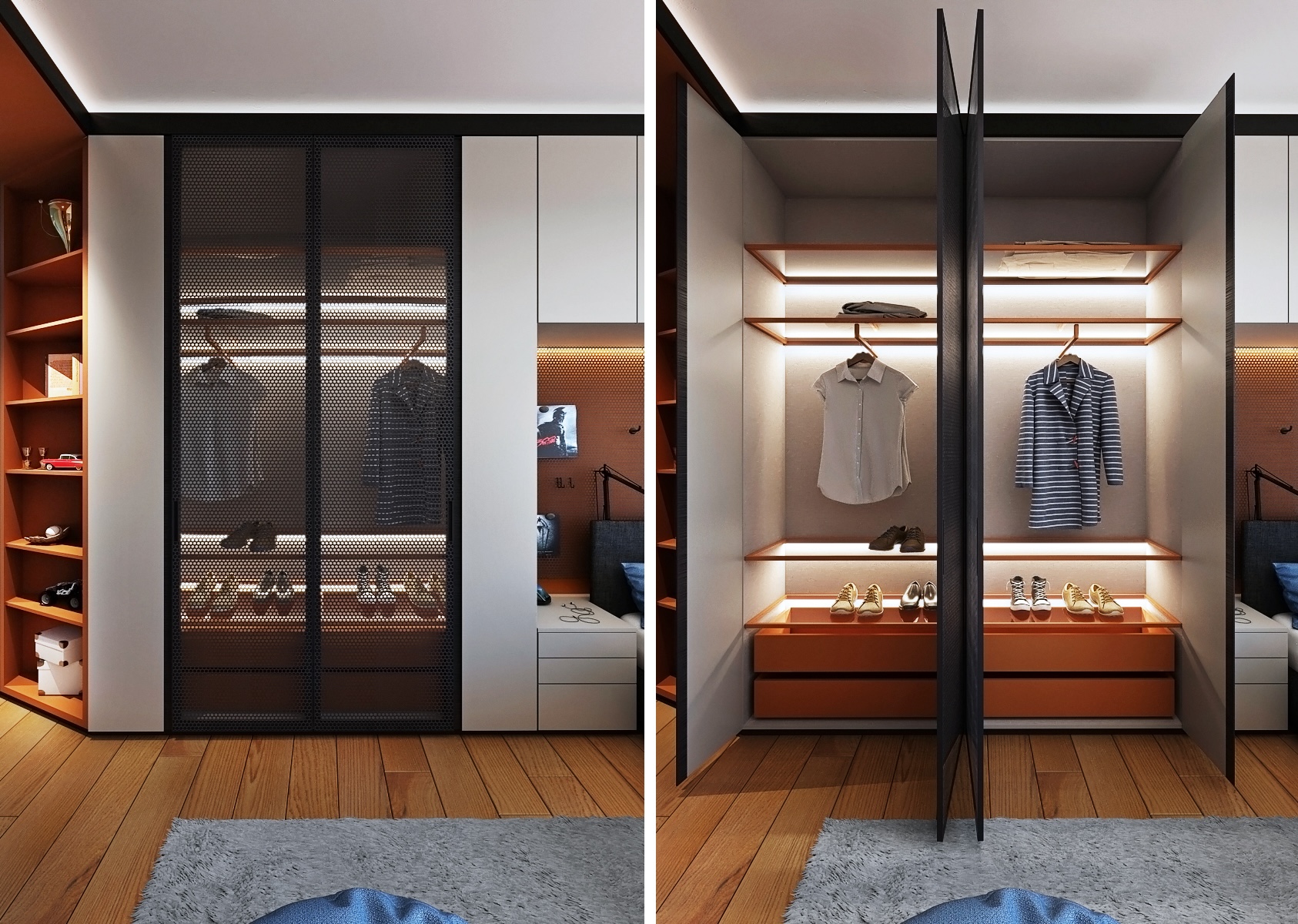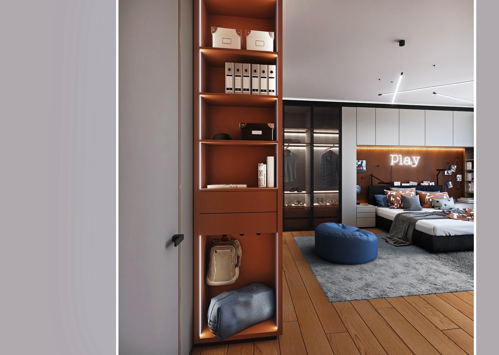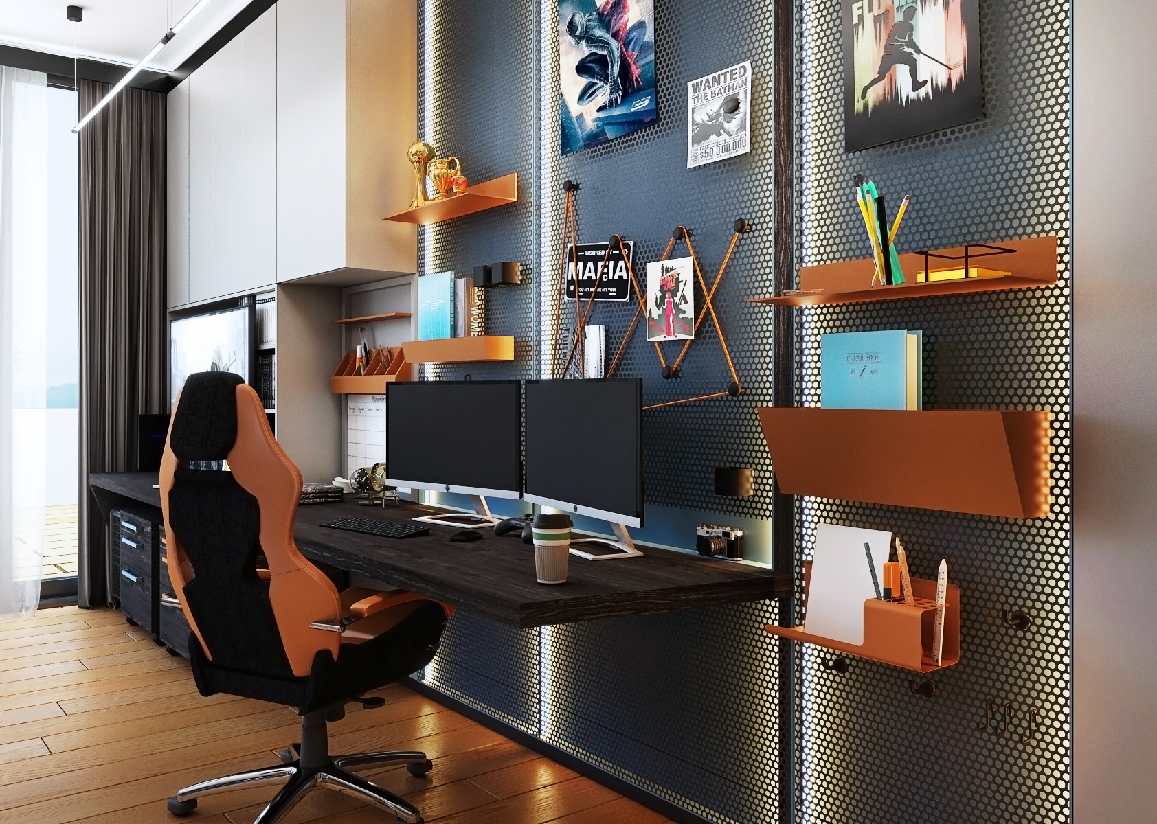 Centrálním bodem je pracovní prostor s velkým, robustním stolem, který poskytuje dostatek místa pro počítač, studijní materiály a osobní dekorace. Stůl je doplněn o ergonomickou kancelářskou židli a obklopen širokými úložnými prostory, včetně regálů a uzavíratelných skříněk, které umožňují snadnou organizaci knih, her a školních potřeb. Výrazný design regálů s perforovaným kovovým panelem a oranžovými akcenty dodává prostoru energii a mladistvý charakter.