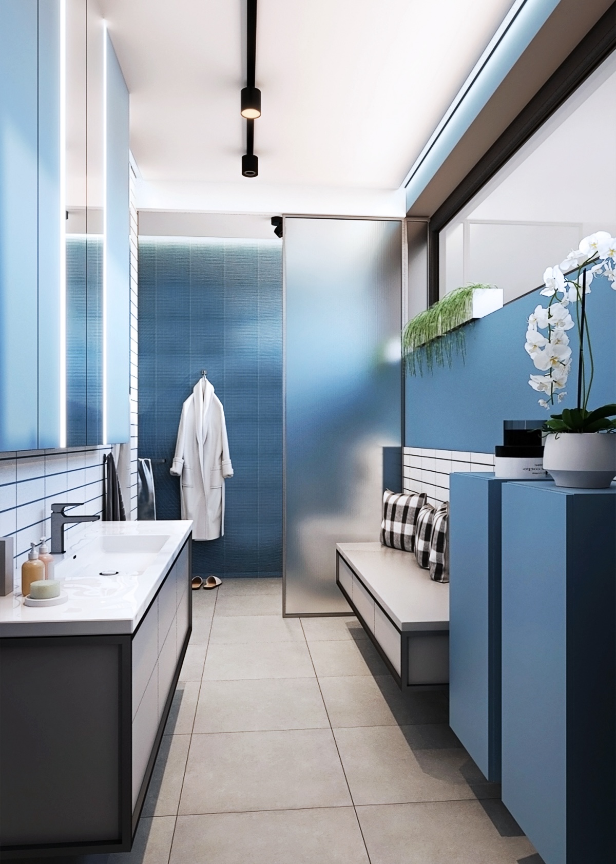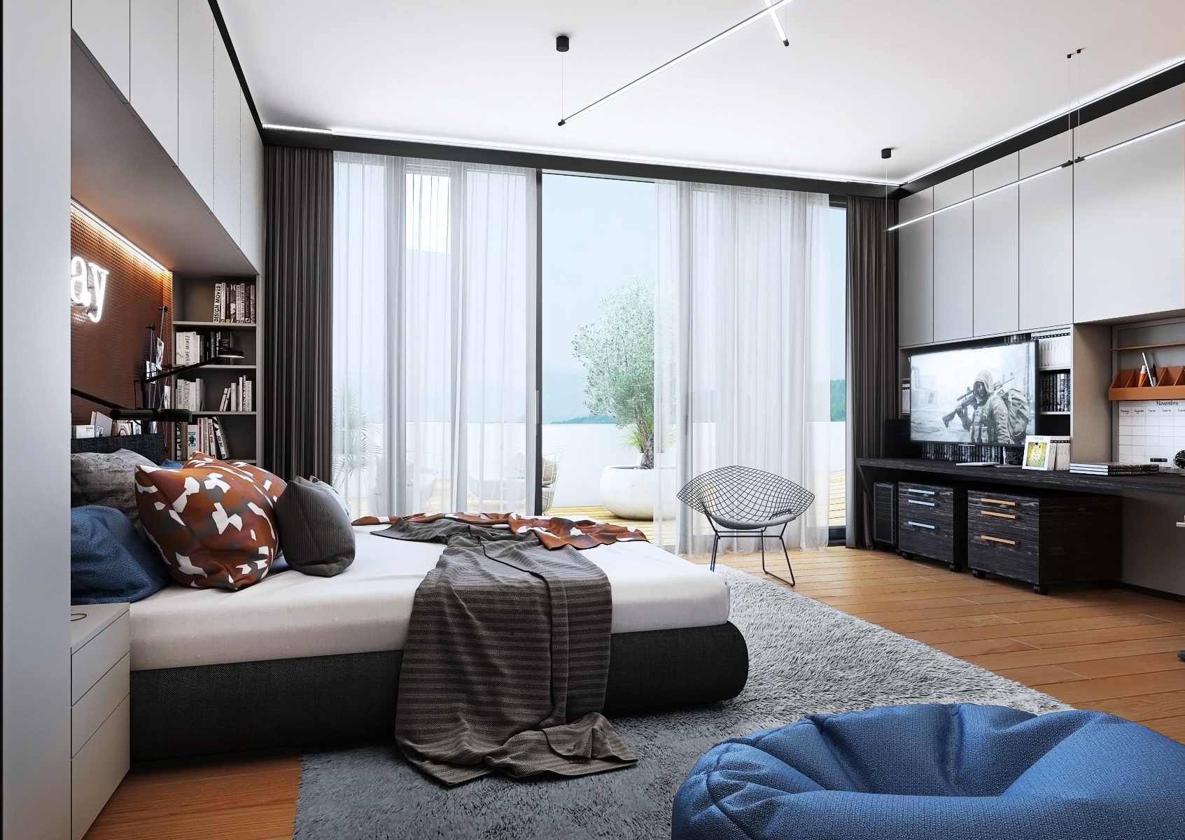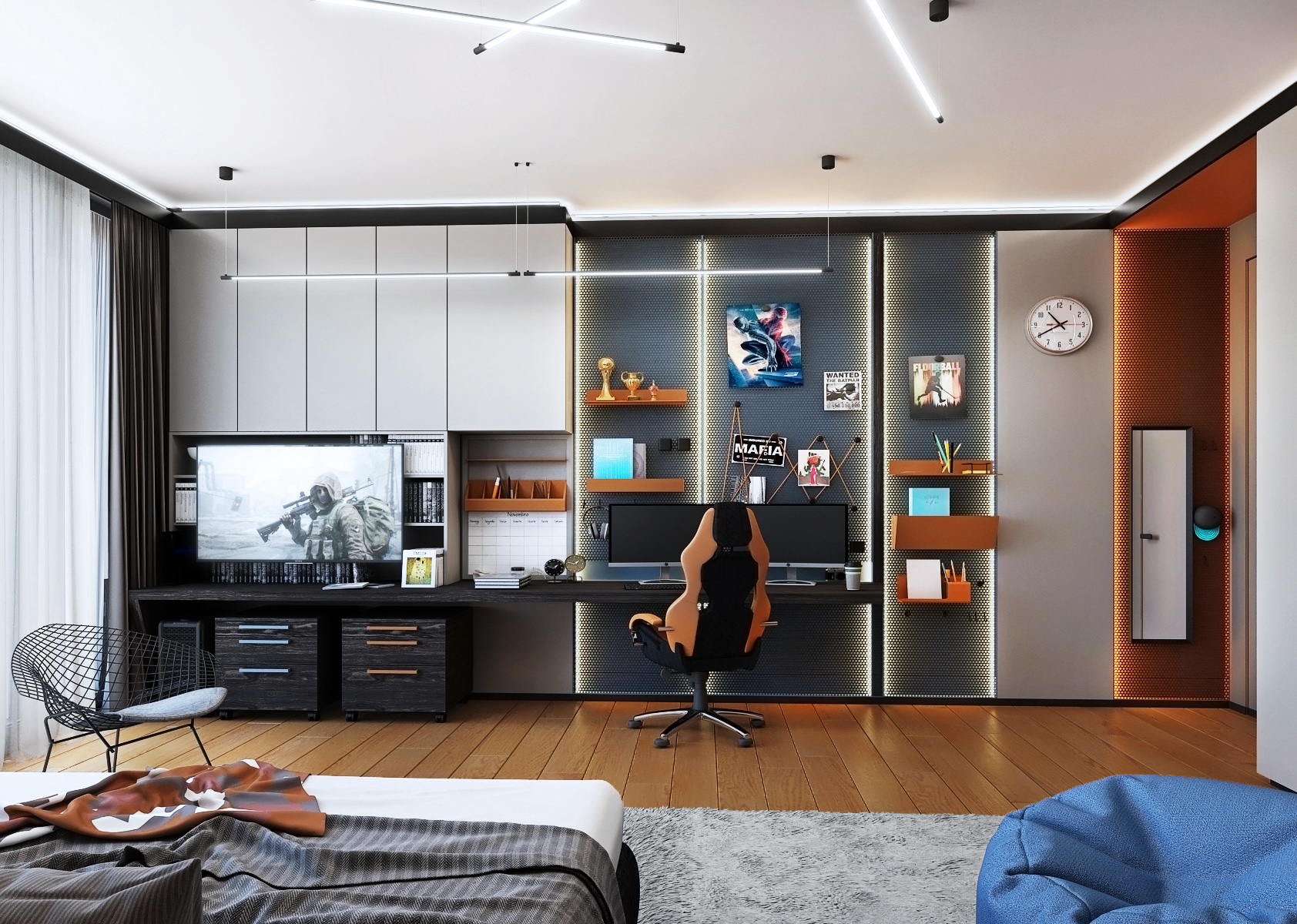 Prostor pro odpočinek je vybaven pohodlnou postelí s kvalitním povlečením, což umožňuje klidný spánek nebo relaxaci při čtení. Protilehlá strana pokoje nabízí zábavnou zónu s velkou televizí, ideální pro hraní videoher nebo sledování oblíbených filmů a seriálů. Pokoj je osvětlen jak přirozeným světlem z okna, tak inovativním LED osvětlením, které může být přizpůsobeno různým aktivitám a náladám. Celkově je tento pokoj pro chlapce dokonale zařízen tak, aby podpořil studium, kreativitu a relaxaci.