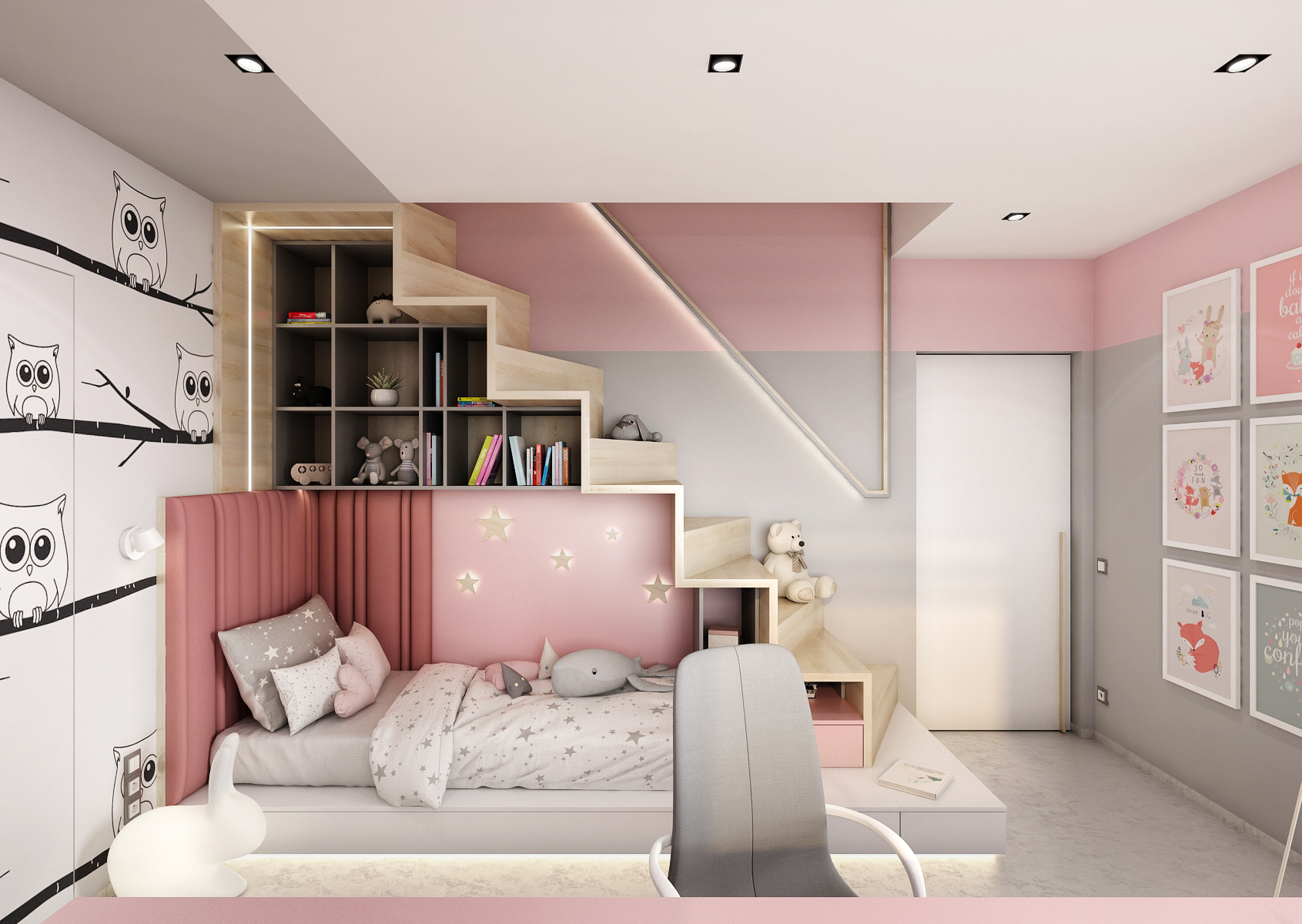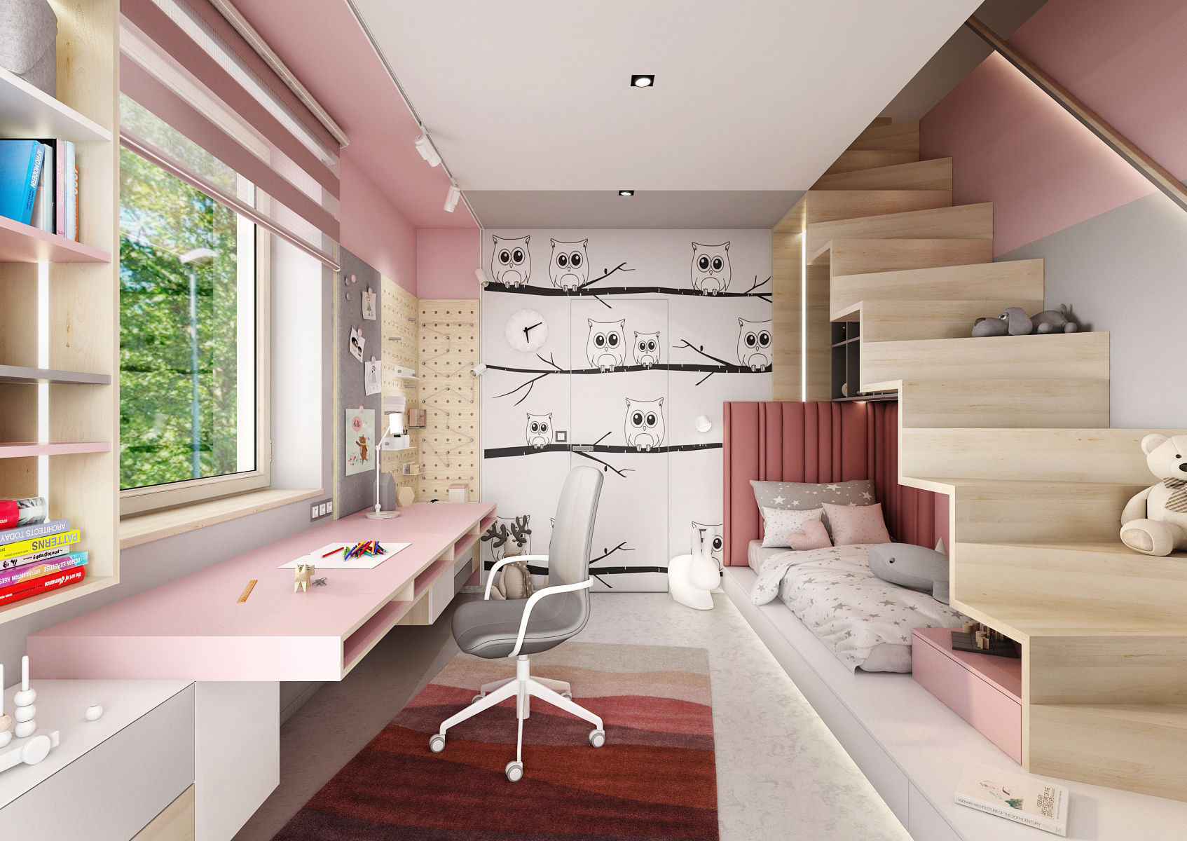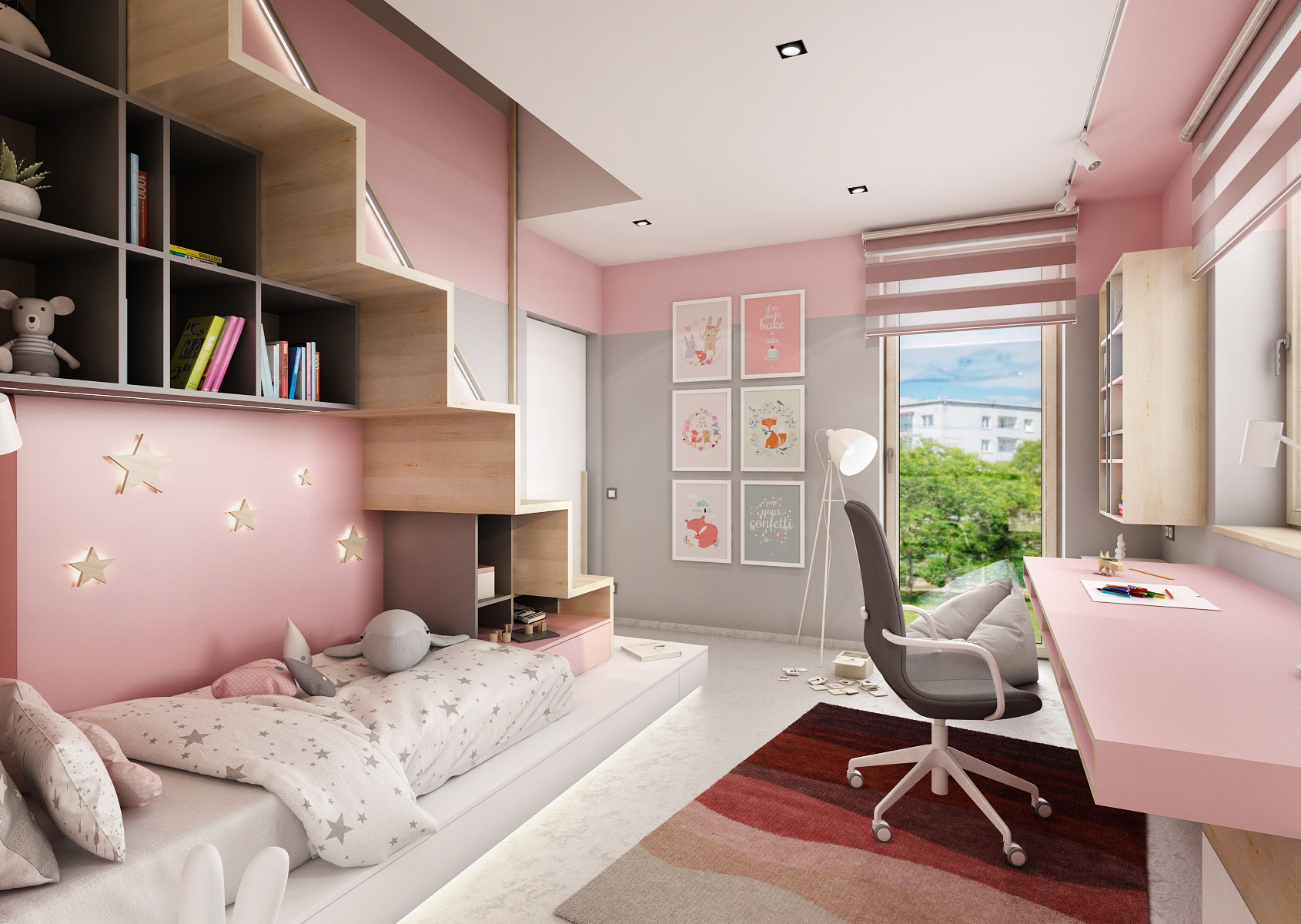 Dětský pokoj pro mladou slečnu je laděn do růžové barvy v kombinaci s šedou výmalbou a hravou tapetou.