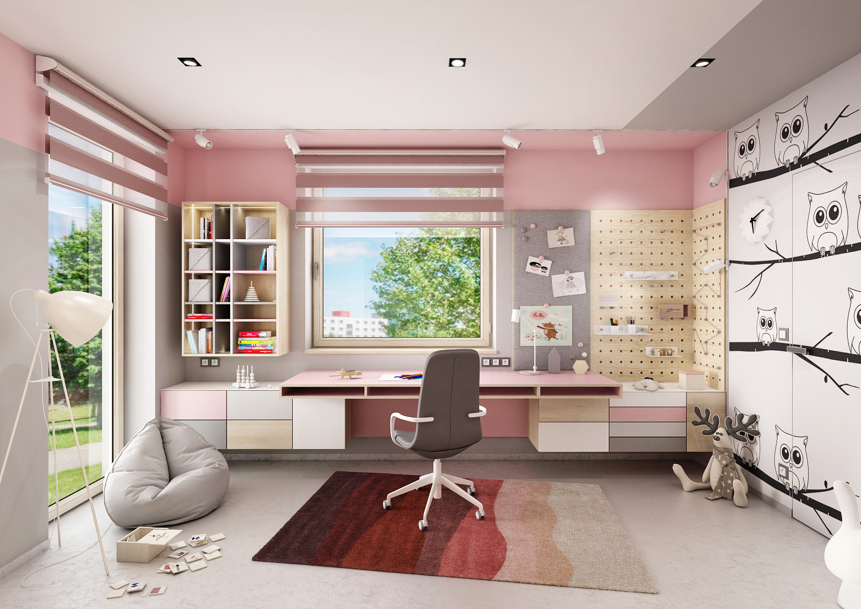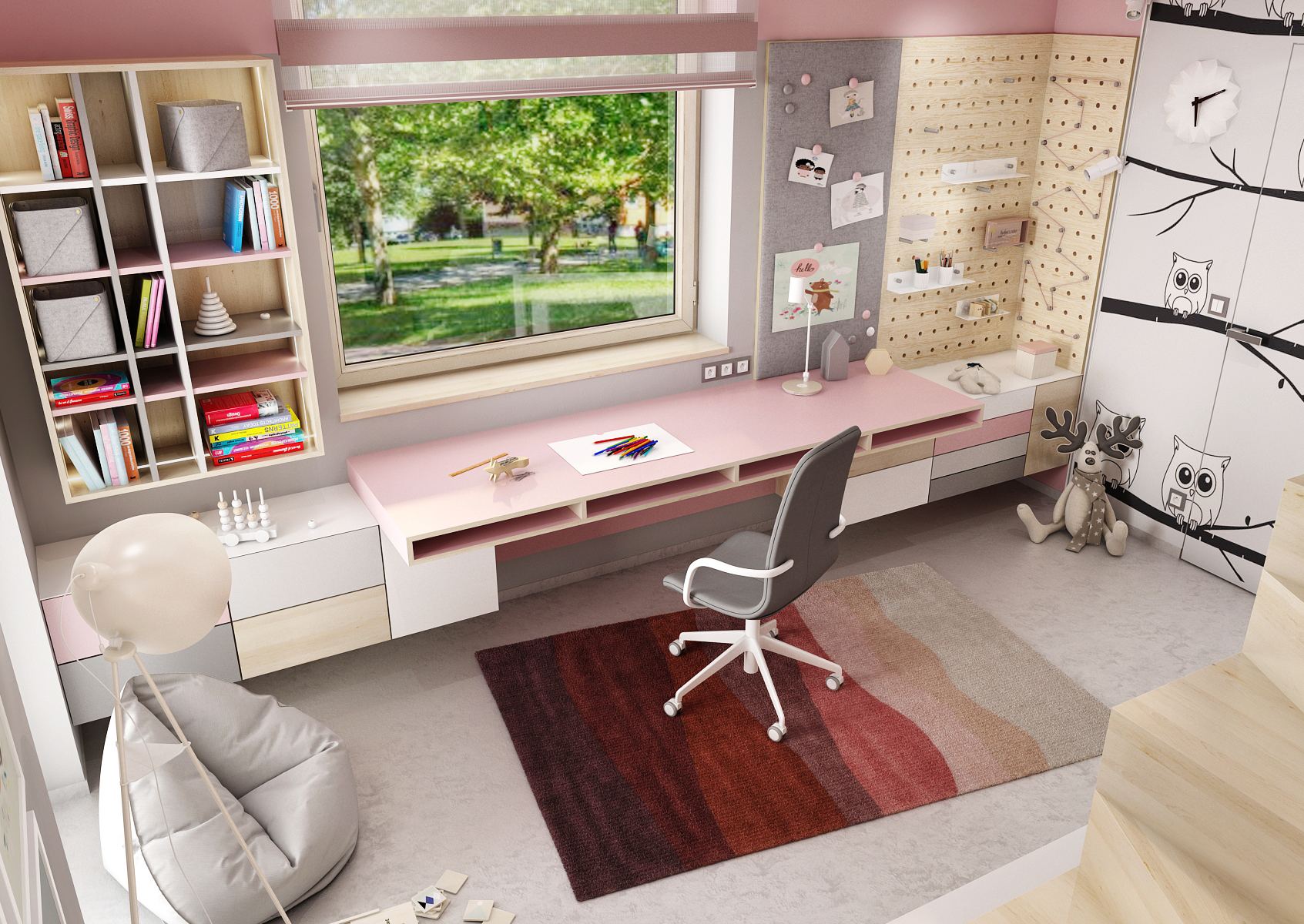 Spodní část pokoje je vybavena psacím stolem po celé délce stěny s otevřeným odkládacím prostorem a zásuvkami v části pod stolem. Stěnu kolem zdobí dřevěný perforovaný panel, do kterého je možné umístit různé doplňky v podobě různých poliček, háčků či dóz. Vedle perforovaných panelů je umístěna čalouněná nástěnka.
