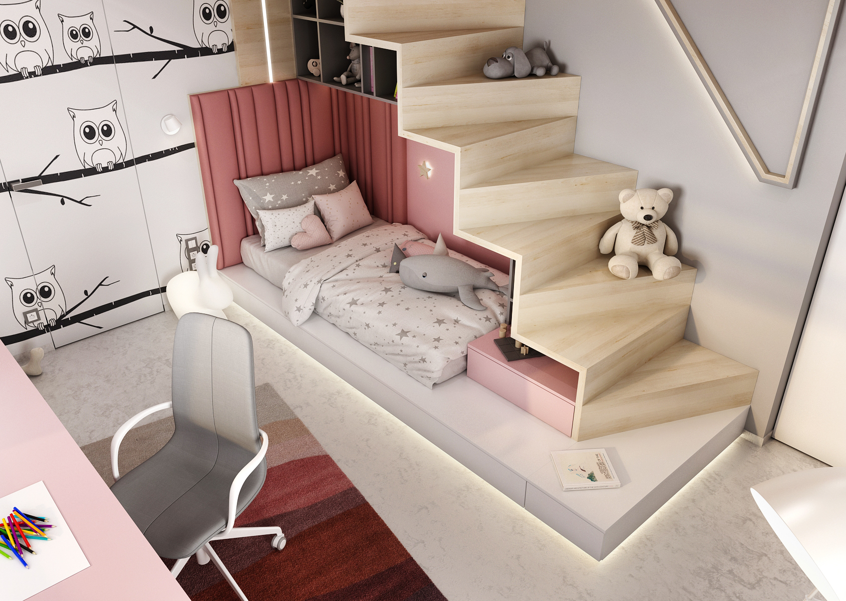 Prostor pod nepravidelnými schody je využit jako místo pro lůžko na vyvýšené ploše s čalouněným panelem místo postelového čela. Nad lůžkem je připevněna otevřená knihovna kopírující tvar schodů s LED osvětleným.