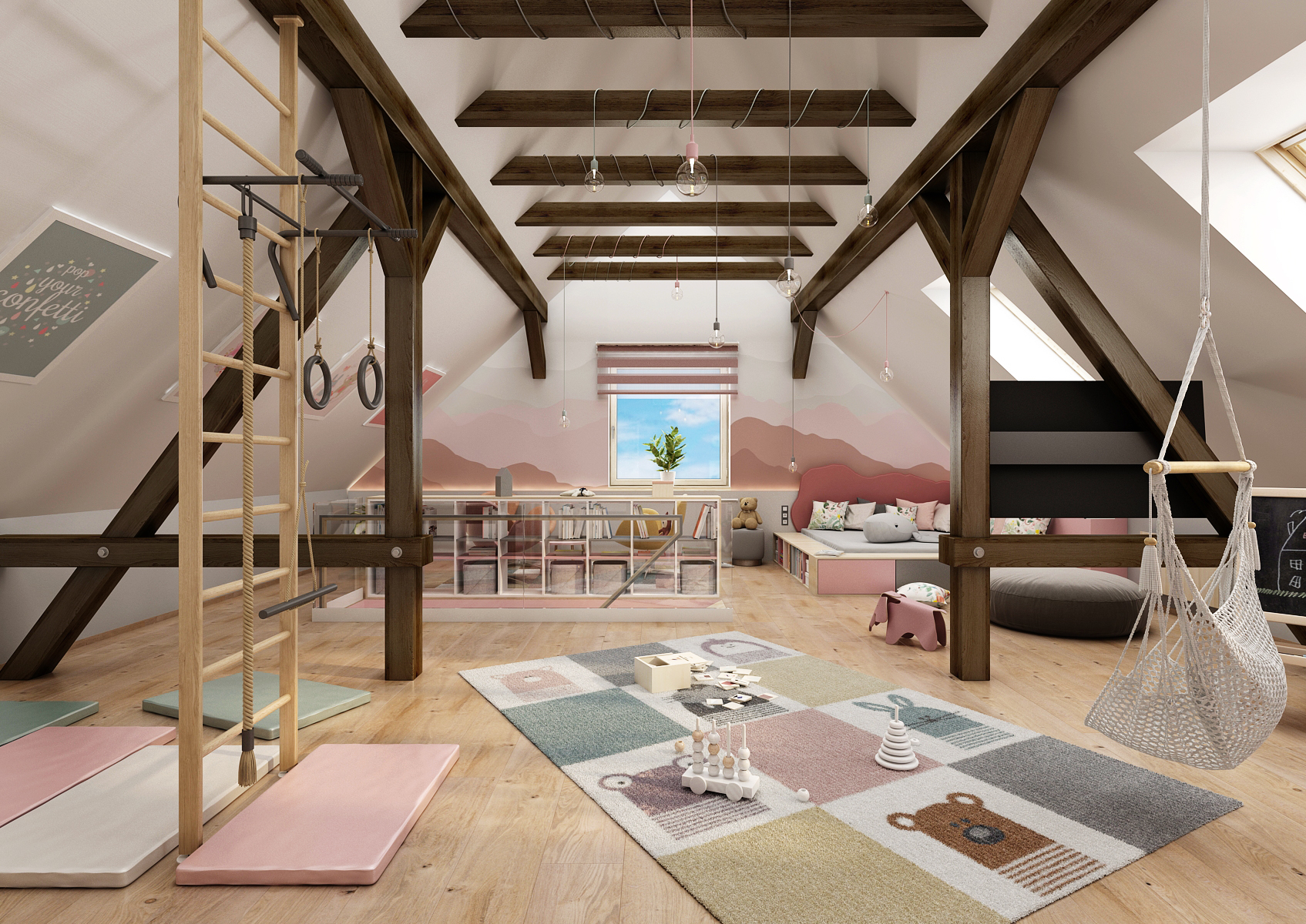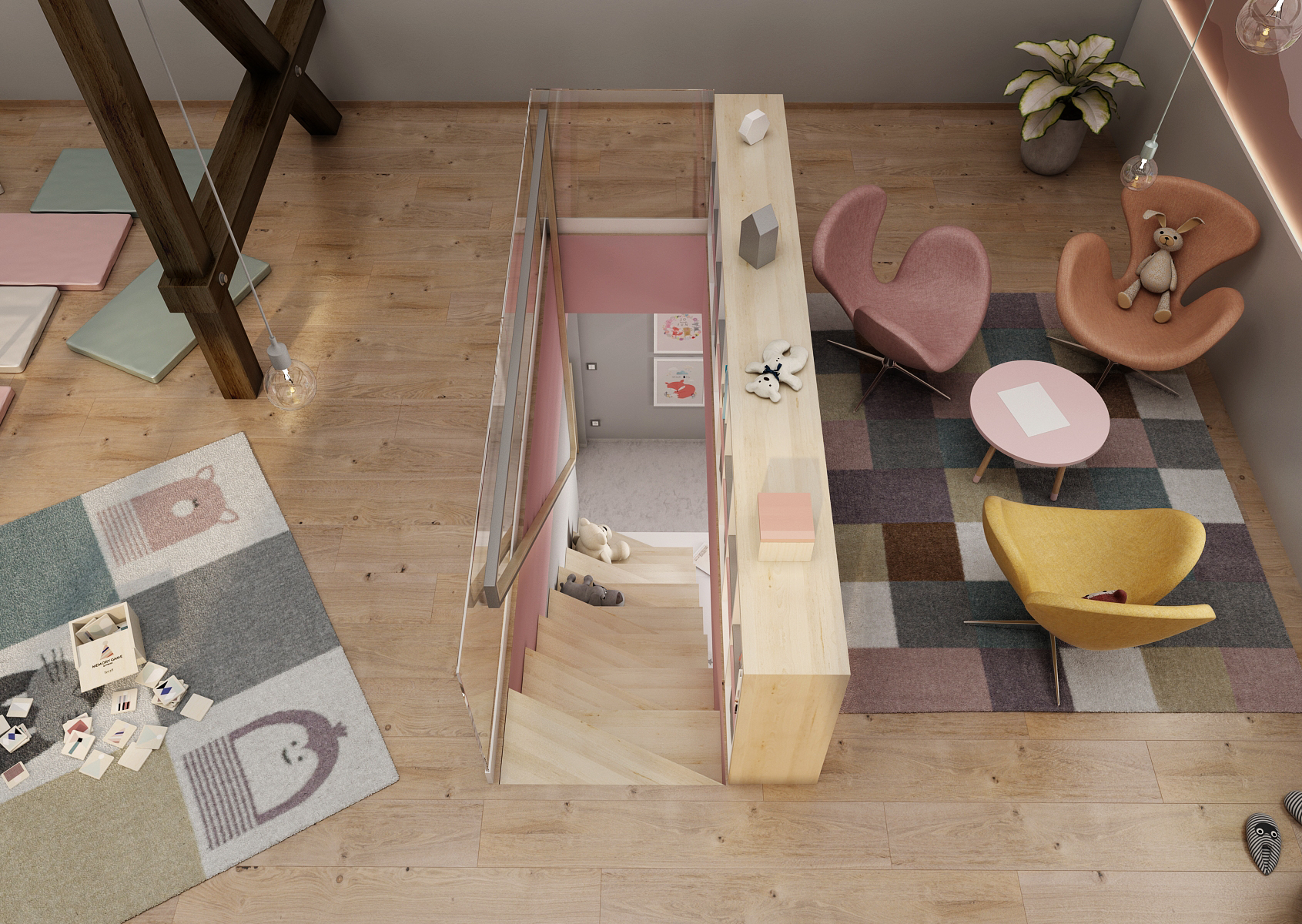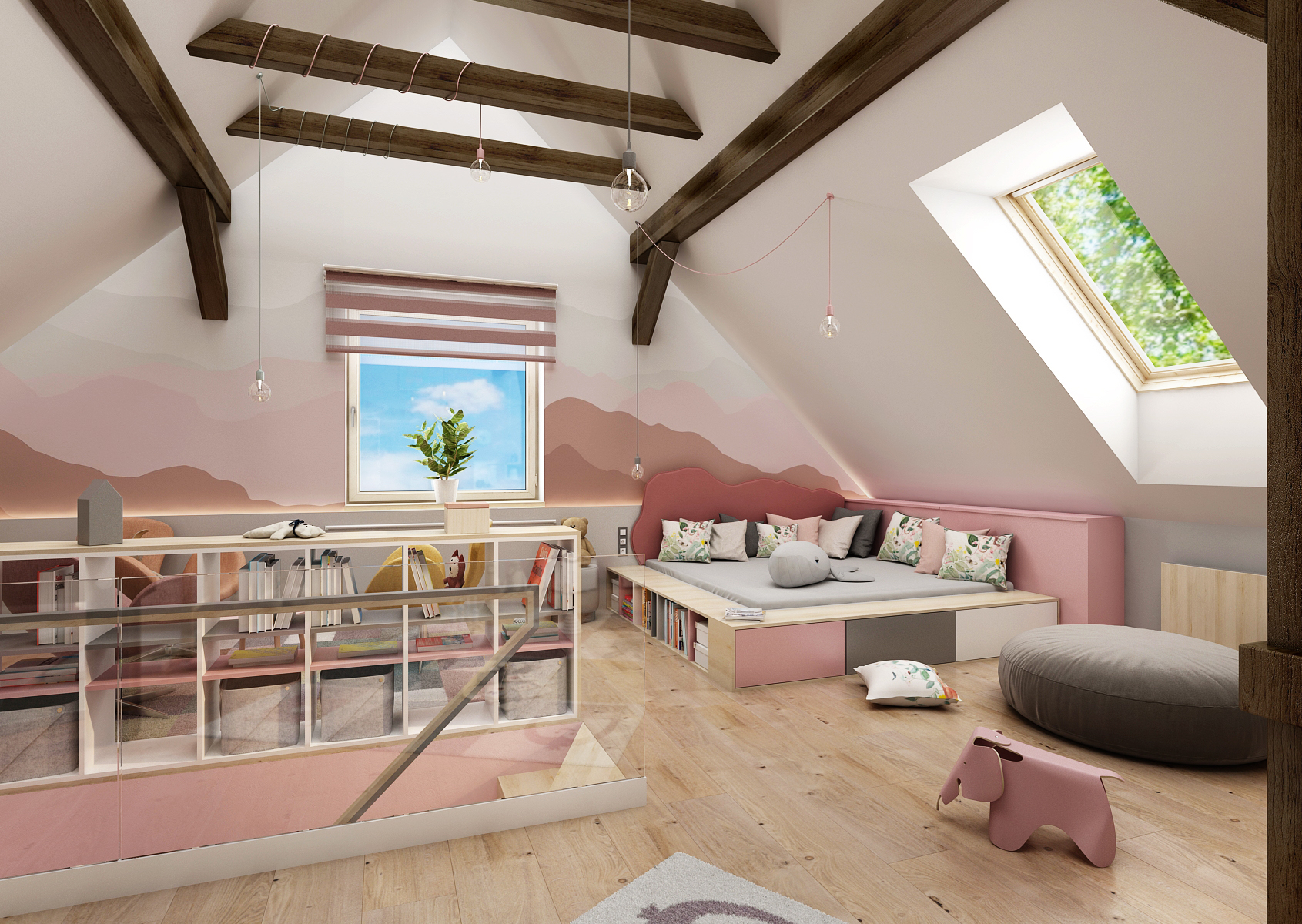 Půdní výstavba přestavěna na dětskou hernu je přístupná právě díky nepravidelnému schodišti se skleněným zábradlím v horní části a otevřenou knihovnou. Dětská herna nabízí možnost posezení přímo u okna, prostor k relaxaci v podobě provizorního lůžka, houpačku, ale i žebřiny či kruhy. Využity jsou zde i přiznané stropní trámy, na kterách jsou namotána závěsná svítidla v podobě žárovek.