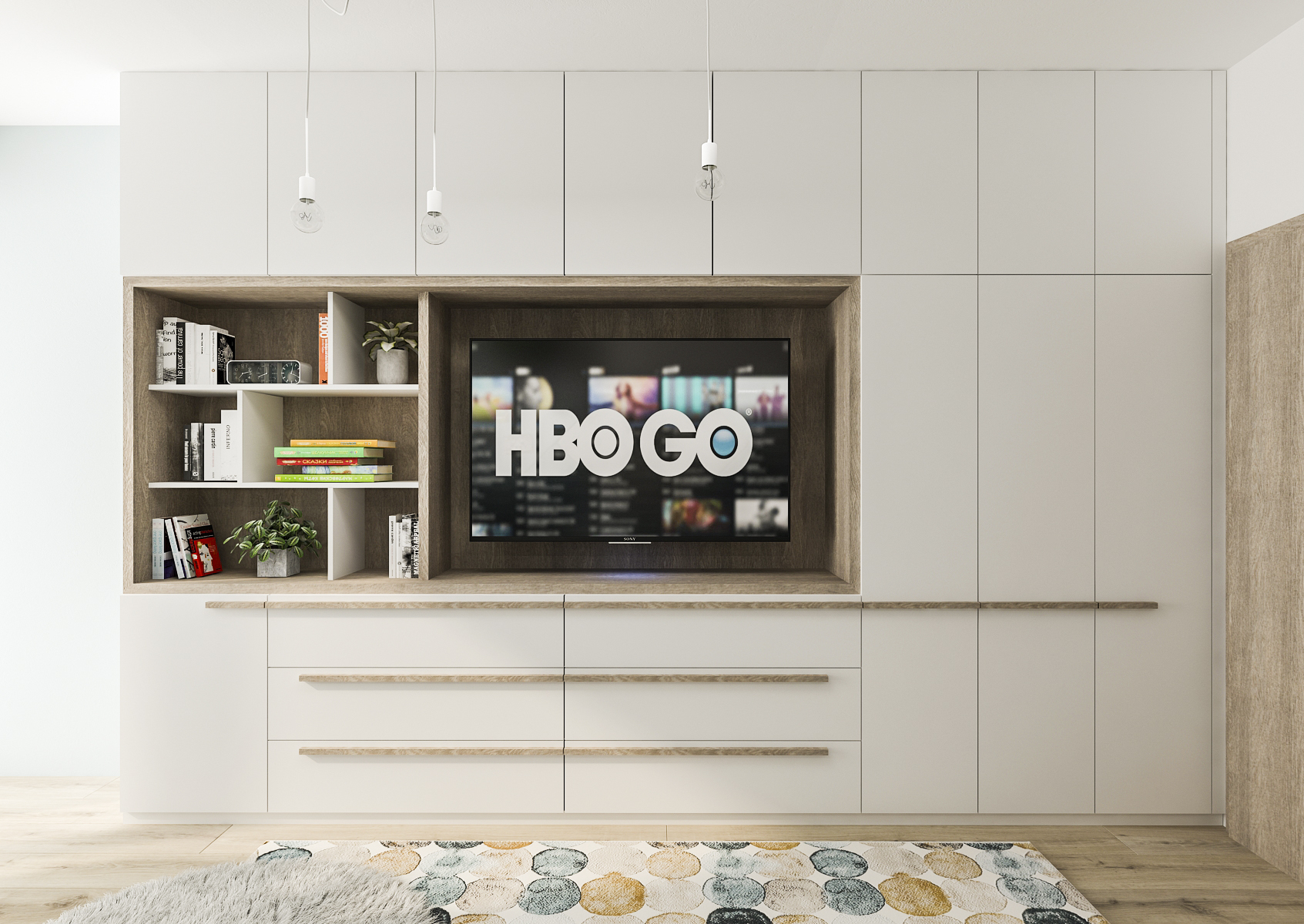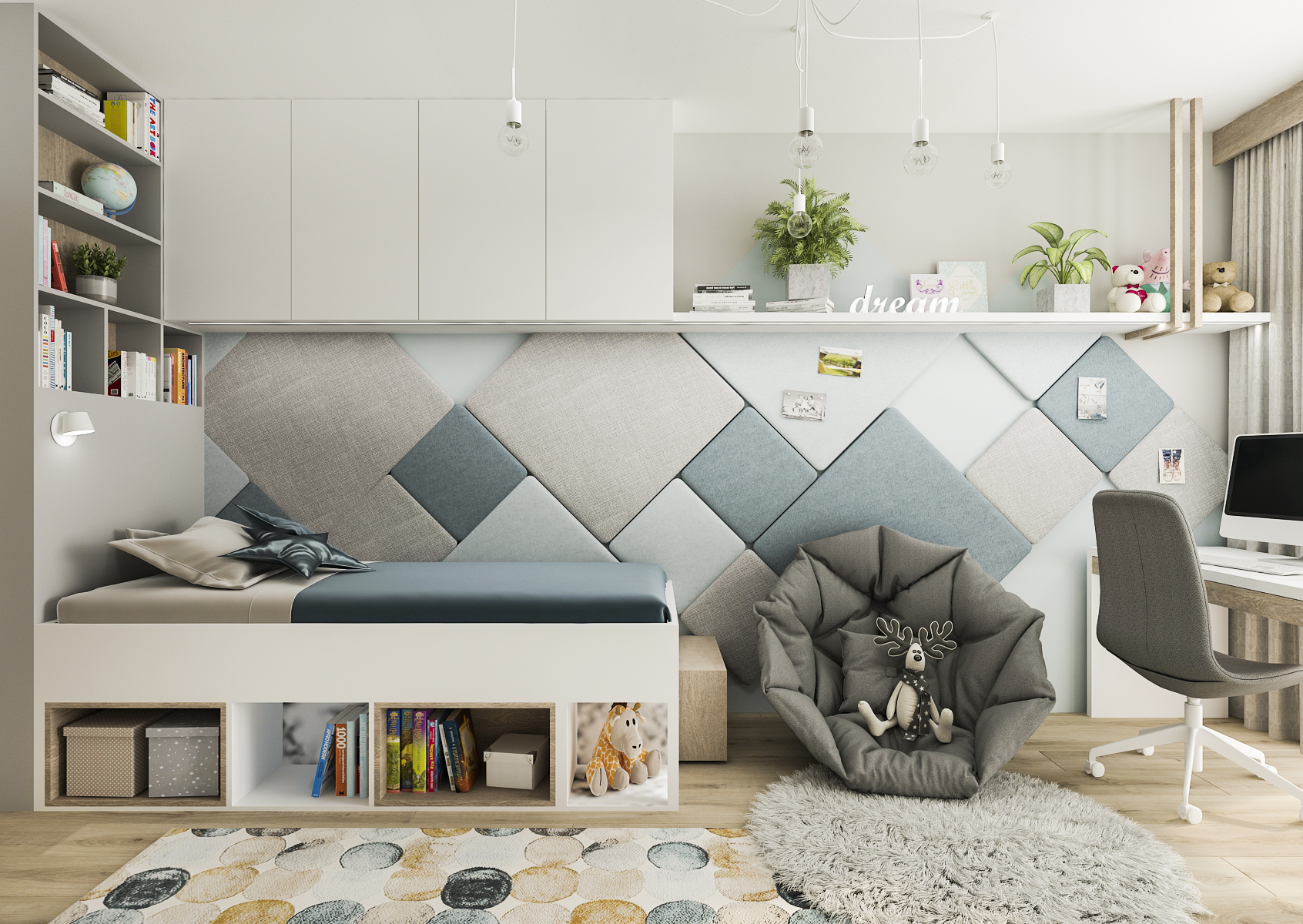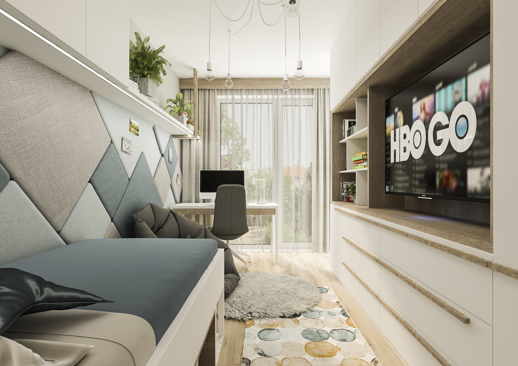 Zeď je obložena čalouněnými čtverci různých velikostí a barev, které mohou zároveň sloužit i jako nástěnka a táhne se až po okno, u kterého je umístěn psací stůl a sedací pytel sloužící k odpočinku například u televize umístěné ve výklenku vestavěné skříně na protější zdi.