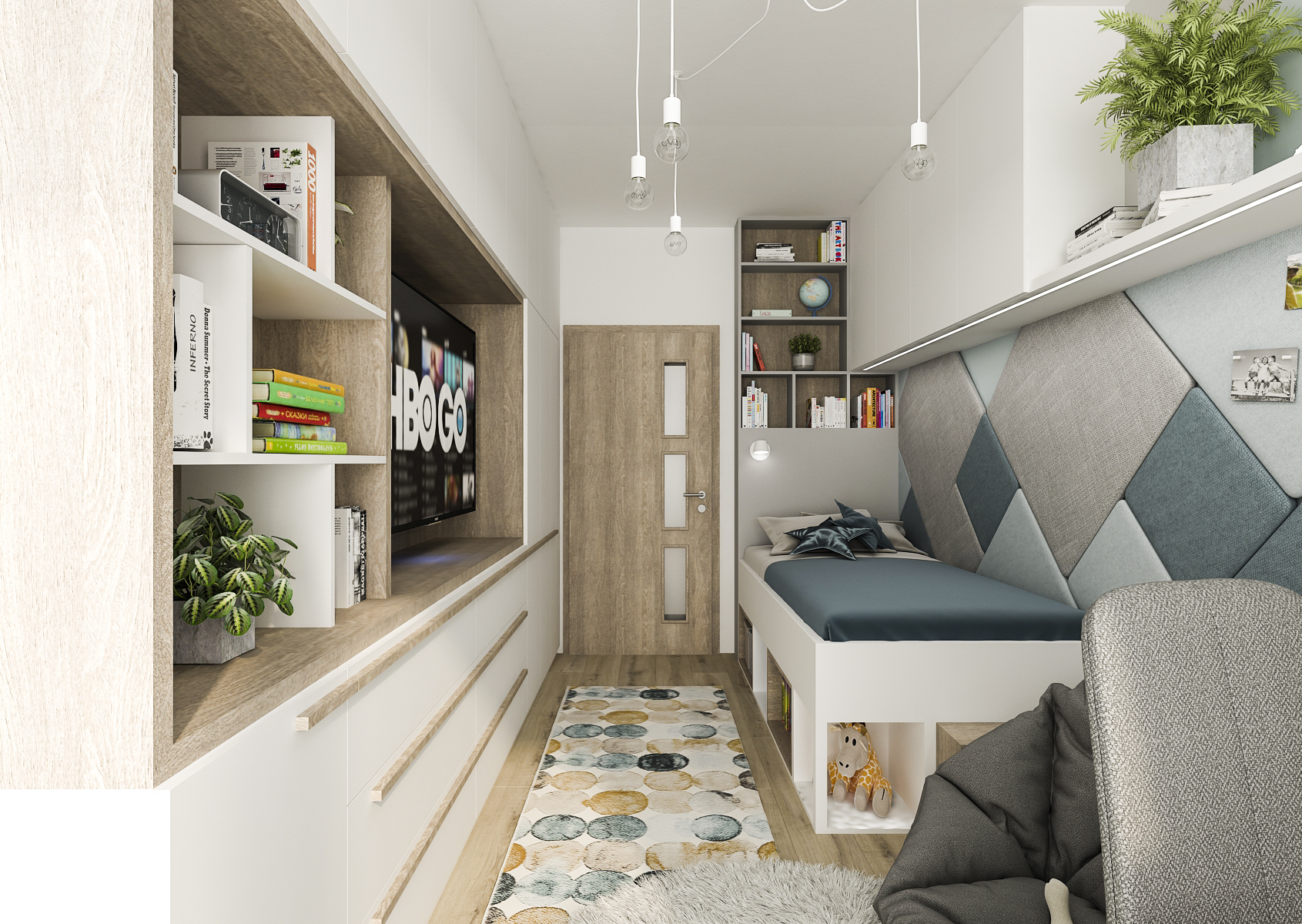 Obdélníkový studentský pokoj překypuje možnostmi úložného prostoru, a to nejen v oblasti lůžka, ale i v podobě dlouhé vestavěné skříně po celé délce protější zdi. Vyvýšené lůžko nabízí úložný prostor jak ve spodní části konstrukce, tak i v policové části nad postelovým čelem, která přechází v horní skříňky a police.