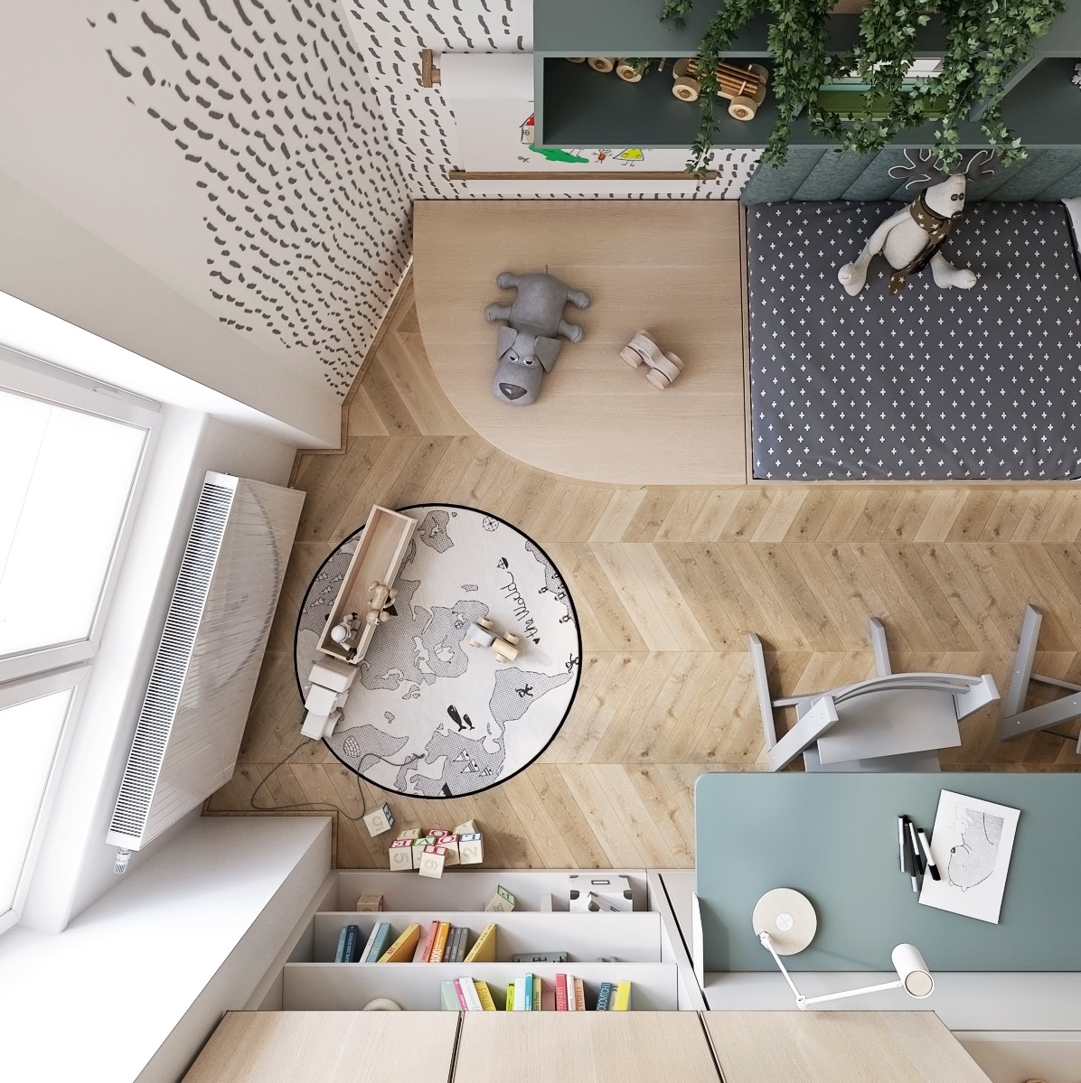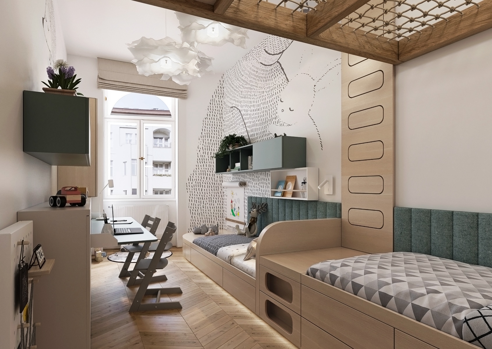 Prostor je vybaven dvěma vestavěnými lůžky umístěnými na opačných stranách pokoje, což maximalizuje dostupný prostor pro hraní a učení. Lůžka mají praktické úložné prostory v podobě zakomponovaných vestavných skříní a šuplíků pod nimi. Na jednom konci pokoje je umístěno pracovní místo s plochou pro domácí úkoly nebo kreativní aktivity, které je dobře osvětleno díky strategickému umístění vedle okna. Interiér je zdobený jemnými pastelovými barvami a dřevěnými prvky, což vytváří teplou a přívětivou atmosféru.
