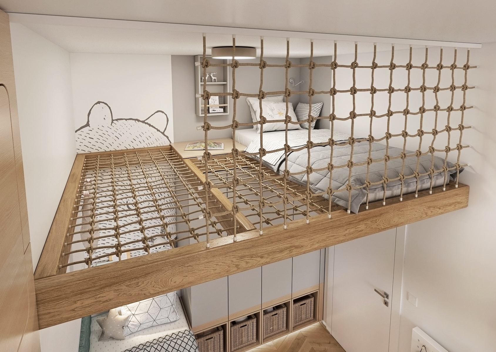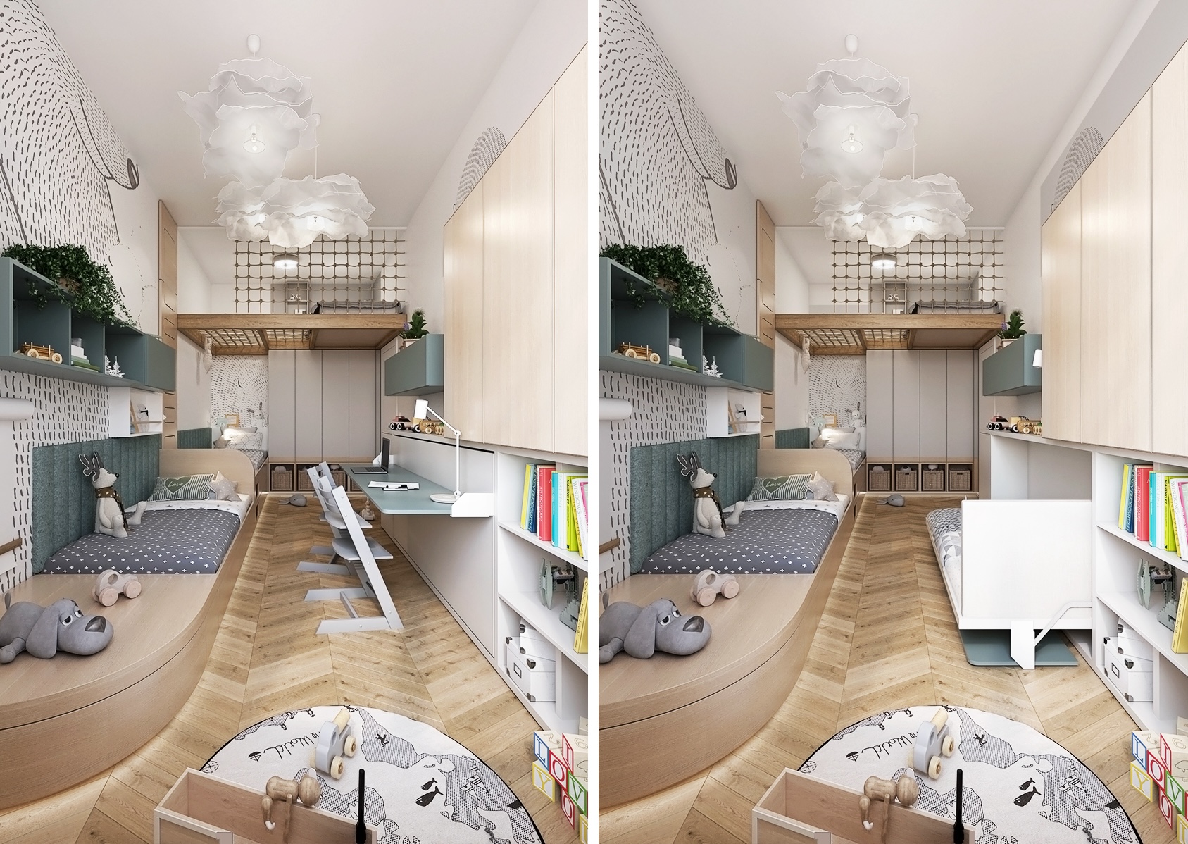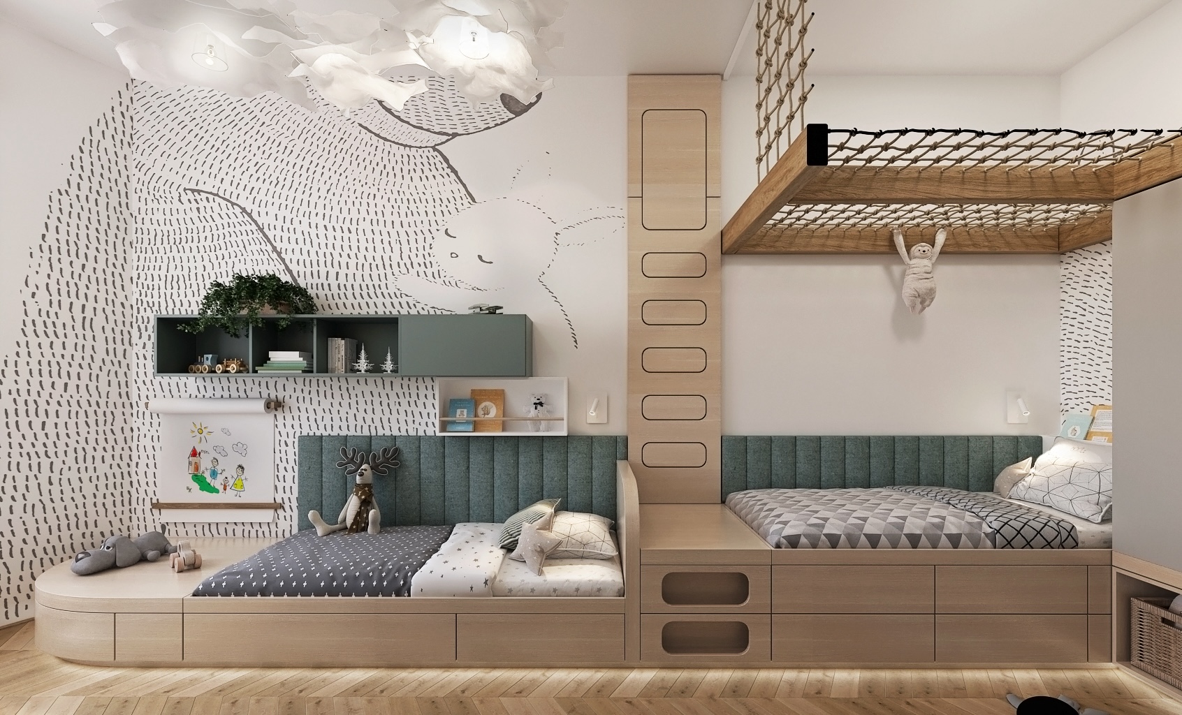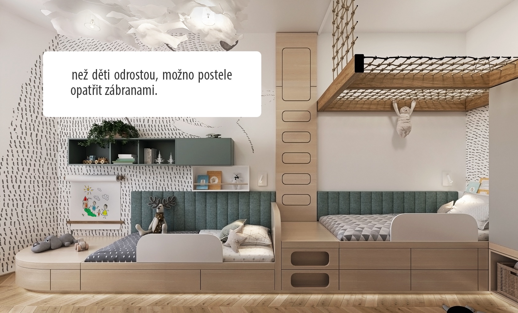 Vedle lůžek a pracovního prostoru je pokoj vybaven také mnoha regály a úložnými prostory, které jsou snadno přístupné i pro malé děti. Nad lůžky jsou zavěšena nápaditá svítidla ve tvaru oblaků, což dodává pokoji kouzelnou a hravou atmosféru. Design je doplněn o tematické dekorace jako je například koberec, který zdůrazňuje dětský motiv celého prostoru. Toto promyšlené uspořádání a design činí tento pokoj nejen esteticky přitažlivým, ale i velmi praktickým pro každodenní používání a rozvoj dětí.