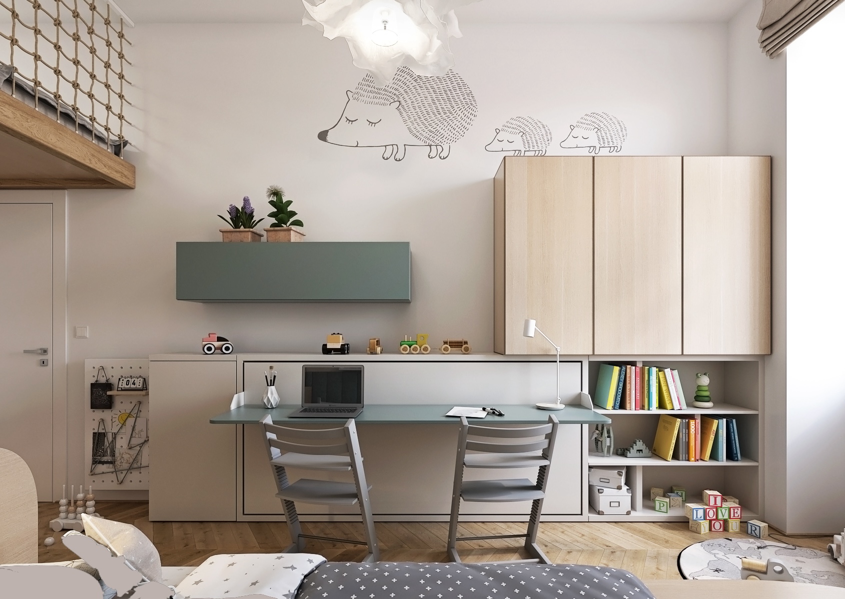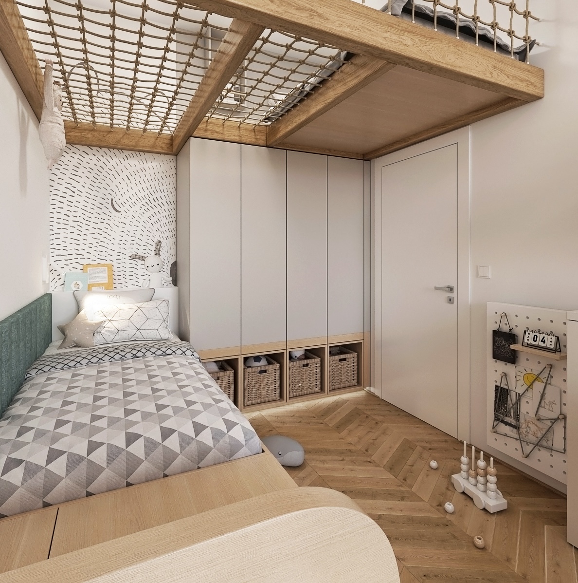 Tento dětský pokoj je navržen tak, aby poskytoval kombinaci funkcionality a příjemné estetiky, což je ideální pro rodiny s dětmi.