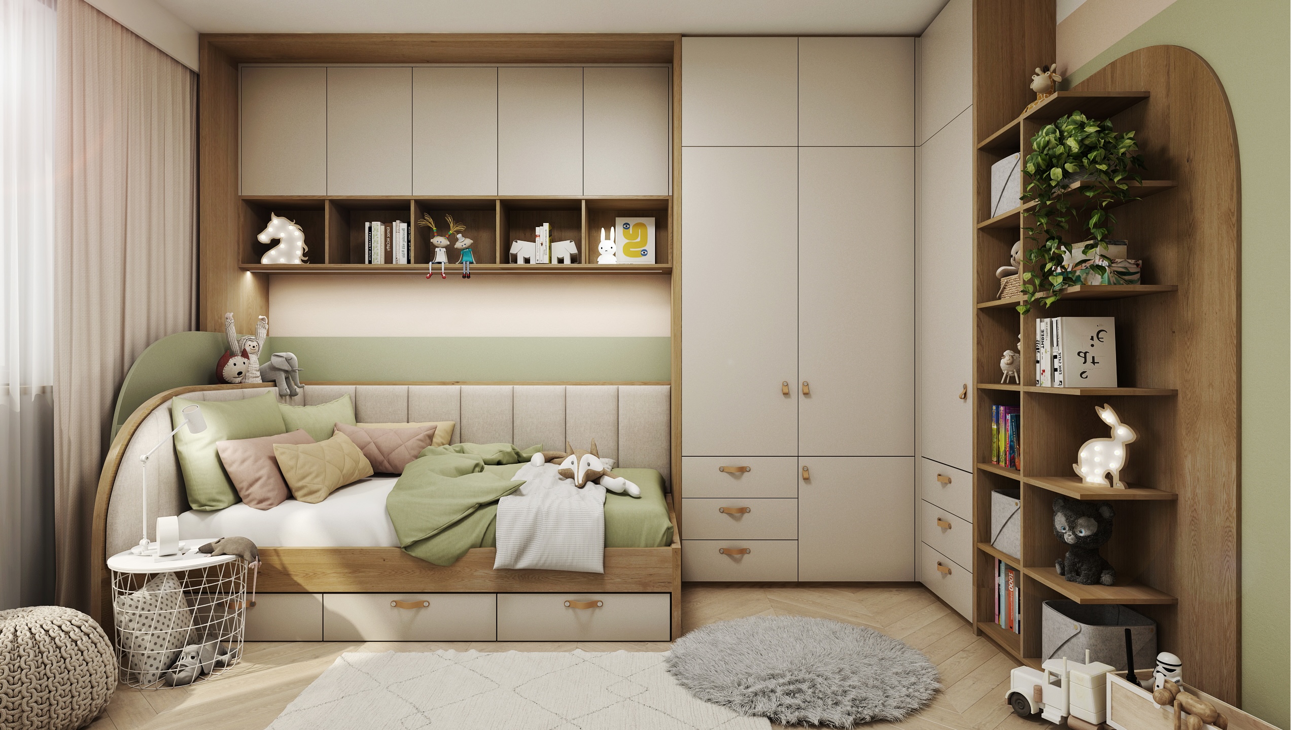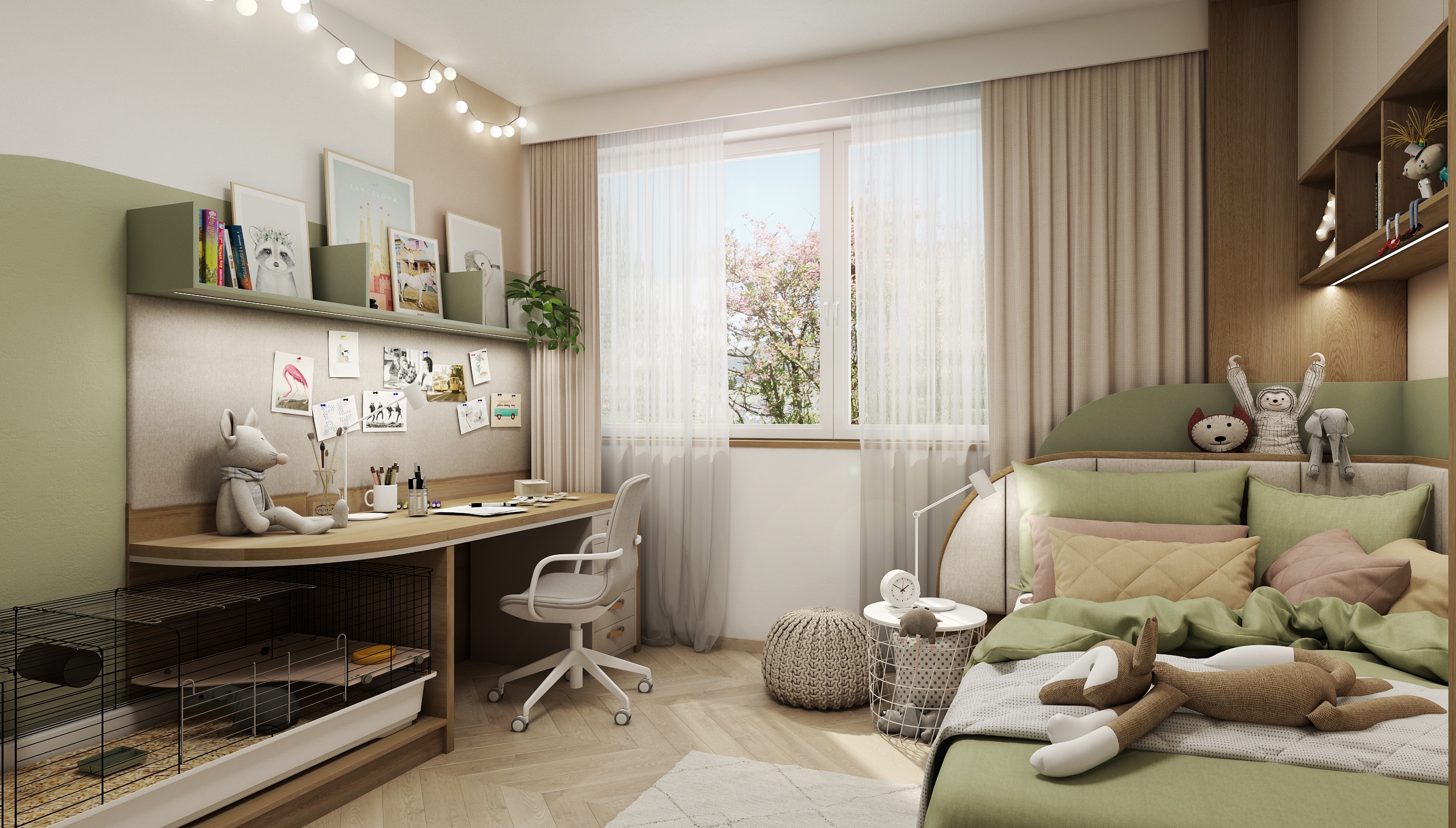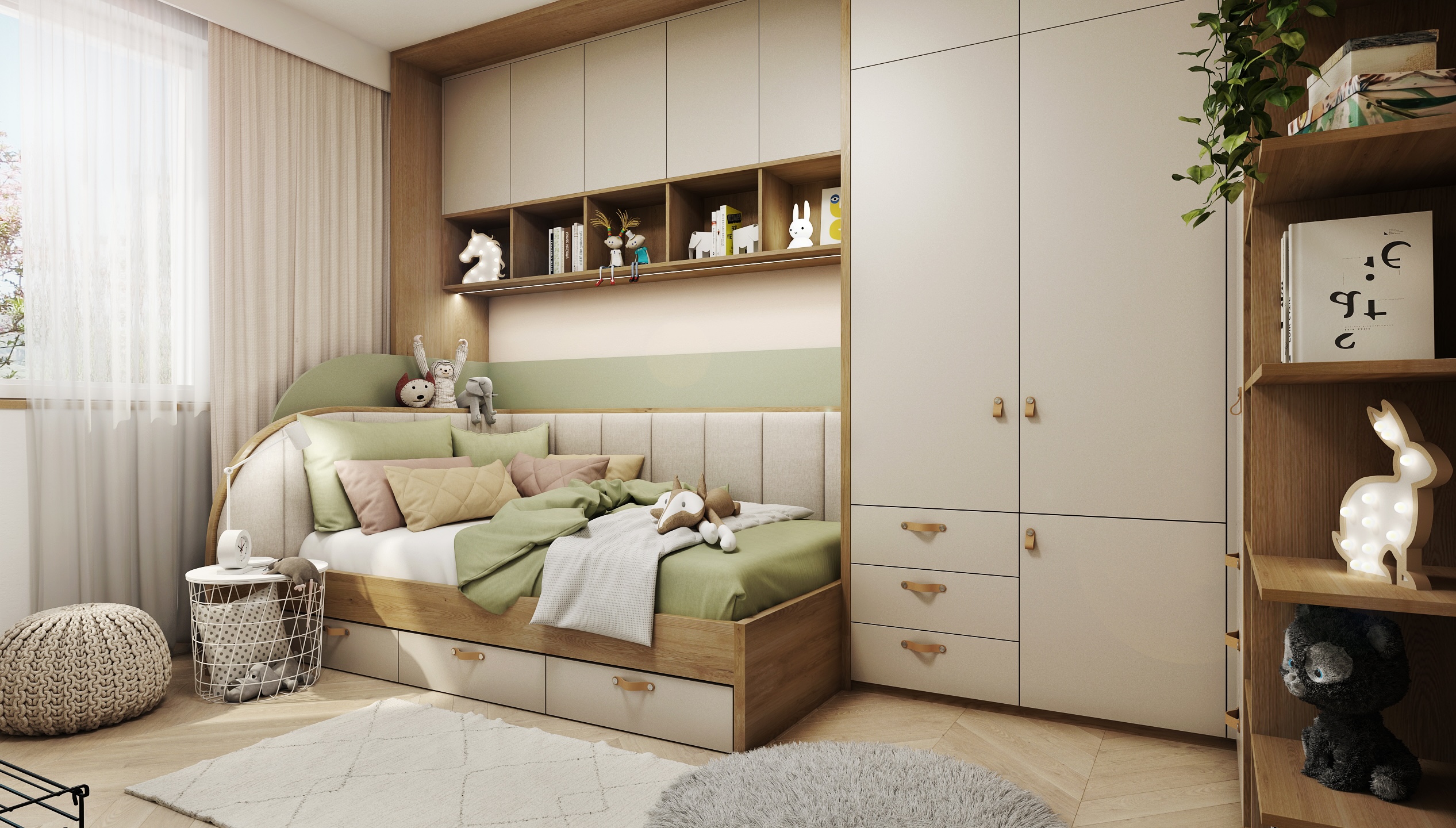 Vestavěný nábytek chytře kombinuje spaní, úložné prostory i místo pro hru a tvoření. Pokoj je navržen tak, aby s dítětem rostl – zůstává praktický, ale stále si zachovává hravou a laskavou atmosféru.