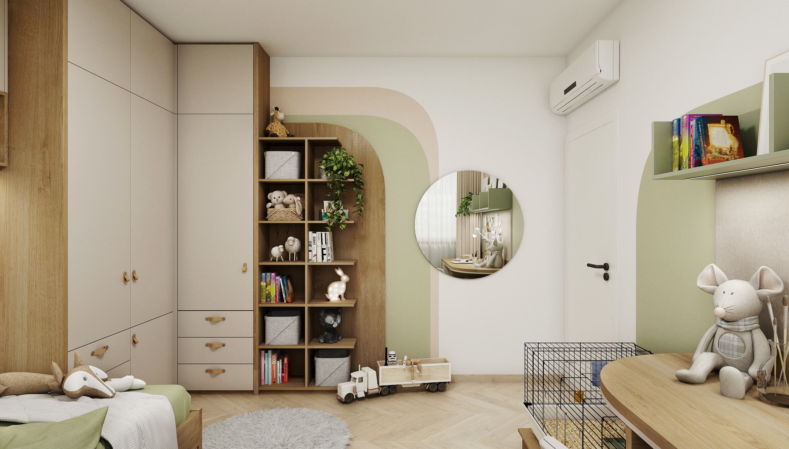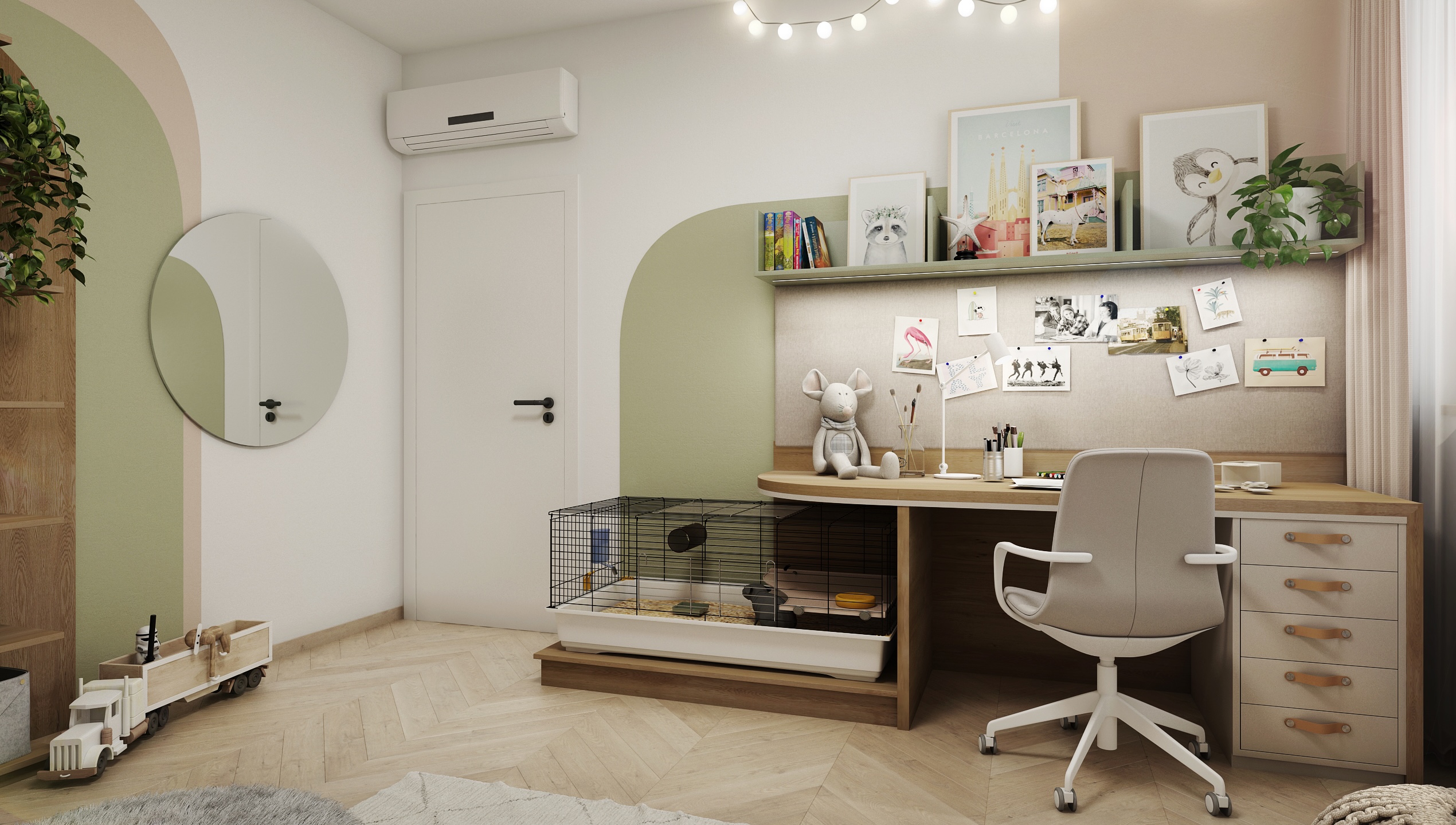 Pokoj působí klidně a útulně díky jemné paletě béžových a zelených tónů, které doplňuje přírodní dřevo. Oblé tvary nábytku a měkké textilie vytvářejí bezpečné prostředí, kde se holčička může cítit v klidu a pohodě.
