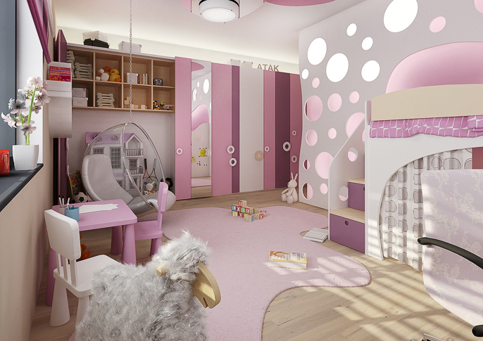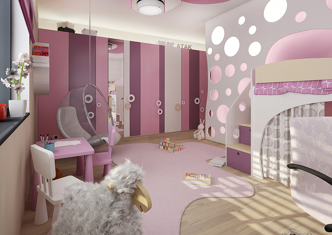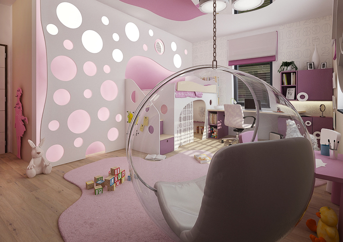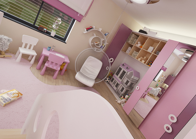 Holčičí barva je jasně růžová, snad každá princezna si přeje mít tuto barvu v pokoji. Pod zvýšeným lůžkem se nachází domeček. Netradiční dekorací pokoje je podsvětlená stěna s otvory, ty poslouží i jako lezecká stěna. Dalším důležitým prvkem je zavěšené průhledné vajíčko poskytující pohodlí. Pokoj v kombinaci s bílou působí něžně a stylově.