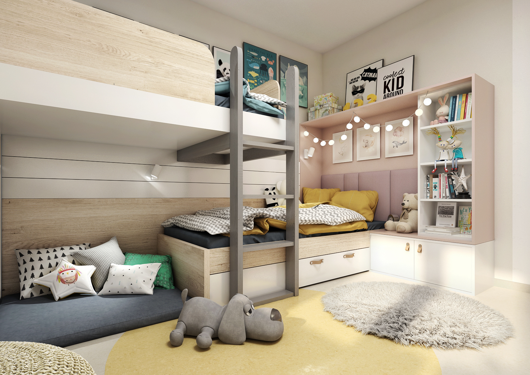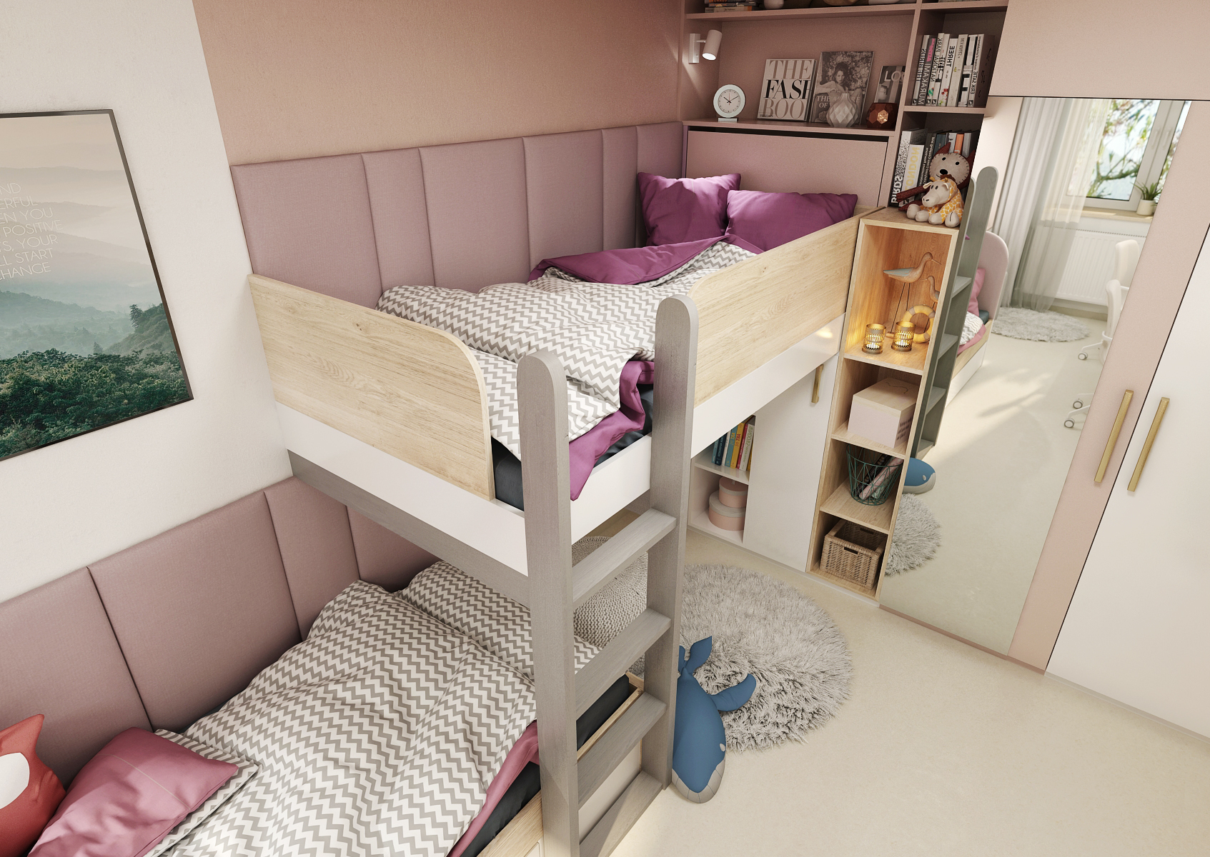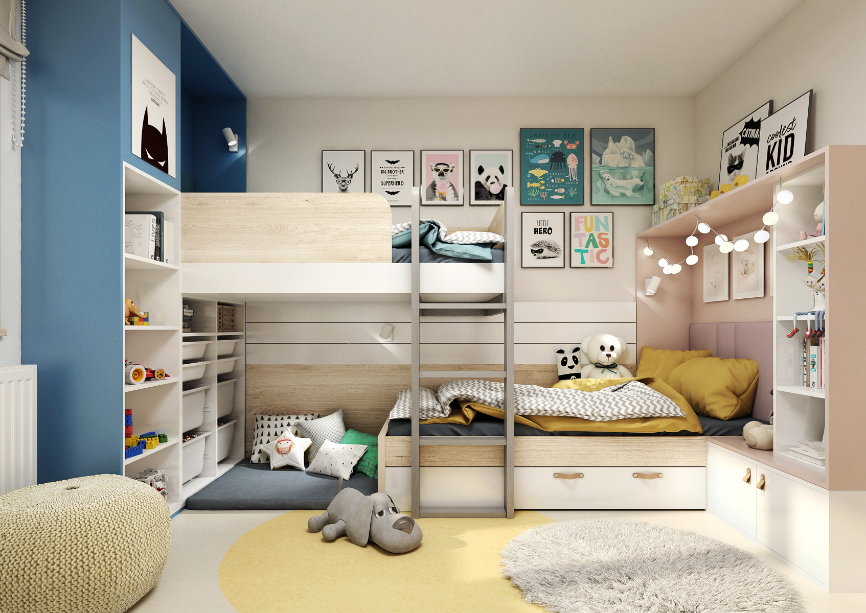 Obě varianty dětských pokojů jsou vybaveny palandami pro dvě děti. V jednom případě jde o chlapce a dívku, v tom druhém pro dvě dívky.