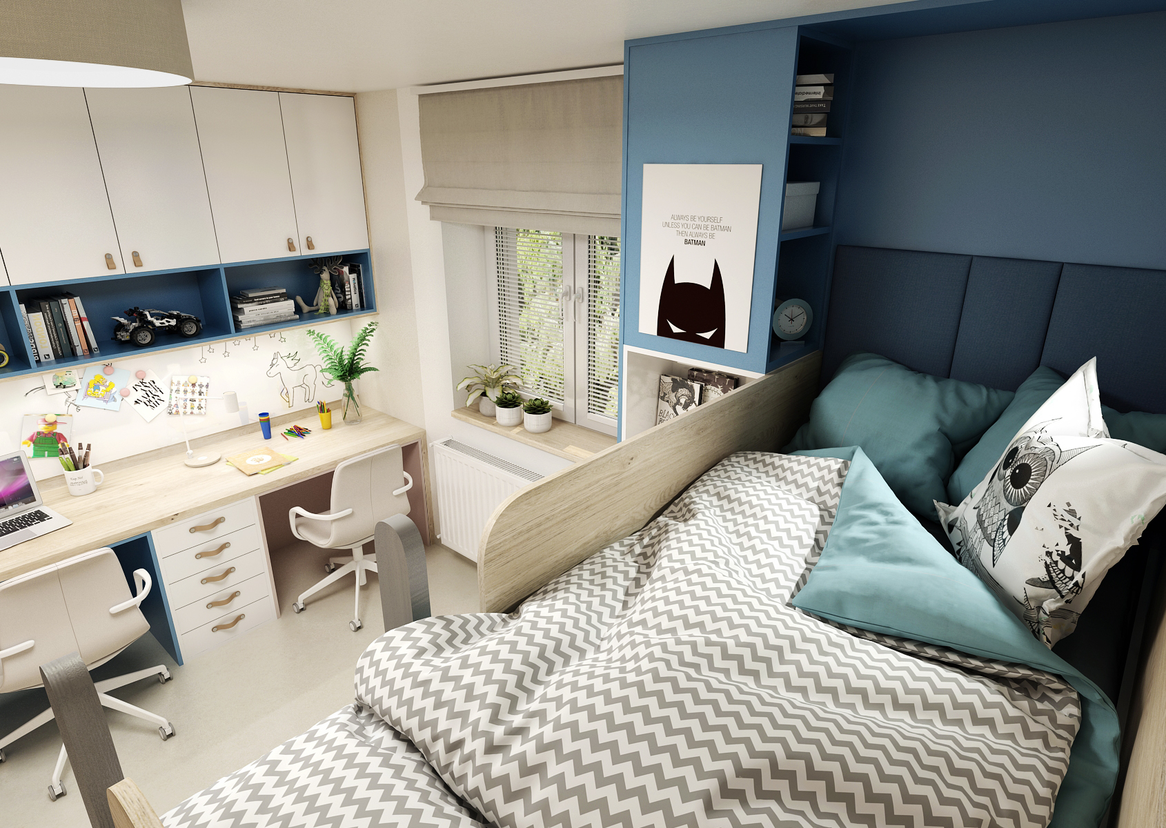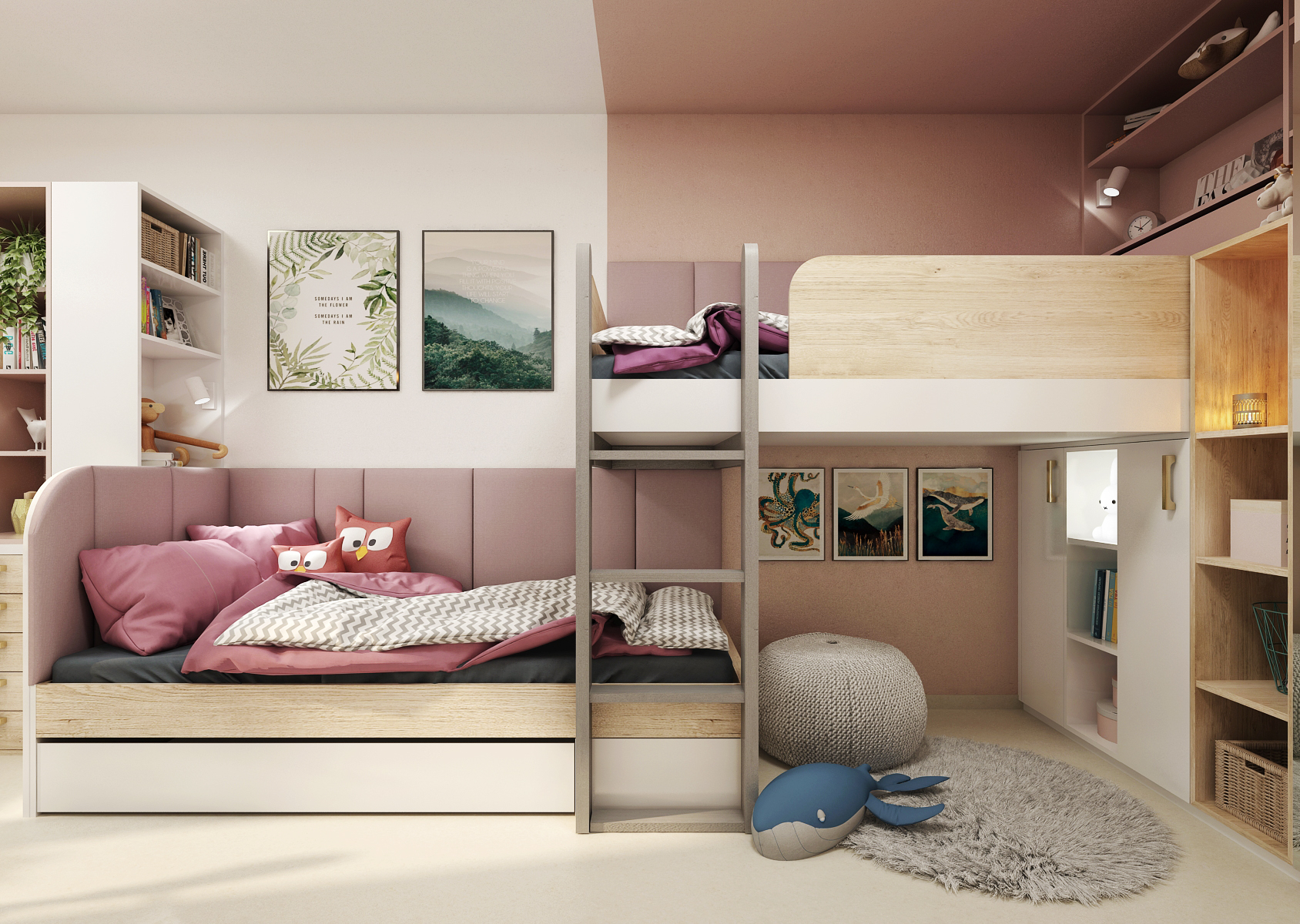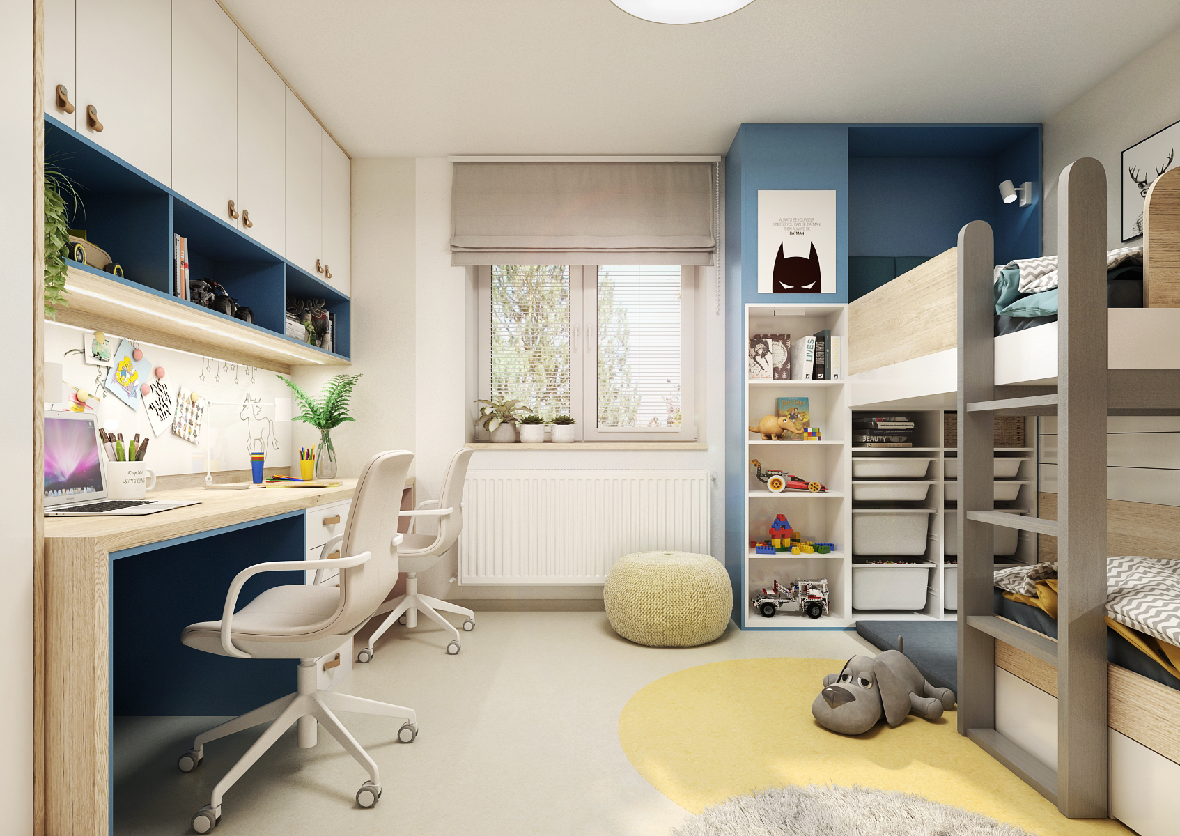 Obě varianty dětských pokojů jsou vybaveny palandami pro dvě děti. V jednom případě jde o chlapce a dívku, v tom druhém pro dvě dívky.