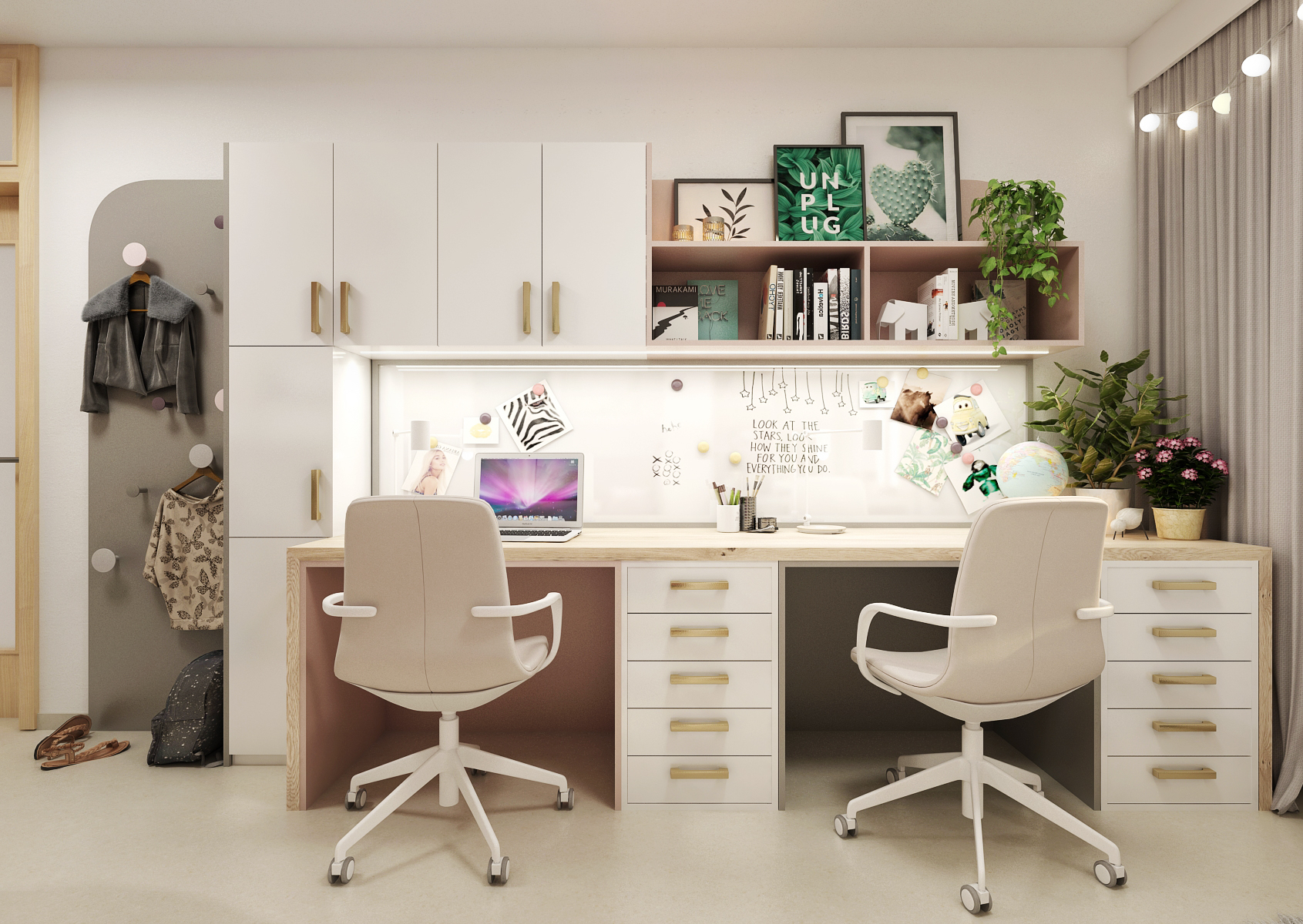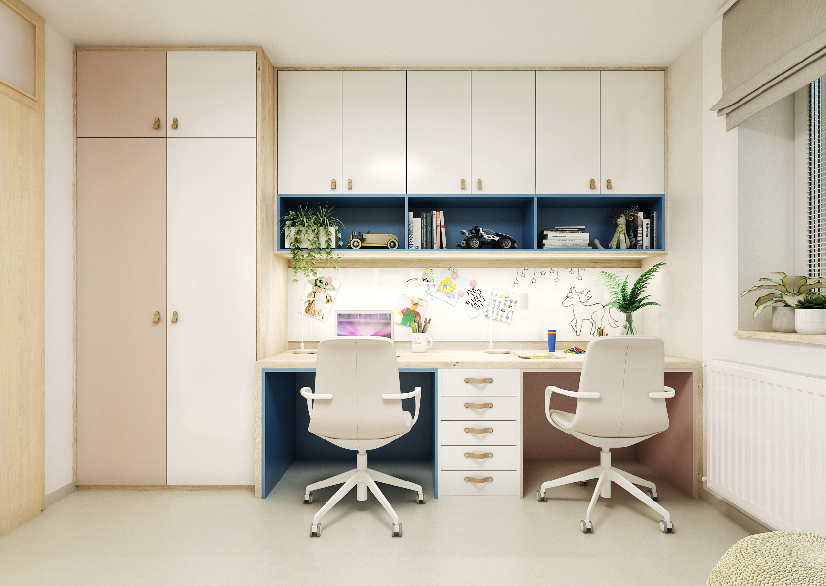První varianta dětského pokoje hraje mnoha barvami. Nejen, že je část kolem postýlky pro chlapce vymalována modře a dívčí část nese růžovou barvu, na doplňcích a bytovém textilu lze najít i odstíny žluté či zelené. Pod horním lůžkem se nachází úložný prostor s místem, které může sloužit pro relax. Psací stoly jsou zasazeny do výklenku mezi šatní skříní a horními skříňkami. Za psacím stolem se nachází magnetická fixou popisovatelná nástěnka.