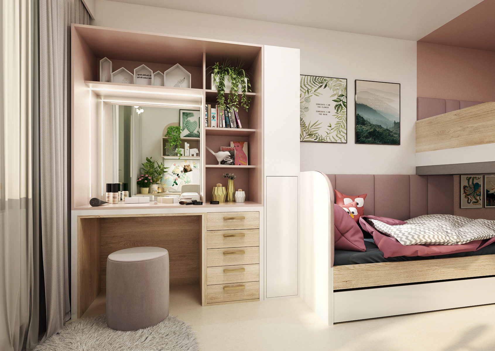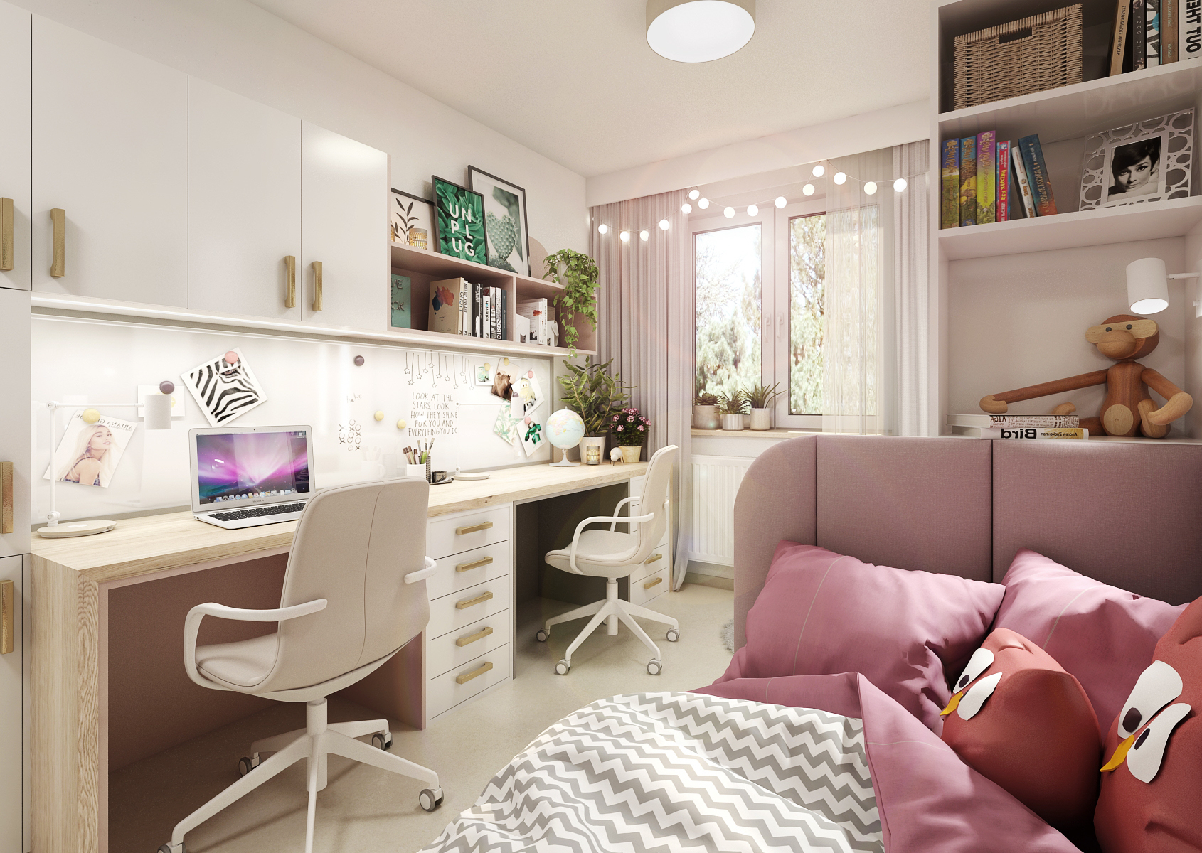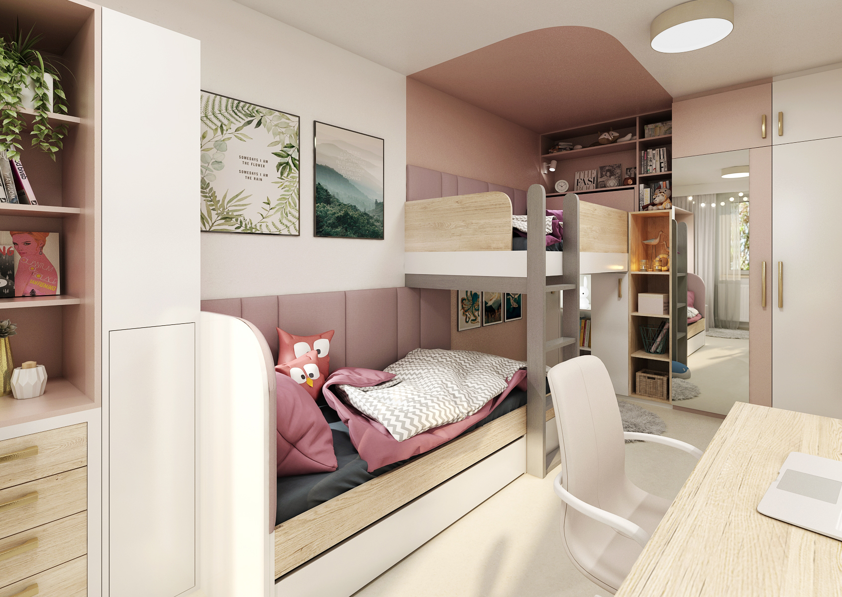 Druhý, čistě dívčí pokoj je laděn do růžovofialových odstínů, ať už jde o výmalbu či čalounění kolem postýlek. Jemný odstín růžové je znatelný i na skříňkách a bytovém textilu. K postýlkám je přistaven kosmetický stolek s taburetem a LED podsvícením u zrcadla. Jako úložný prostor zde slouží jak otevřené police, tak i šuplíky pod stolem. I zde je pod horním lůžkem prostor s otevřenou knihovnou a posezením.