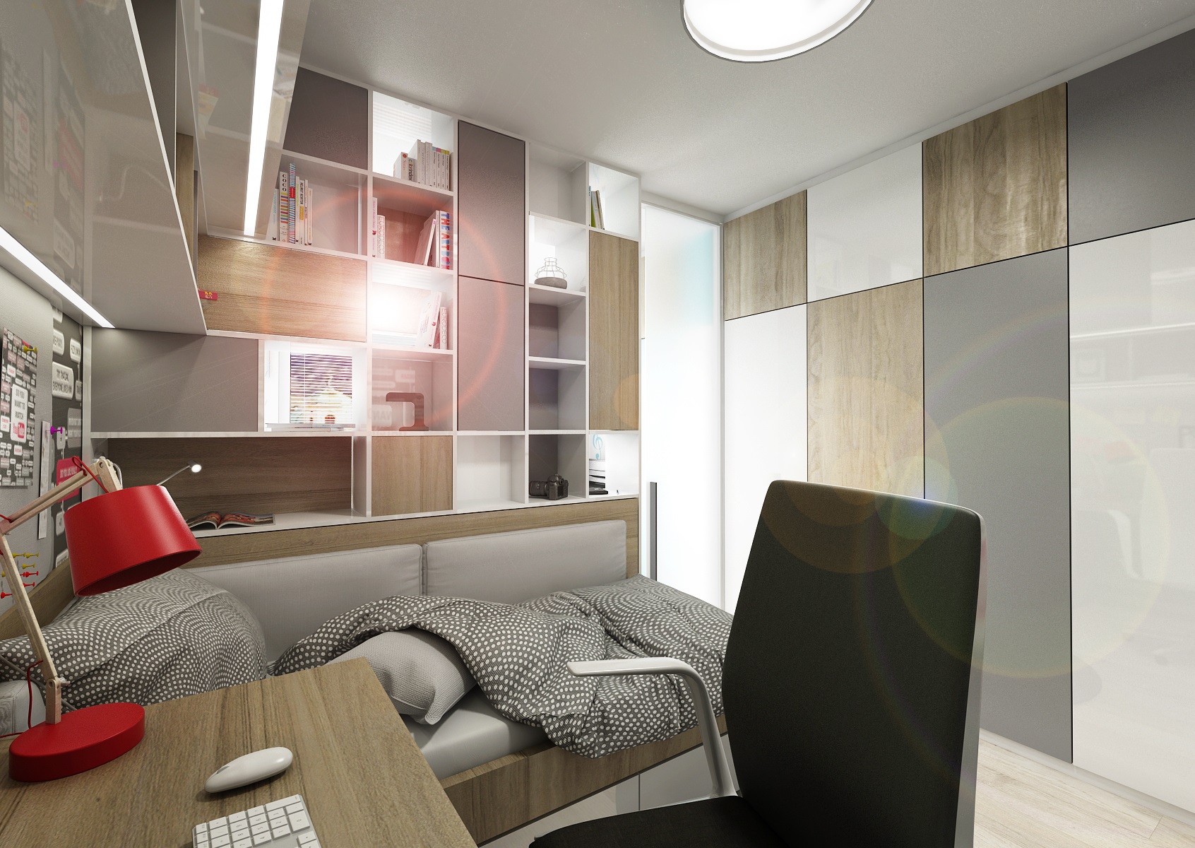Navrhnout v panelovém bytě dětský pokoj pro chlapce a dívku tak, aby oba dva měli svůj prostor a soukromí byla velká výzva…Nakonec jsme zvolili variantu, kde je úložný prostor pro šaty ve společné vestavné skříni. Jednotlivé spánkové a osobní zóny jsou odděleny společným nábytkovým předělem/knihovnou.