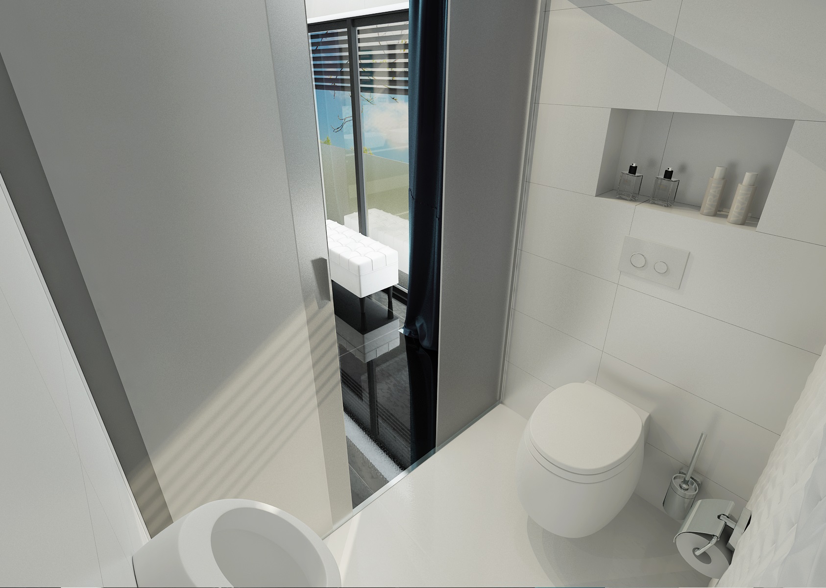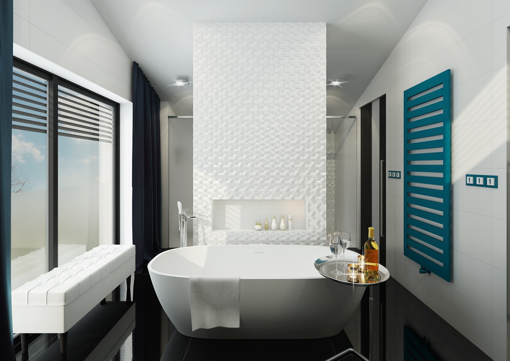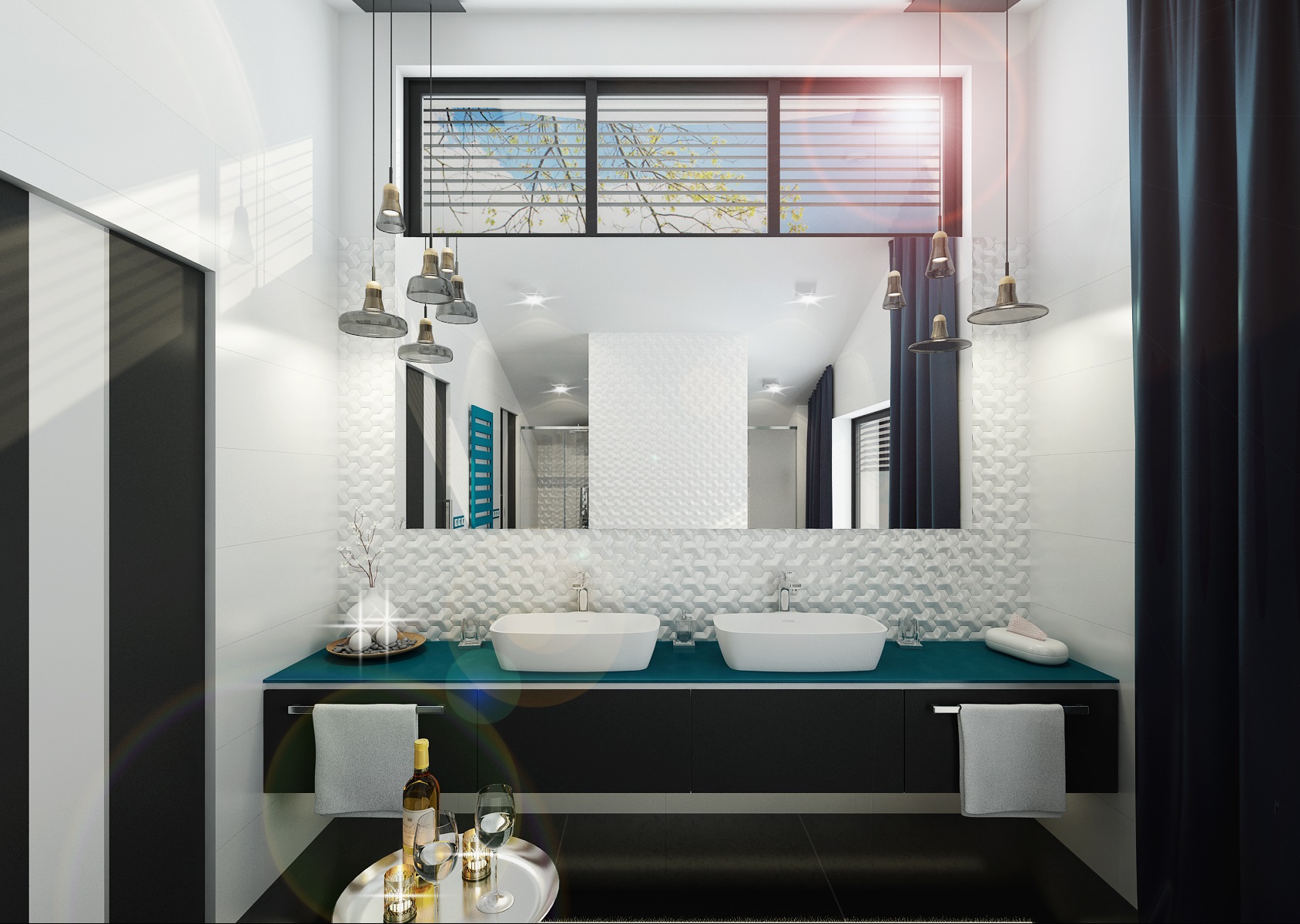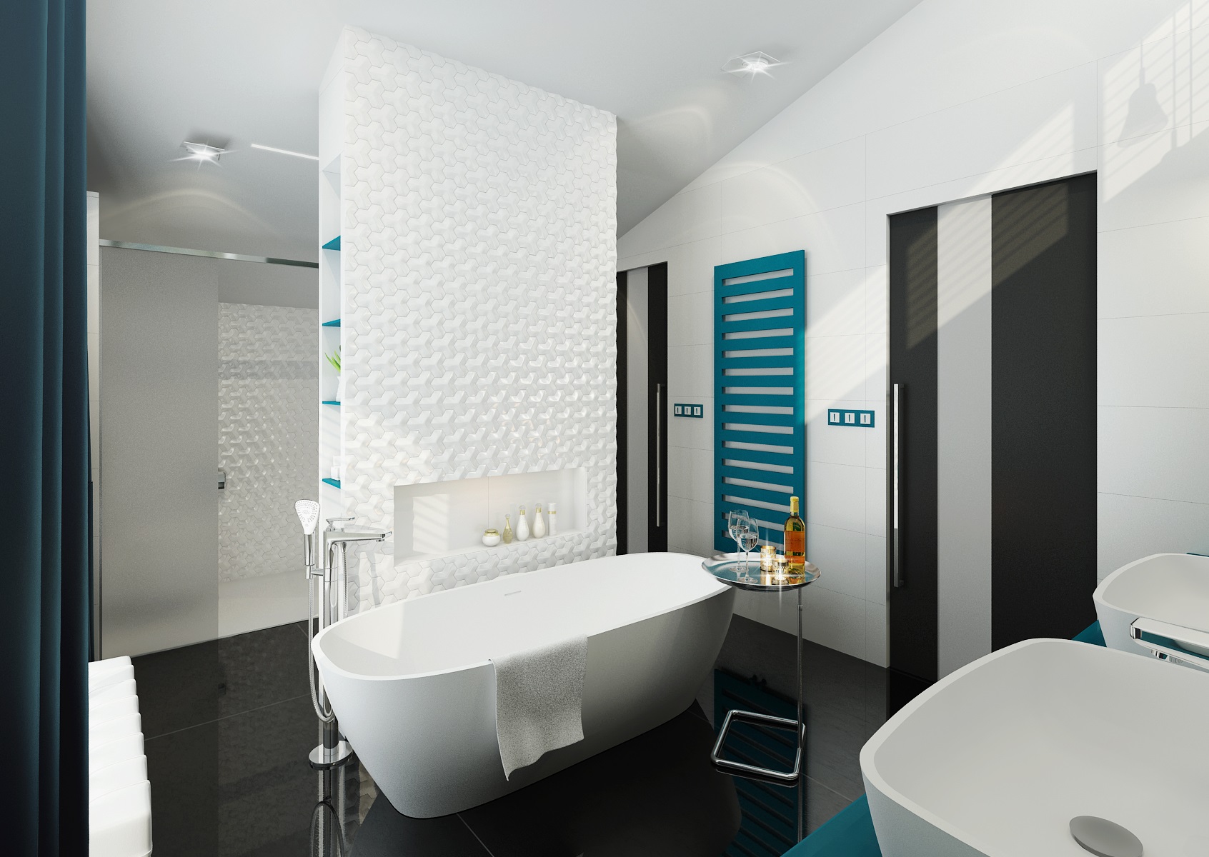 Černobílá koupelna s dlažbou a nábytkem ve vysokém lesku s výrazným akcentem tmavě tyrkysové barvy žebříkového radiátoru a skleněné desky pod umyvadly. Hlavním prvkem koupelny je však volně stojící vana a centrální příčka s 3D mozaikou. Netradičně je také vyřešeno osvětlení zrcadla u umyvadel, kde bylo zavěšeno více typů designového osvětlení.