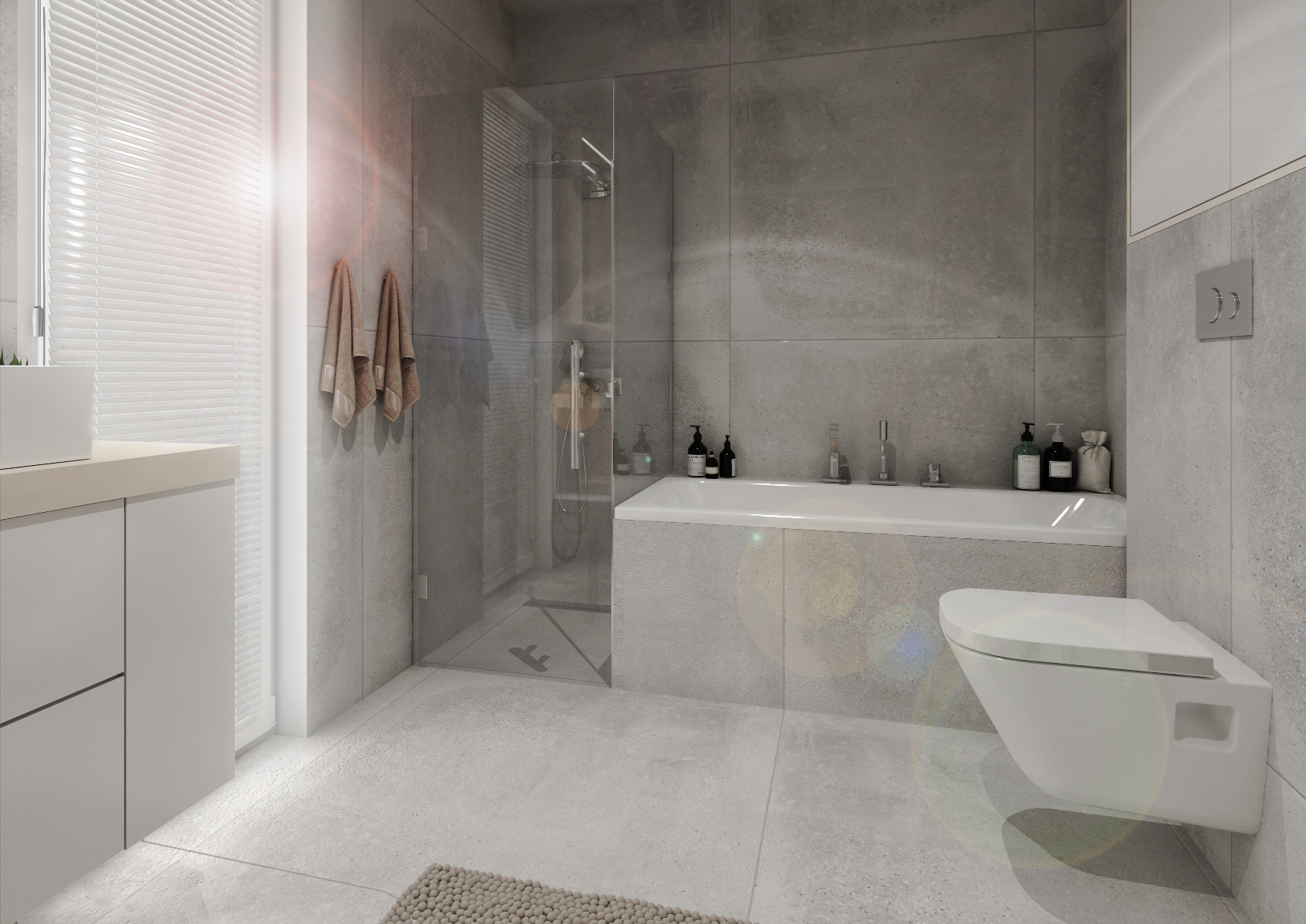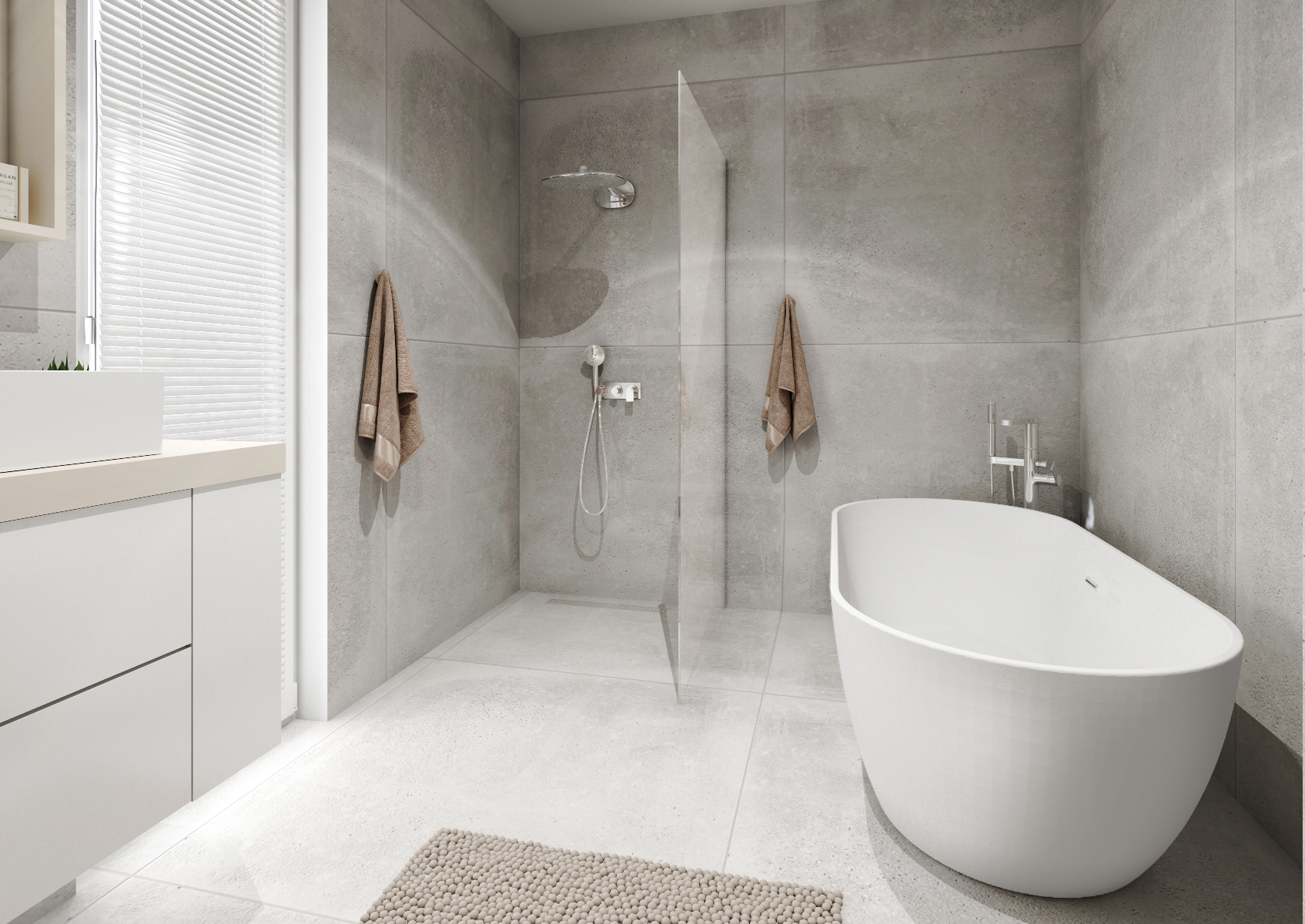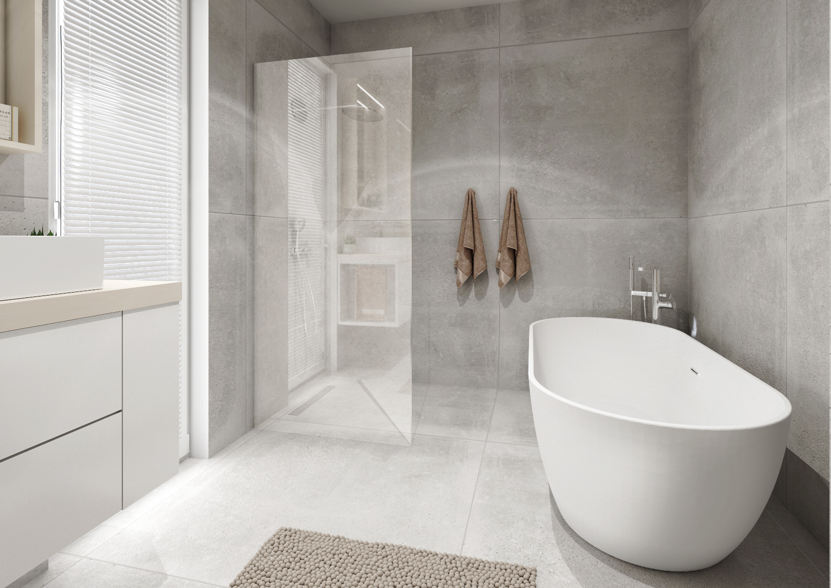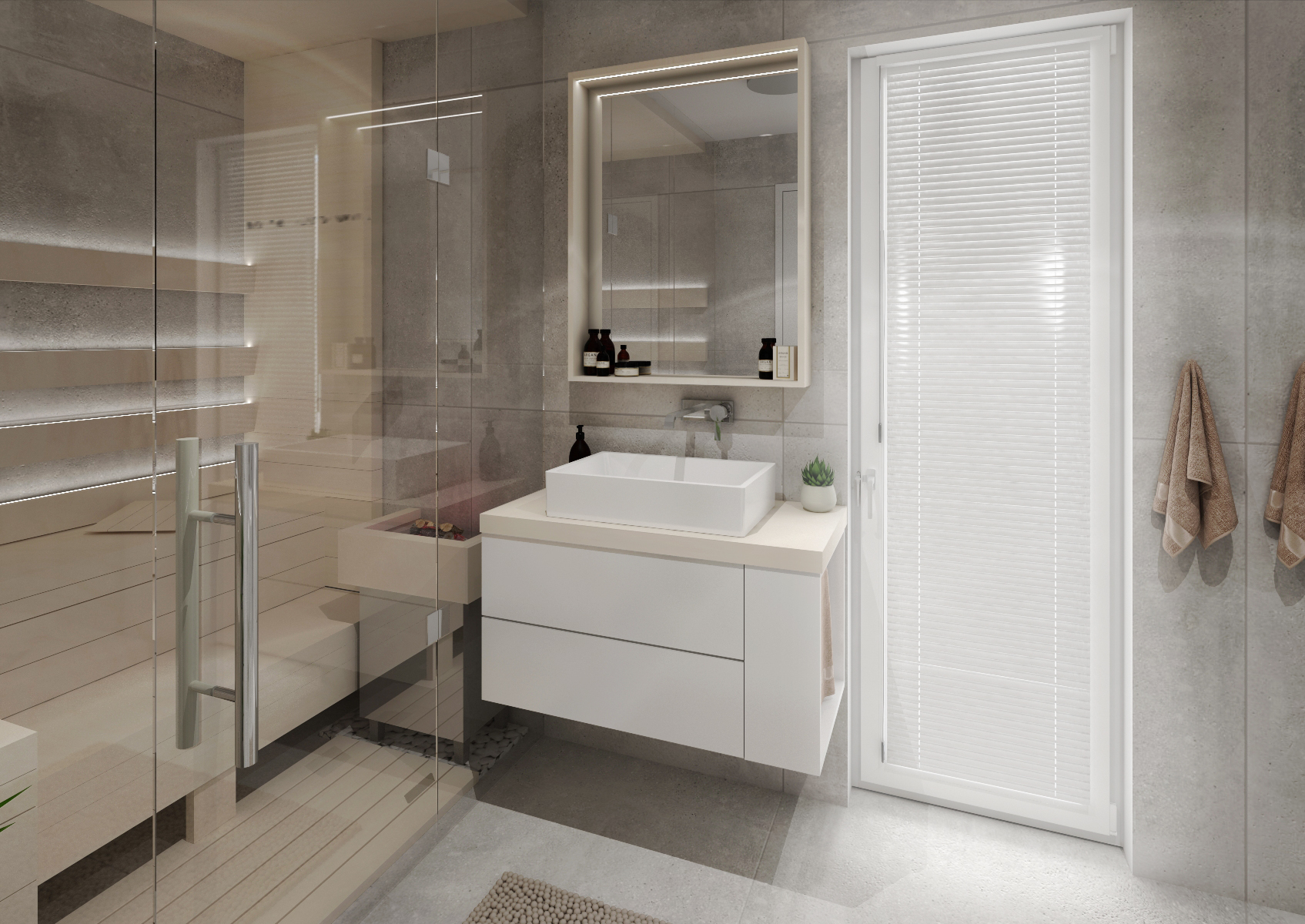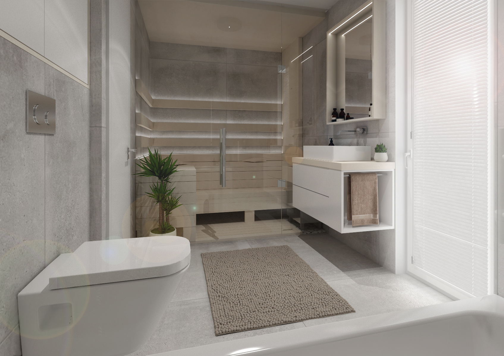 Šedý velkoformátový obklad jak na stěnách, tak i na podlaze v kombinaci se zvoleným vybavením tvoří z obyčejné koupelny luxusní domácí wellness. Dominantou interiéru je takzvaná walk-in sprcha, která je tvořena pouze dešťovým proudem a skleněnou zástěnou. Kompletně také postrádá vaničku, kterou nahrazuje odtokový žlab. Stejně tak i domácí sauna vybavená ambientním osvětlením.