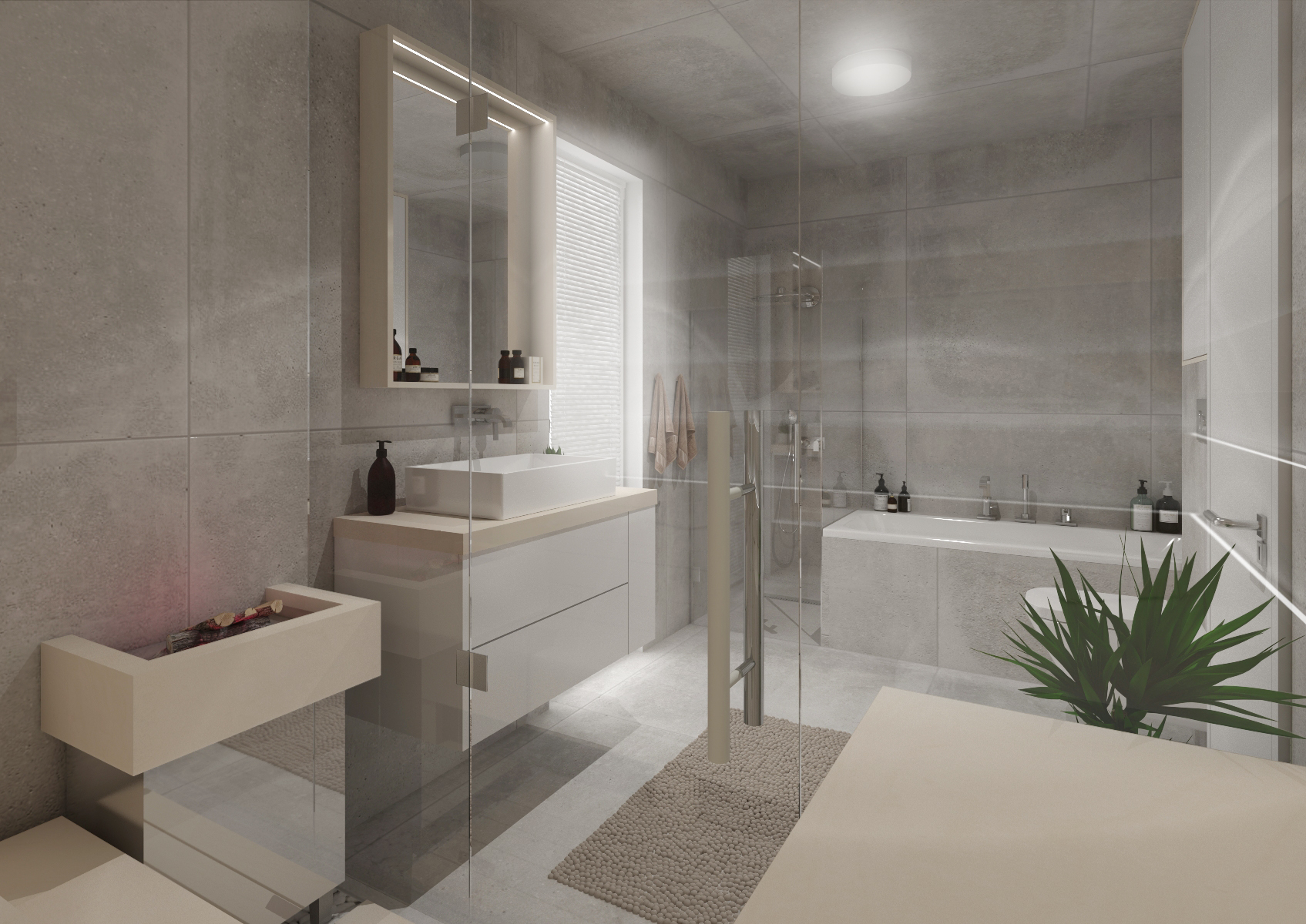 Moderní koupelna v rodinném domě je laděna do světlých tónů, které podtrhují čistotu volených materiálů.