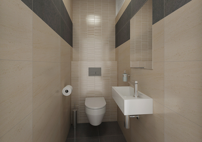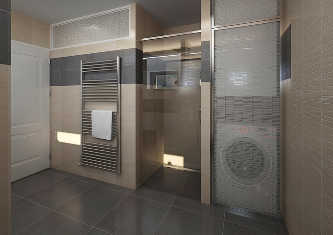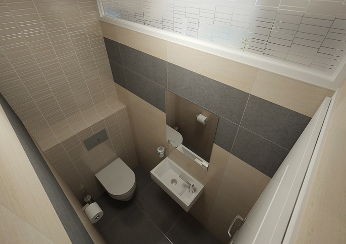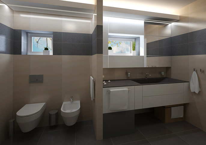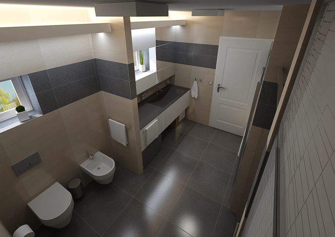 Návrh koupelny v rodinném domě v odstínech hnědé